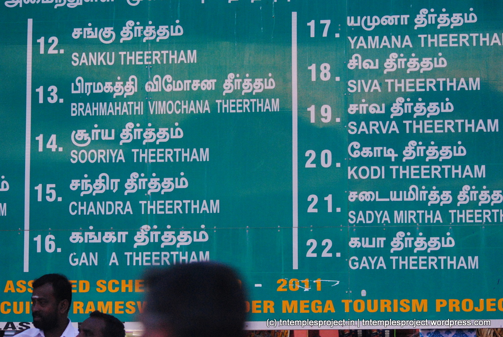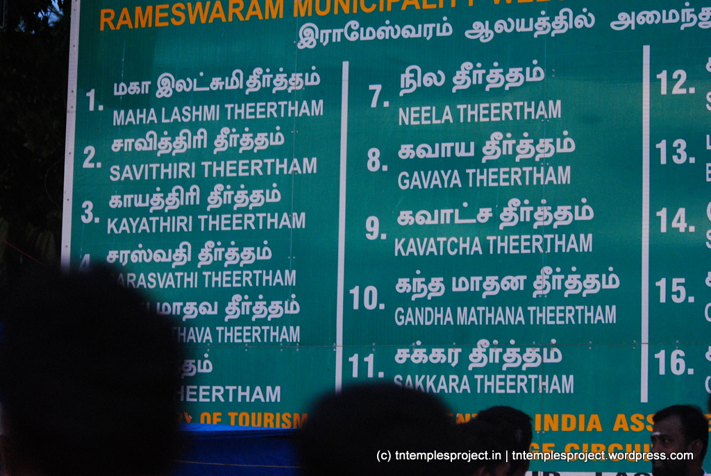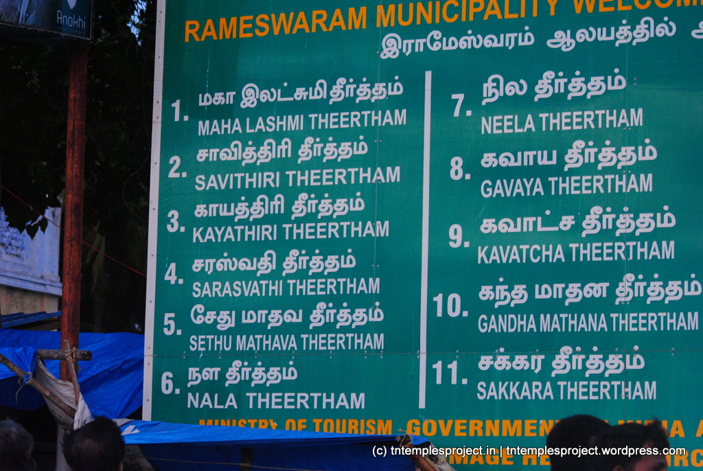 முன்பு கூறியது போல், கோவிலுக்குள் 22 தீர்த்தங்கள் உள்ளன. பக்தர்கள் முதலில் கடலில் (அக்னி தீர்த்தம்) நீராட வேண்டும், பின்னர் கோயிலின் தீர்த்தங்களில் நீராட வேண்டும்.