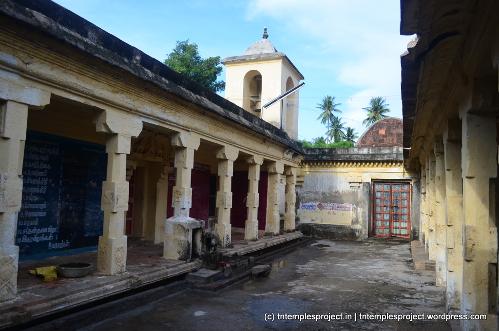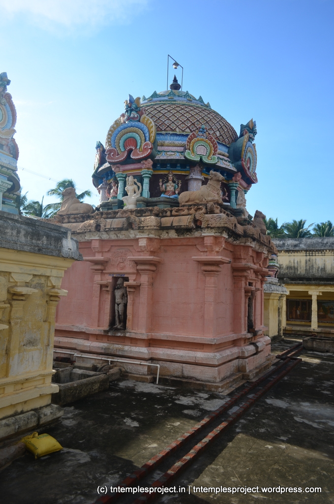 This is a Chola temple, structurally dating back to perhaps the 8th or the 9th century – this is evident from the simple pillars throughout the temple. There have been additions in the later Chola periods as well – the Veenadhara Dakshinamurti and Ardhanareeswarar in the koshtam are indications of later and more refined Chola architecture. There are also clear indications of the Thanjavur Nayaks’ influence on the temple.
