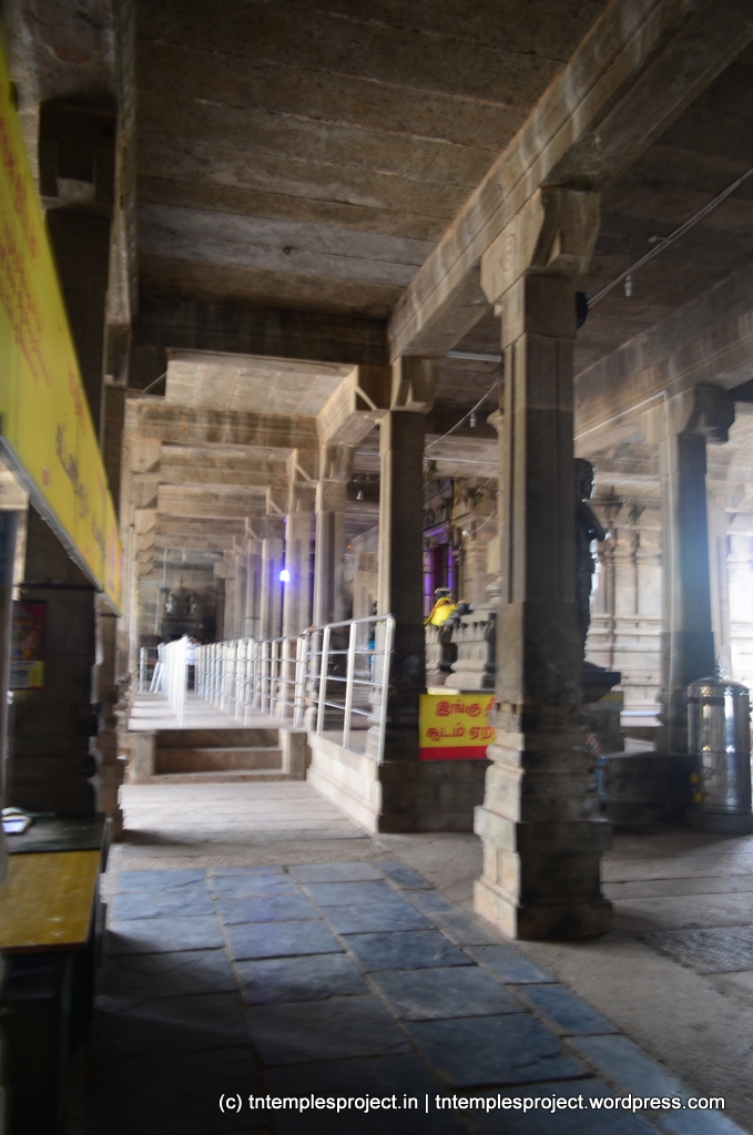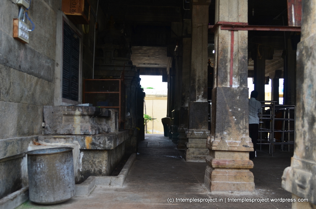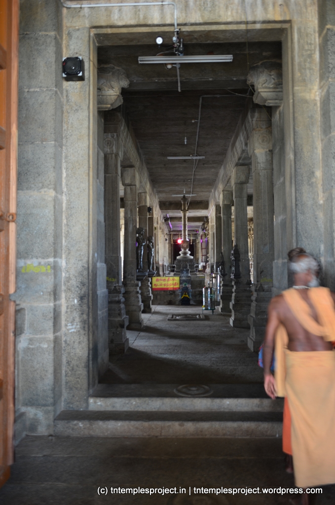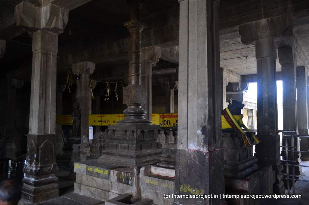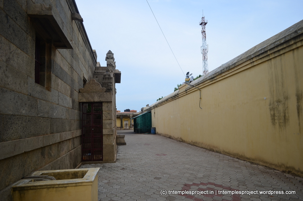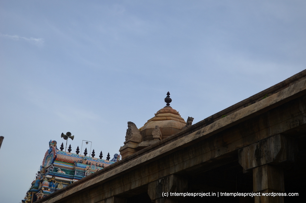 The structural temple is Chola from the 12th century, and is built completely of stone, with no plaster or other works. To the east of the temple is the Chakra Teertham, said to have been formed by Vishnu’s chakram. There are four Lingams installed in each of the cardinal directions, in addition to the moolavar Lingam. The main Nandi beside the bali peetham is made of brass, and not stone. The ceiling of the corridor outside Amman’s shrine, has a rasi-chakram depicting the 12 rasis.