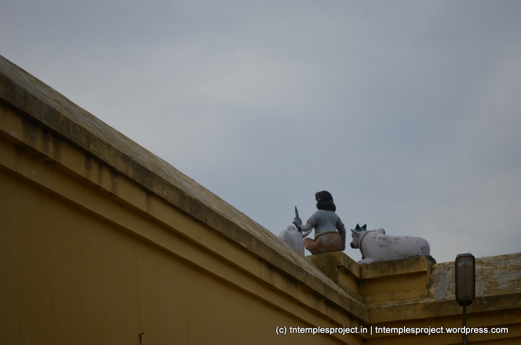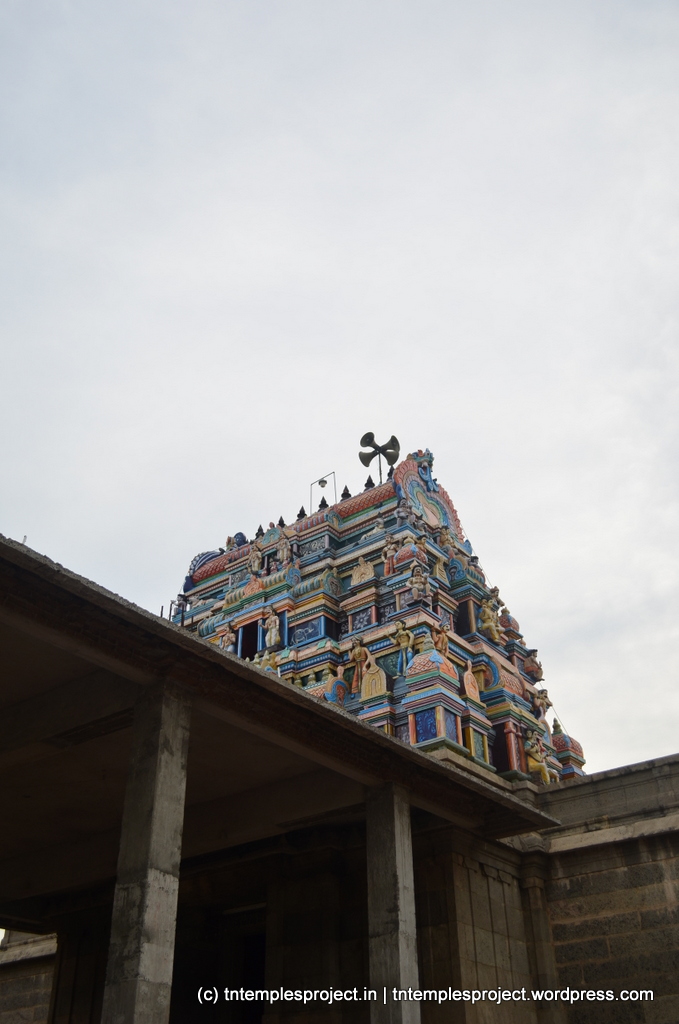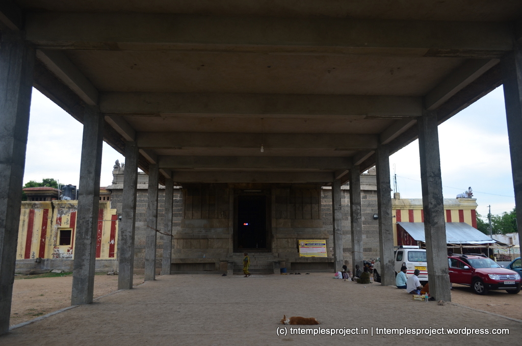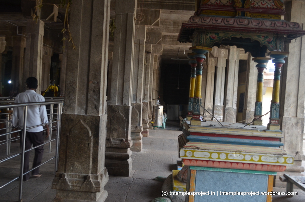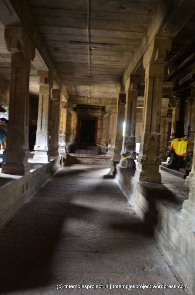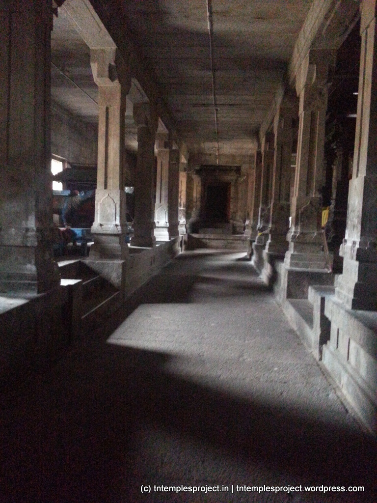 The structural temple is Chola from the 12th century, and is built completely of stone, with no plaster or other works. To the east of the temple is the Chakra Teertham, said to have been formed by Vishnu’s chakram. There are four Lingams installed in each of the cardinal directions, in addition to the moolavar Lingam. The main Nandi beside the bali peetham is made of brass, and not stone. The ceiling of the corridor outside Amman’s shrine, has a rasi-chakram depicting the 12 rasis.