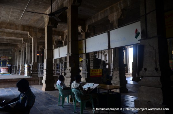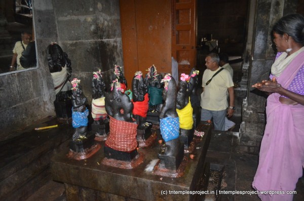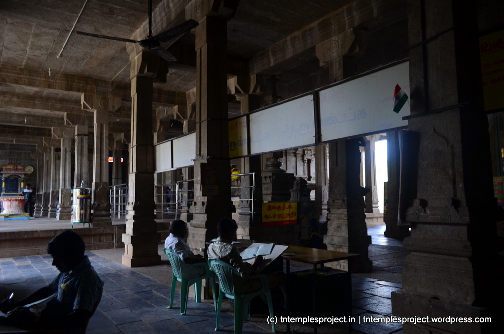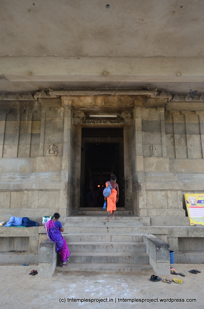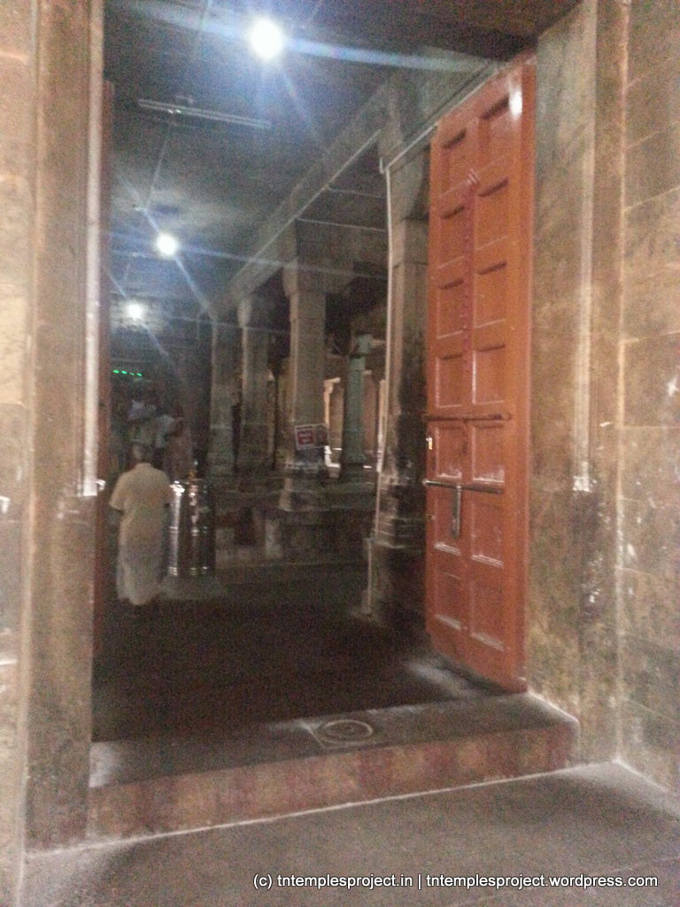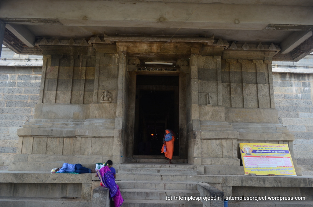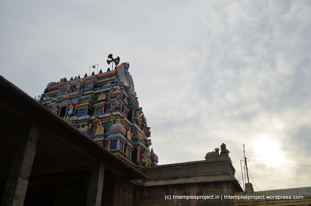The structural temple is Chola from the 12th century, and is built completely of stone, with no plaster or other works. To the east of the temple is the Chakra Teertham, said to have been formed by Vishnu’s chakram. There are four Lingams installed in each of the cardinal directions, in addition to the moolavar Lingam. The main Nandi beside the bali peetham is made of brass, and not stone. The ceiling of the corridor outside Amman’s shrine, has a rasi-chakram depicting the 12 rasis.