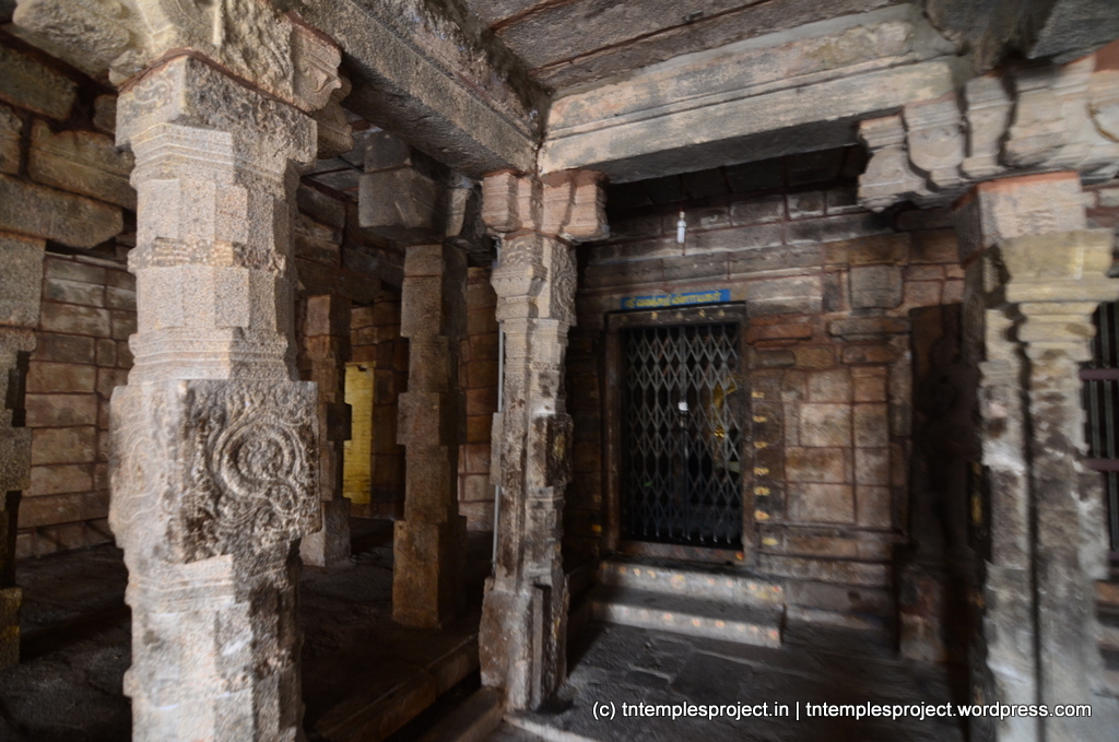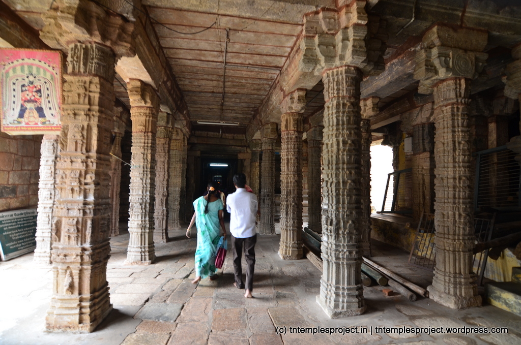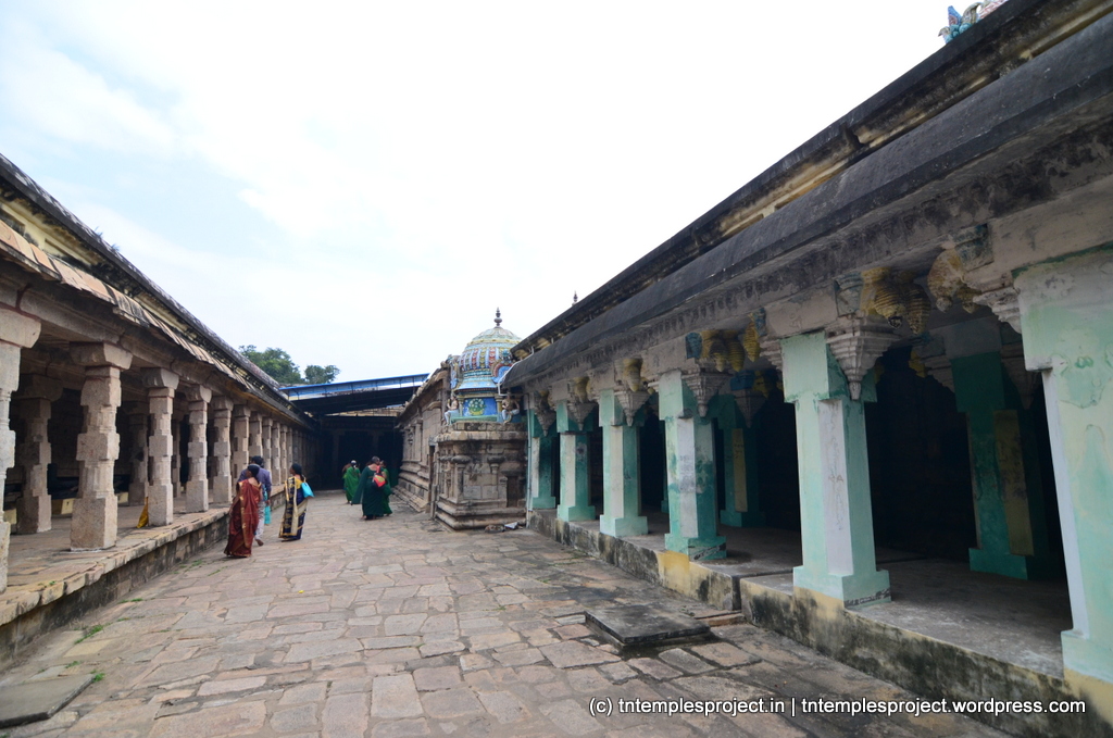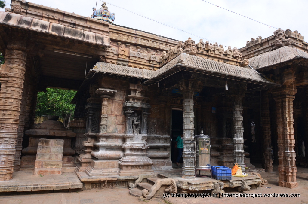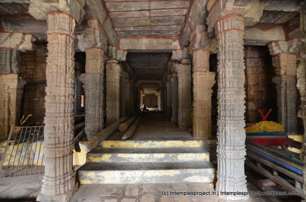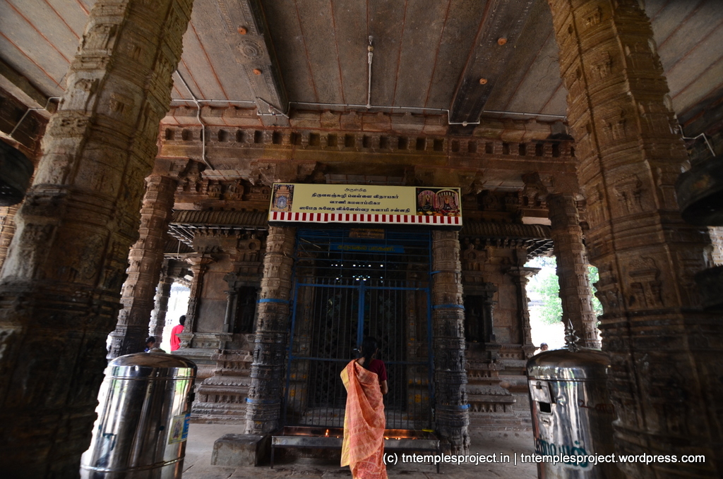 Kaveri river, which was enshrined in kamandalam of Agastyar, was liberated by Vinayakar and she started flowing towards Chola naadu. When informed of the arrival of the holy river, King Haridhwajan received her with pujas and prayers. The river took a right turn around Lord Siva, circumambulating him (valan-chuzhi) and entered a hole near the Lord (called the piladwaram). The king tried his best to block it but was unsuccessful. He took the help of sage Herandar, who took the shape of a bee as ordained by Lord Siva and blocked the hole. The Kaveri started flowing again, out of the earth. Since the Kaveri came up from here, this place is also called Melakaveri. The temple is primarily a Chola period construction, and has some beautiful architecture and intricately carved pillars and walls.