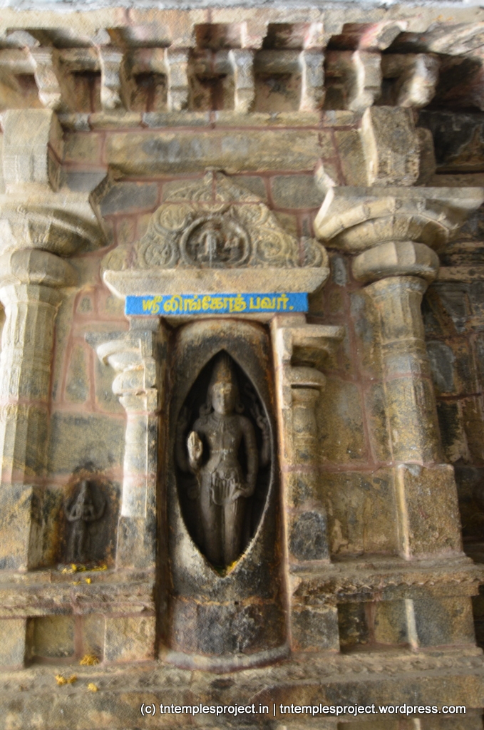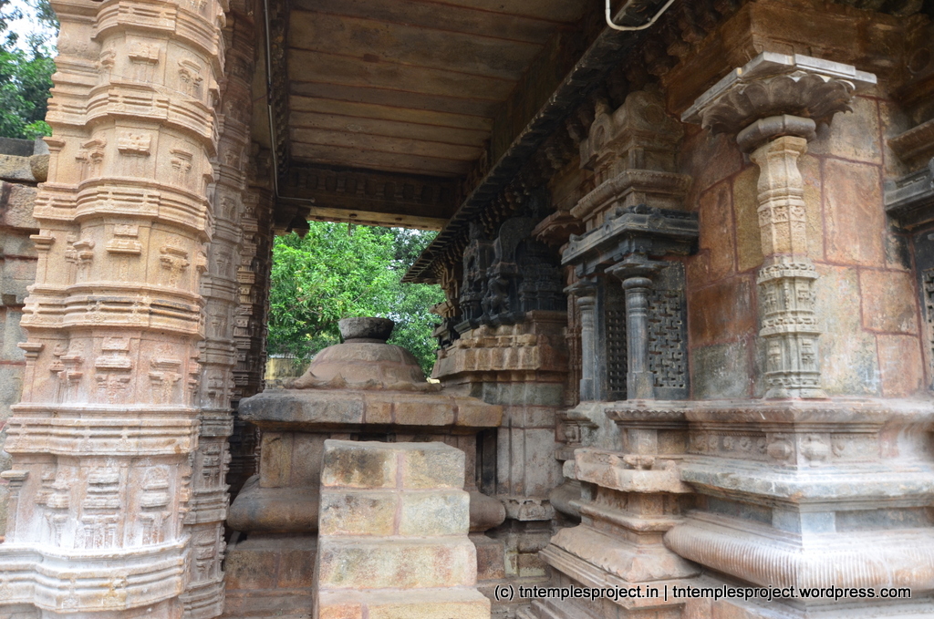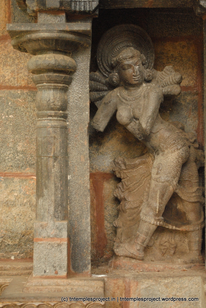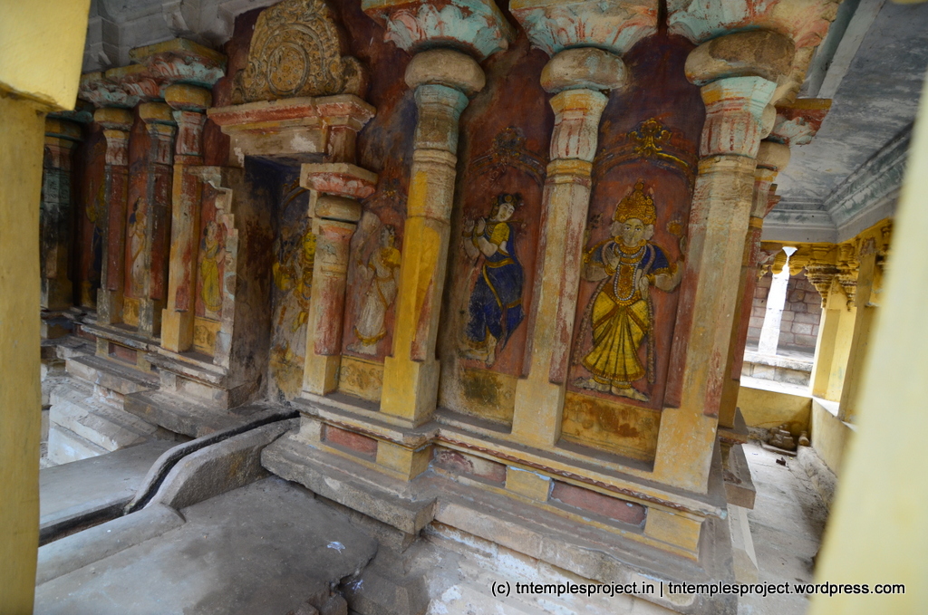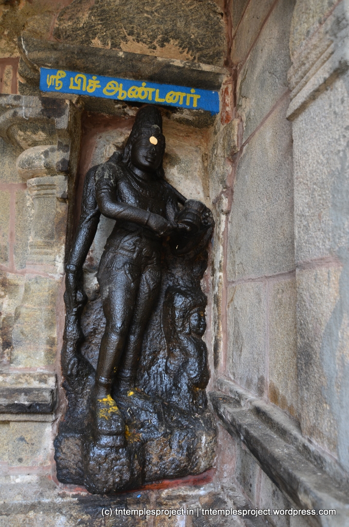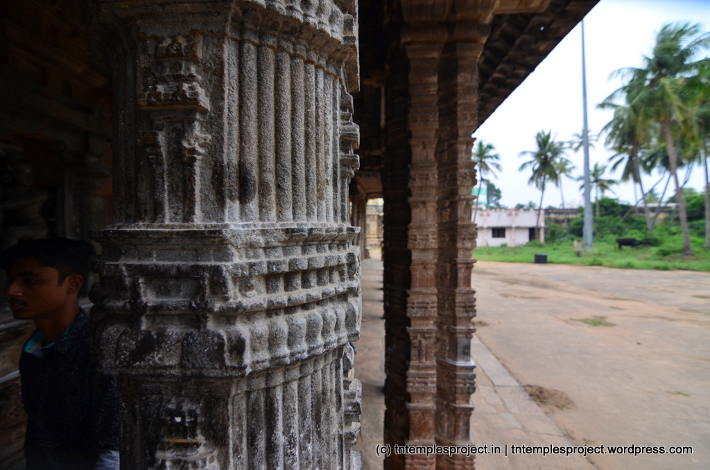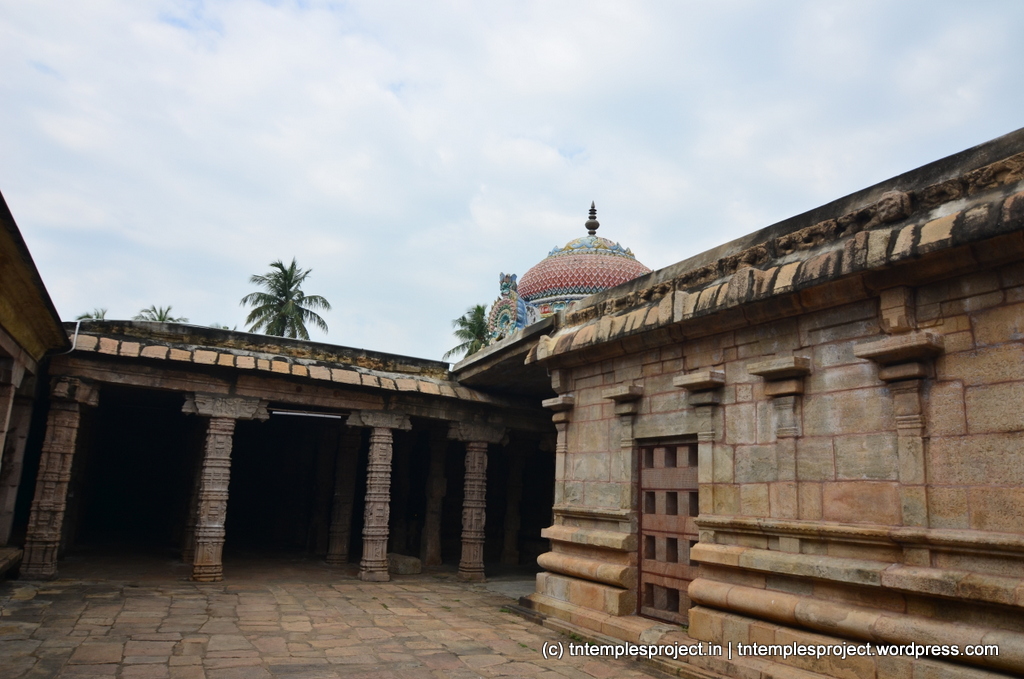 Kaveri river, which was enshrined in kamandalam of Agastyar, was liberated by Vinayakar and she started flowing towards Chola naadu. When informed of the arrival of the holy river, King Haridhwajan received her with pujas and prayers. The river took a right turn around Lord Siva, circumambulating him (valan-chuzhi) and entered a hole near the Lord (called the piladwaram). The king tried his best to block it but was unsuccessful. He took the help of sage Herandar, who took the shape of a bee as ordained by Lord Siva and blocked the hole. The Kaveri started flowing again, out of the earth. Since the Kaveri came up from here, this place is also called Melakaveri. The temple is primarily a Chola period construction, and has some beautiful architecture and intricately carved pillars and walls.