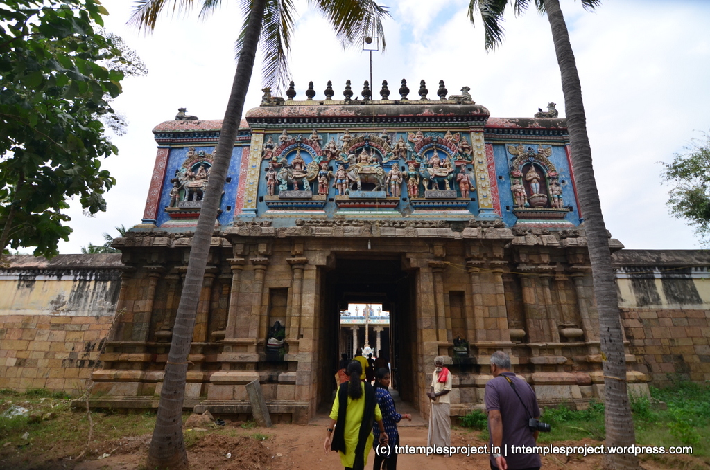 Kaveri river, which was enshrined in kamandalam of Agastyar, was liberated by Vinayakar and she started flowing towards Chola naadu. When informed of the arrival of the holy river, King Haridhwajan received her with pujas and prayers. The river took a right turn around Lord Siva, circumambulating him (valan-chuzhi) and entered a hole near the Lord (called the piladwaram). The king tried his best to block it but was unsuccessful. He took the help of sage Herandar, who took the shape of a bee as ordained by Lord Siva and blocked the hole. The Kaveri started flowing again, out of the earth. Since the Kaveri came up from here, this place is also called Melakaveri. The temple is primarily a Chola period construction, and has some beautiful architecture and intricately carved pillars and walls.