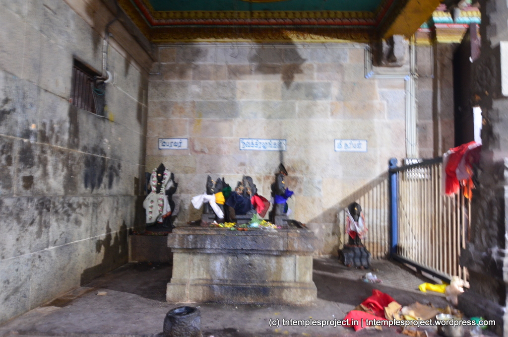 The Vinayakar in the ardha mandapam is Swarna Vinayakar, and interestingly, the Vinayakars in the southeast corner (kanni moolai) is called Kumbhakarna Vinayakar! The temple also features two Dakshinamurti murtis as well as two Ammans. The ceiling outside the Amman shrine has the 12 rasis (signs of zodiac) carved in stone, and it is believed that worshipping Amman standing under one’s own rasi will help fulfil the devotee’s wishes.