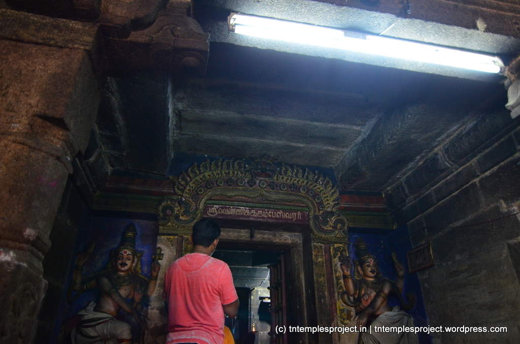 It is believed that this temple has existed across all four yugams. The banam (Lingam) at this temple appears like a bunch of sugarcane stems tied together, and the sthala puranam explains why. Once, two sages who were Siva devotees visited this place, which was full of sugarcane and Nandiyavartham (Venni in ancient Tamil) plants. Sensing the presence of Siva here, the sages went looking and found a Swambhu murti, but then started arguing about how the Lingam should be installed and what name should be given to the Lord here – since there were both sugarcane and Nandiyavartham. At that time, Siva Himself appeared and told them that He would be covered by the sugarcane, which would also be his name, and that the Nandiyavartham plant would be the sthala vriksham. This is why the Lord here is named Karumbeswarar (karumbu in Tamil is sugarcane). Worshipping Siva here gives one all the sweetness of His grace, and so He is also called Rasapureeswarar (Rasa is extract, in this case of the sugarcane).