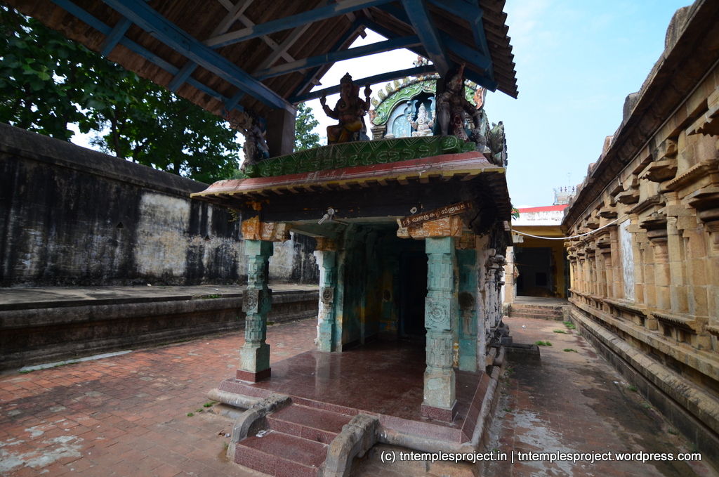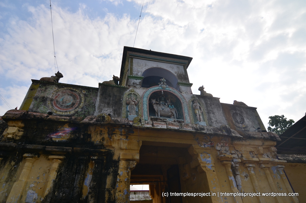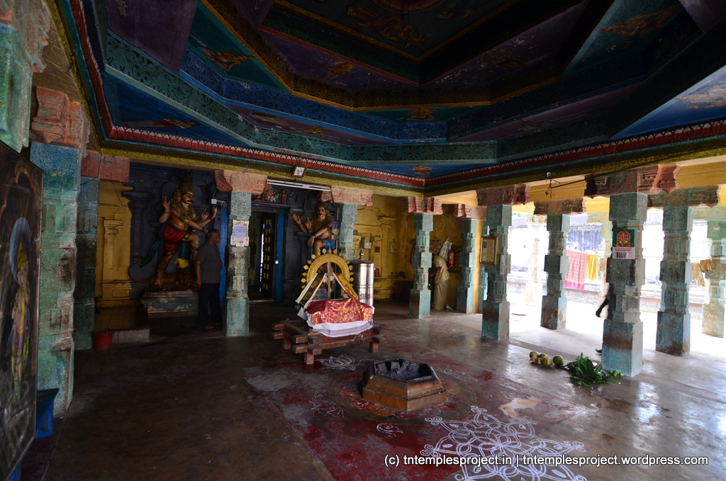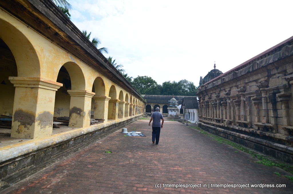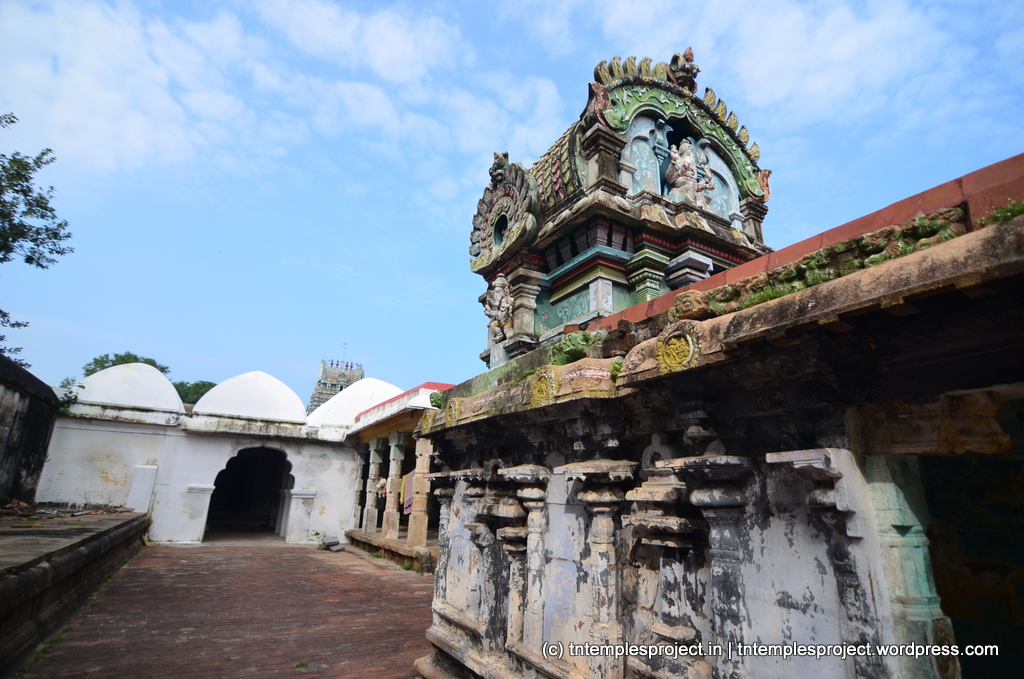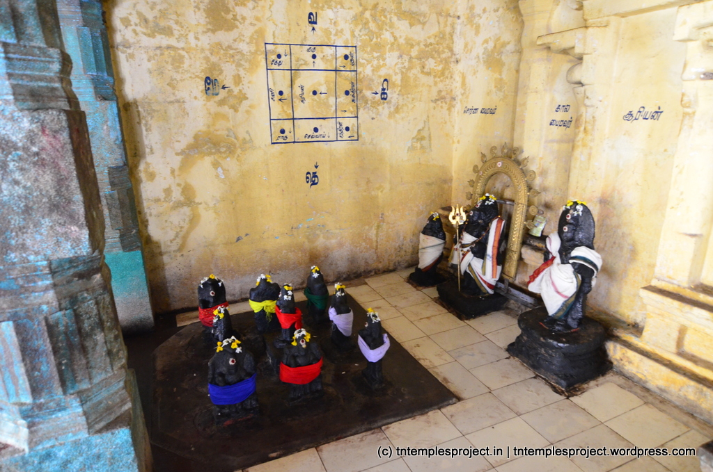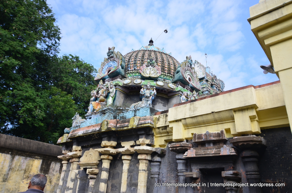 This temple is considered to be one of the 78 maadakoils built by Kochchenga Cholan, although from the outside, it seems to lack the elevated platform that is unique to maadakoils. The structural temple here is medieval and later Chola, and there are inscriptions referring to Kulothunga Chola III and Raja Raja Chola III. The mandapam in the temple is believed to be the hall where Siva and Vishnu played their game of chokkattan, and this puranam is depicted beautifully through paintings in the mandapam. The temple also has separate shrines for Agastyar and Kaveri river. Dakshinamurti here is called Medha Dakshinamurti. The temple also features a unique Navagraham arrangement – all the planets are seen facing Suryan, who is himself facing west rather than east.