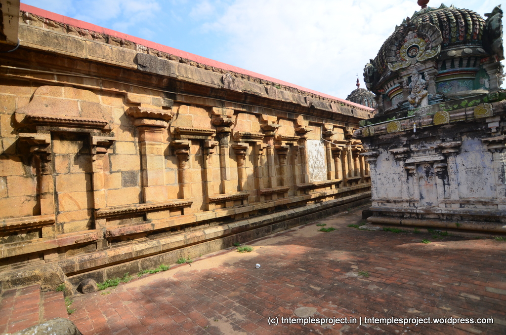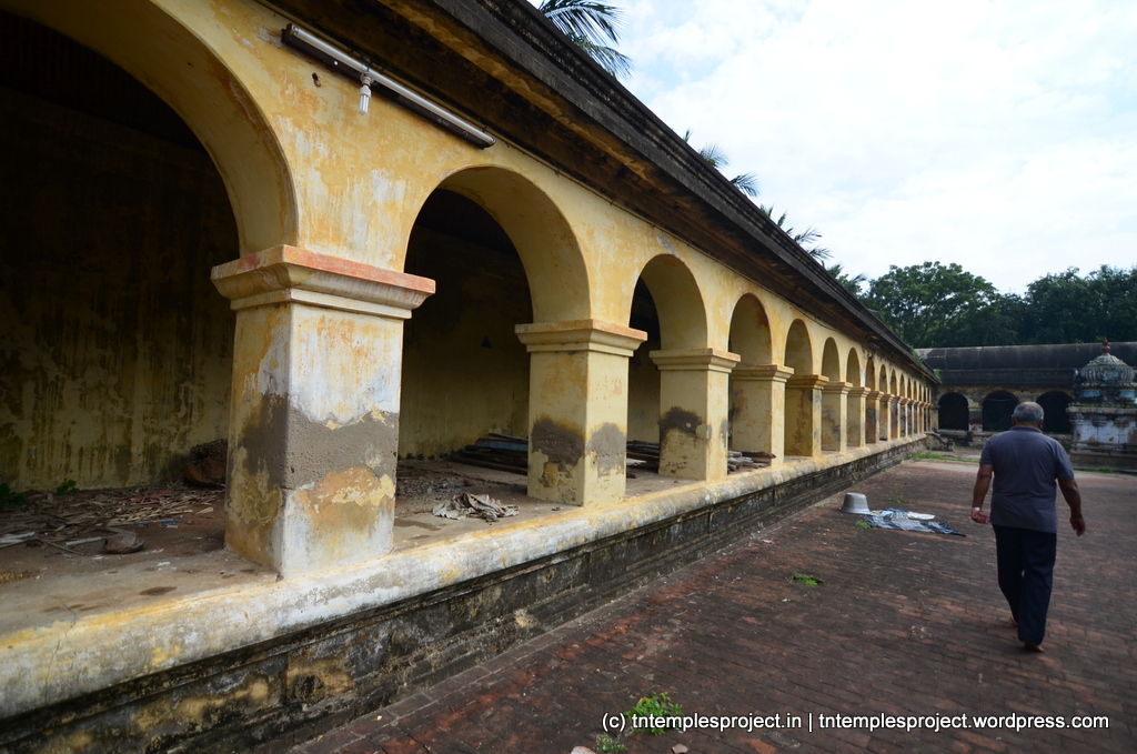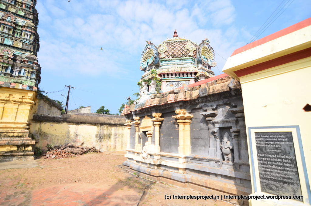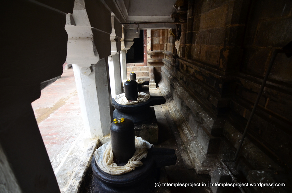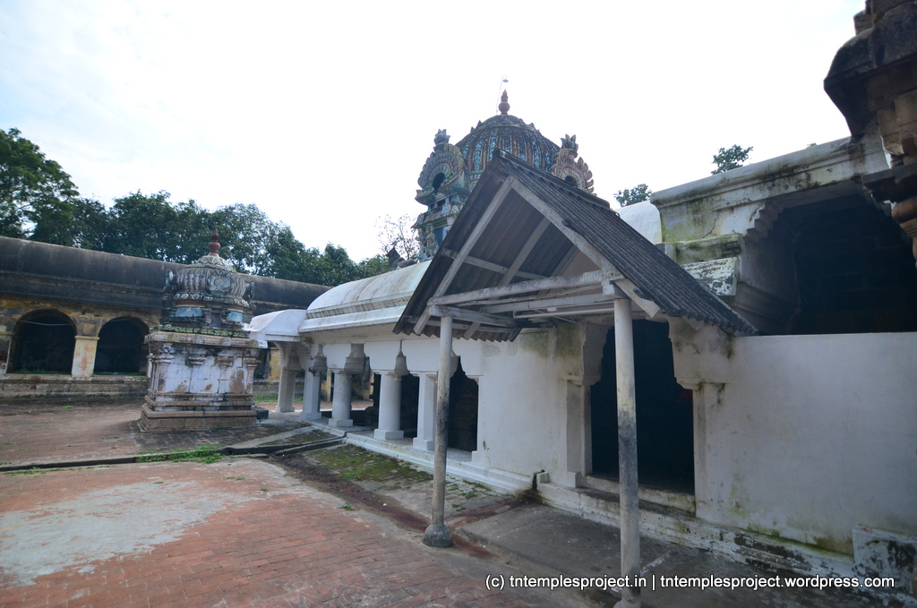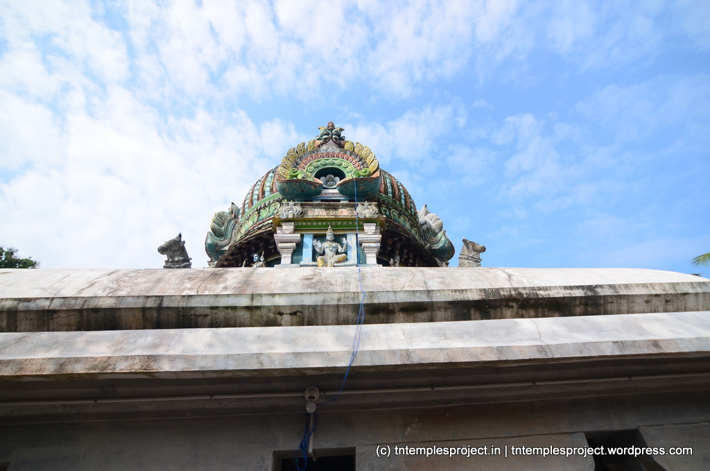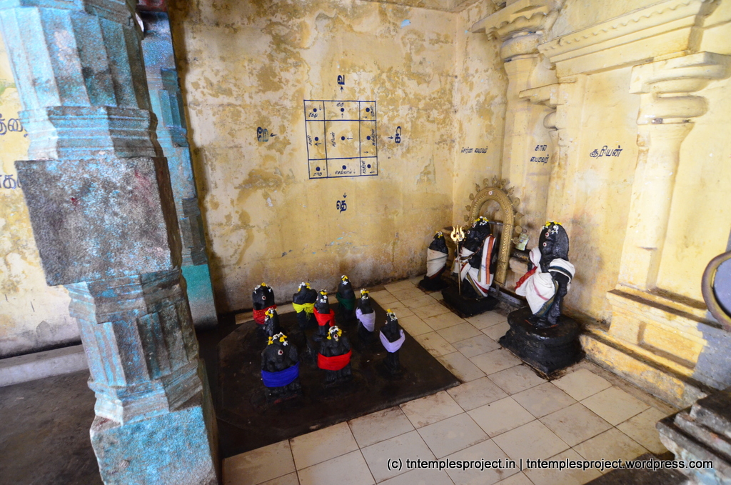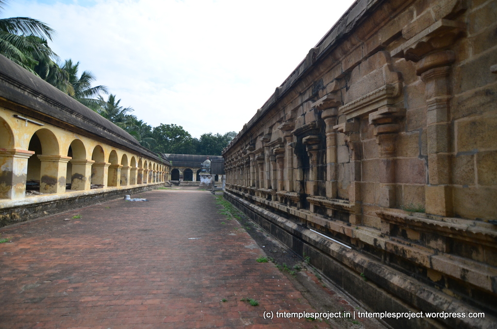 This temple is considered to be one of the 78 maadakoils built by Kochchenga Cholan, although from the outside, it seems to lack the elevated platform that is unique to maadakoils. The structural temple here is medieval and later Chola, and there are inscriptions referring to Kulothunga Chola III and Raja Raja Chola III. The mandapam in the temple is believed to be the hall where Siva and Vishnu played their game of chokkattan, and this puranam is depicted beautifully through paintings in the mandapam. The temple also has separate shrines for Agastyar and Kaveri river. Dakshinamurti here is called Medha Dakshinamurti. The temple also features a unique Navagraham arrangement – all the planets are seen facing Suryan, who is himself facing west rather than east.