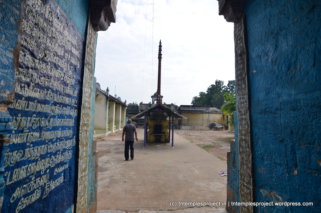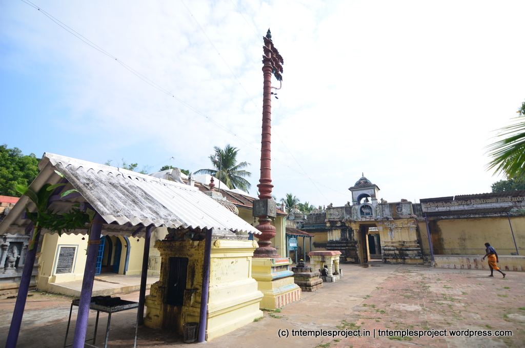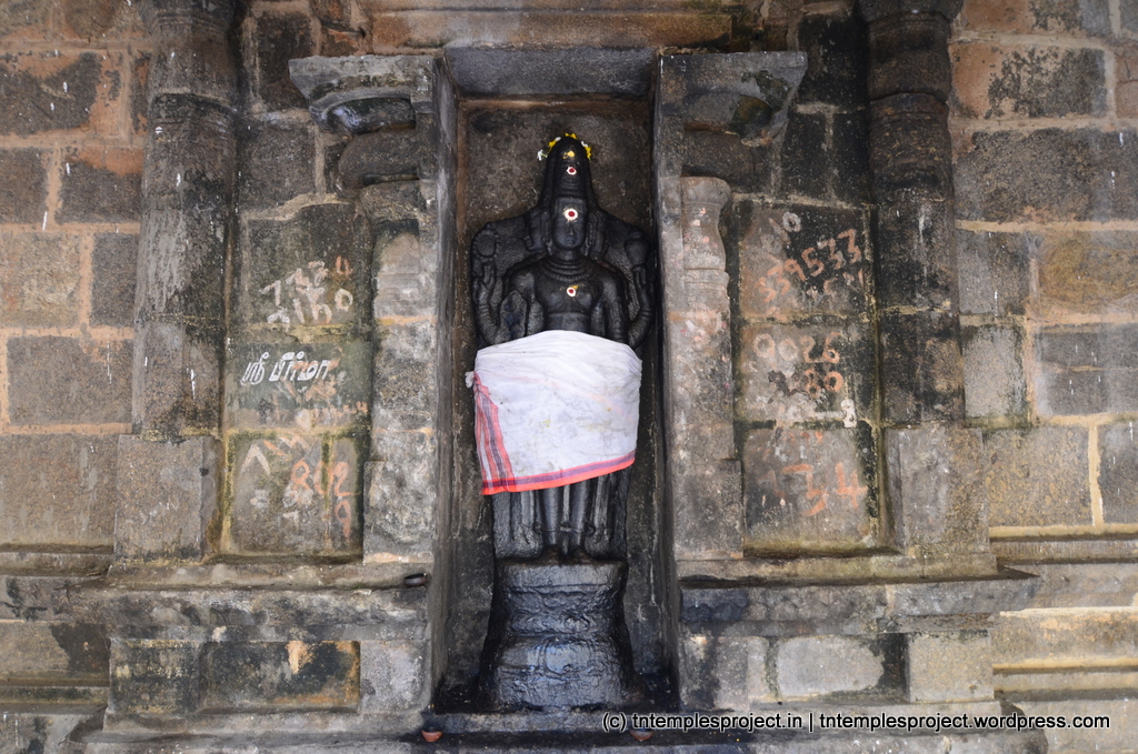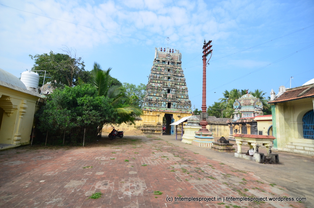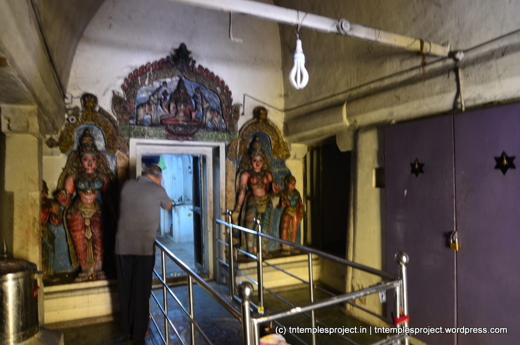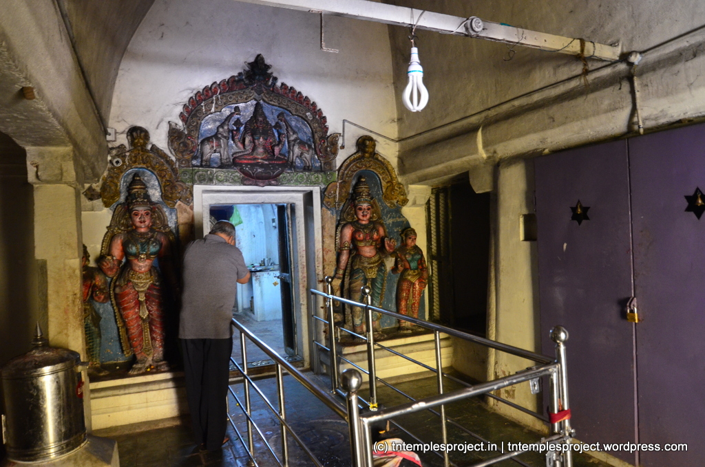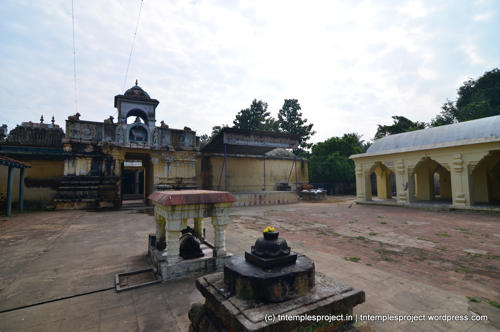 This temple is considered to be one of the 78 maadakoils built by Kochchenga Cholan, although from the outside, it seems to lack the elevated platform that is unique to maadakoils. The structural temple here is medieval and later Chola, and there are inscriptions referring to Kulothunga Chola III and Raja Raja Chola III. The mandapam in the temple is believed to be the hall where Siva and Vishnu played their game of chokkattan, and this puranam is depicted beautifully through paintings in the mandapam. The temple also has separate shrines for Agastyar and Kaveri river. Dakshinamurti here is called Medha Dakshinamurti. The temple also features a unique Navagraham arrangement – all the planets are seen facing Suryan, who is himself facing west rather than east.