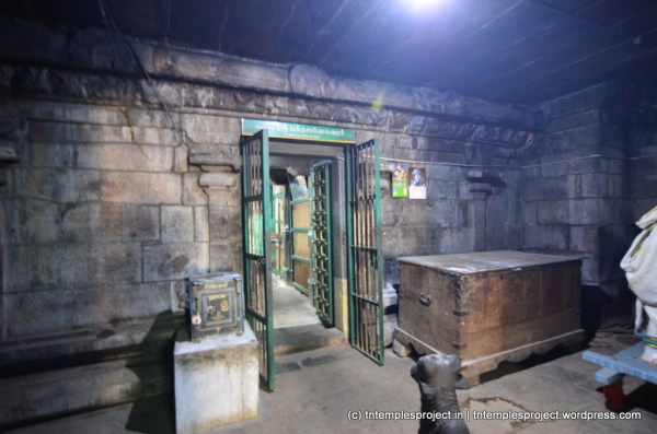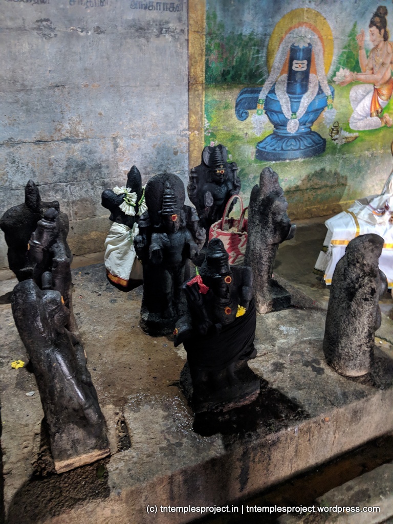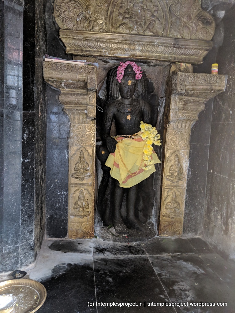 This temple also features some interesting iconography. Unusually, Suryan who normally faces east, faces Lord Siva in the west at this temple. Dakshinamurti is depicted standing, with scriptures in one hand, and His right hand is placed on a rishabham behind. Amman in seen in a state of dhyanam, but with her hair untied.