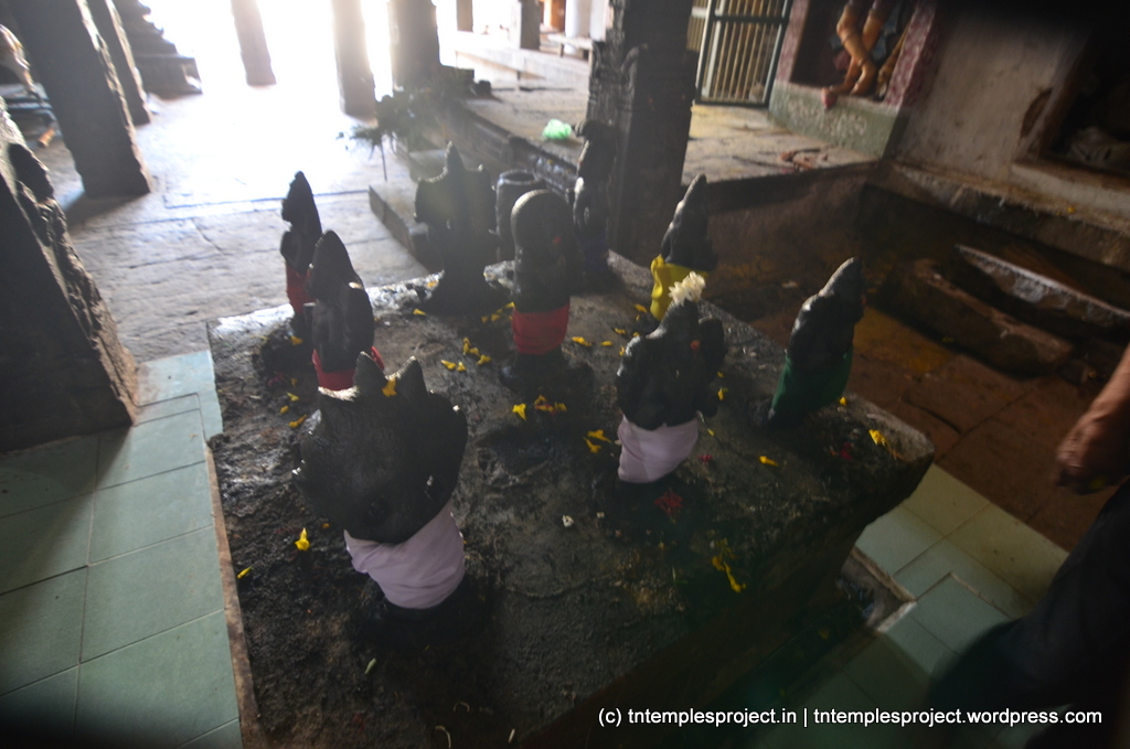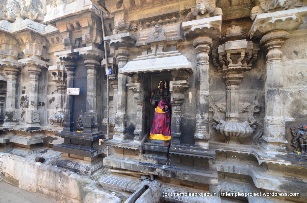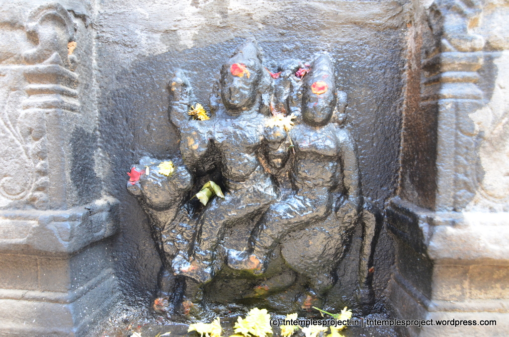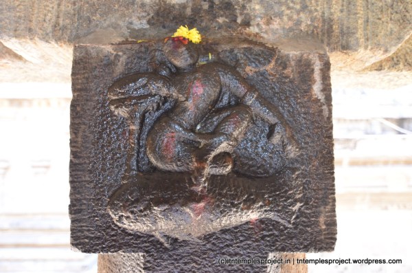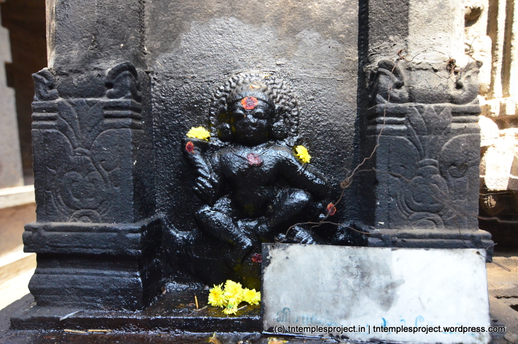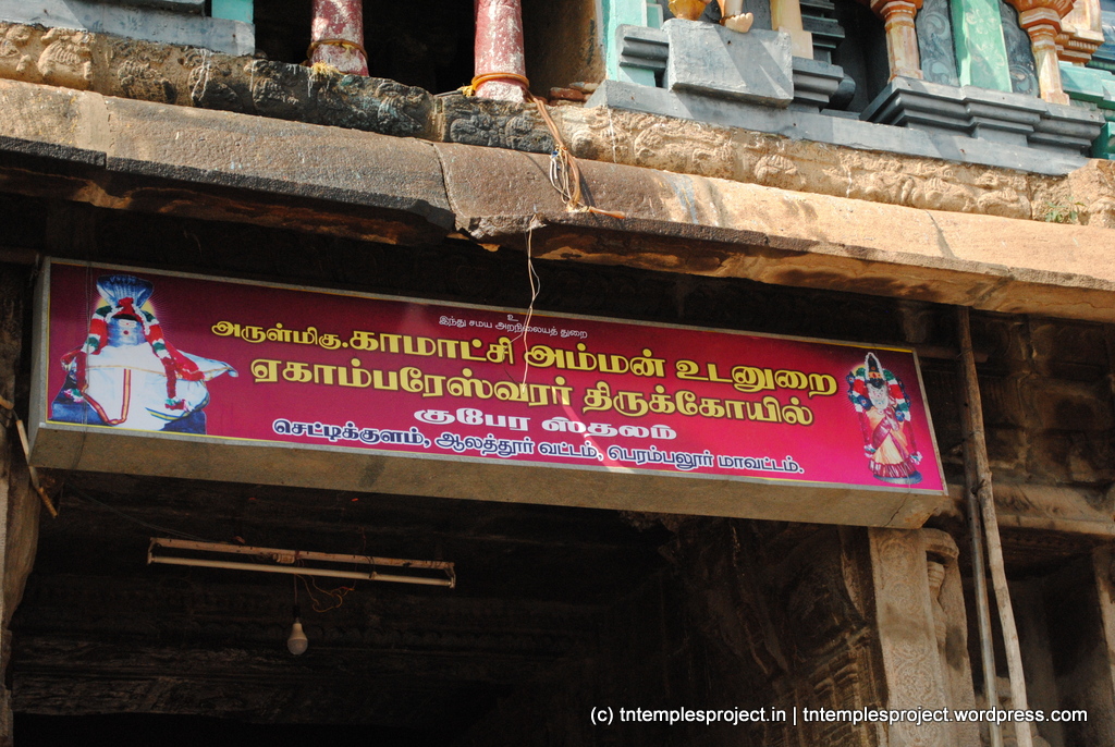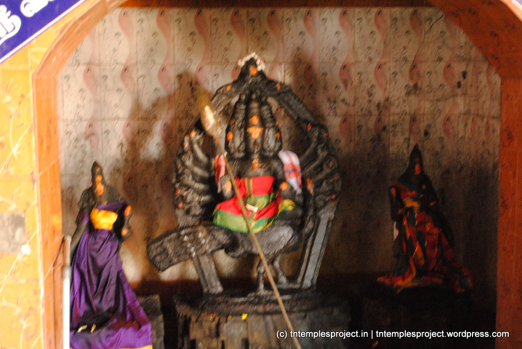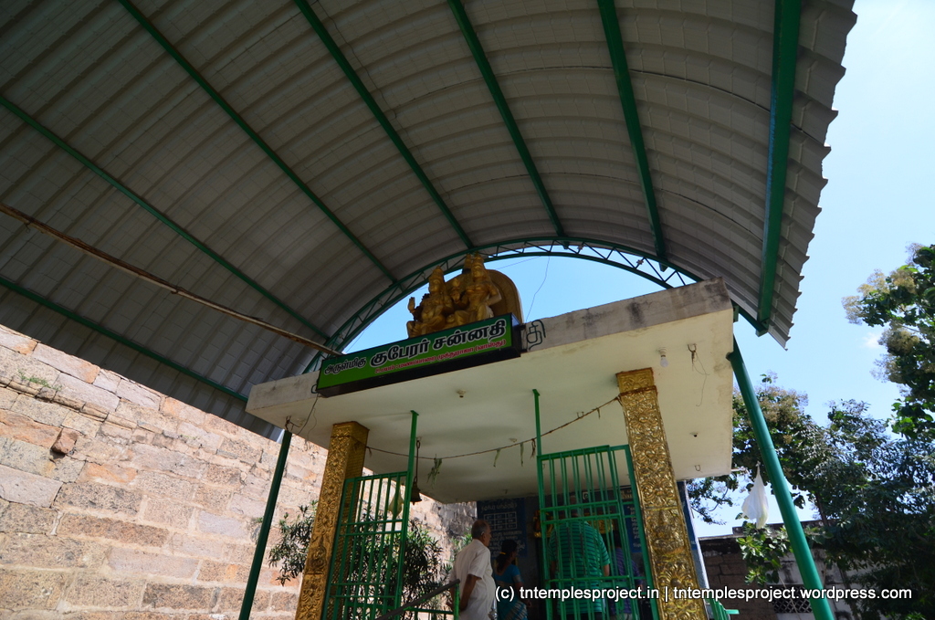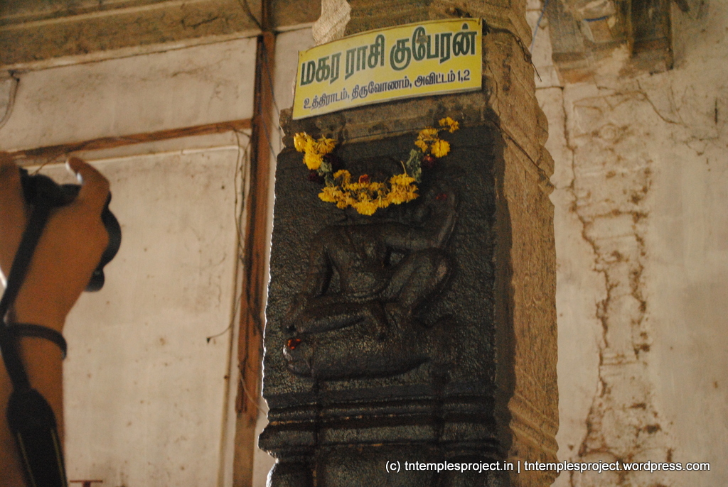 This is a Kubera sthalam, with 12 separate depictions of Kubera – one for each of the 12 rasis. These twelve bas relief sculptures are placed in such a manner that, viewed from above, they form the shape of OM. In a separate shrine, Kubera is seen with his wife Chitrakala on his vahanam, the fish, and also with sanganidhi and padmanidhi. It is believed that Kubera worshipped Siva and Parvati here, and was rewarded with four things: