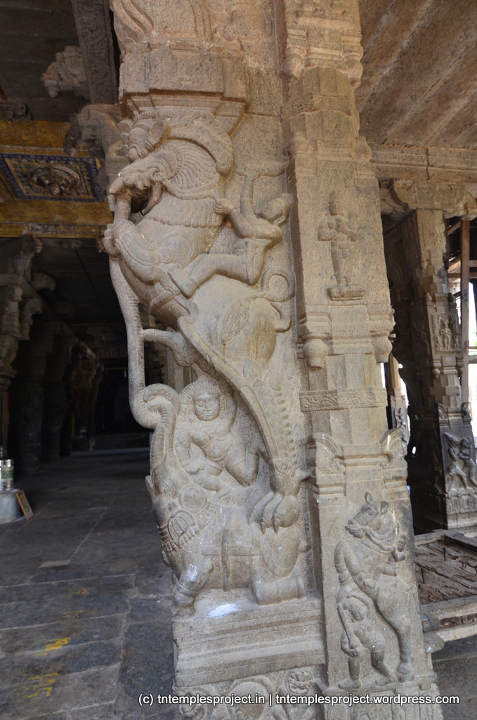 The temple has stunning architecture work in its walls, halls and pillars, including the various Kubera depictions mentioned above. There is a sculpture with the head of a bull and an elephant, depending on the angle of view, and also a 1000-pillared mandapam. There are also 10 musical pillars that emit different notes when hit with a sandal stick.