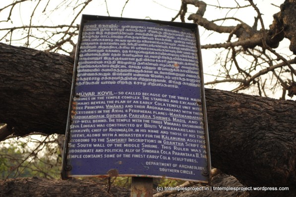 Moovar koil is the name of the place today, but based on inscriptions at the nearby Muchukundeswarar temple, this place used to be called Vikrama Kesareeswaram, after the Irukkuvel chieftain.