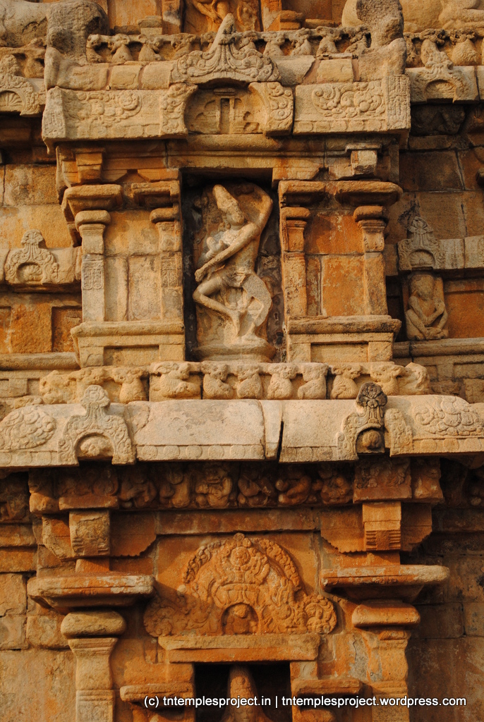 The shrines are dvi-tala structures, ie, the vimanams each have two stories or levels. On the koshta walls are beautiful carvings in the niches, and these only get better as one looks further up towards the vimanam. The sculptures are considered to be among the finest specimens of Chola art, some of which are no longer in the complex, but at the Government Museums at Chennai and Pudukottai.