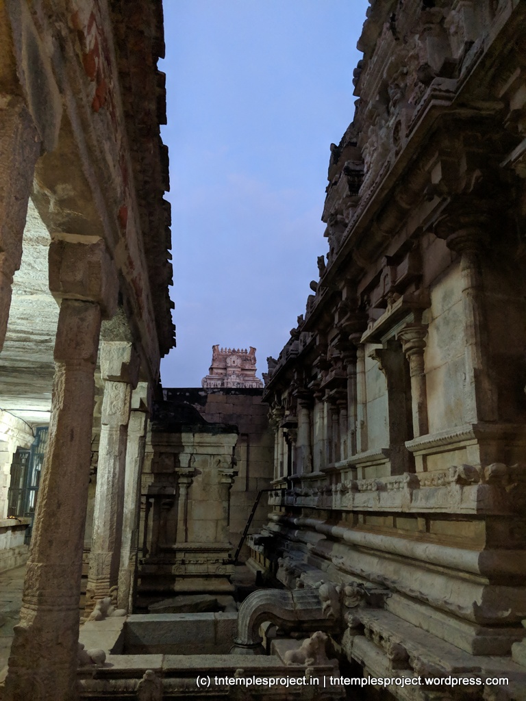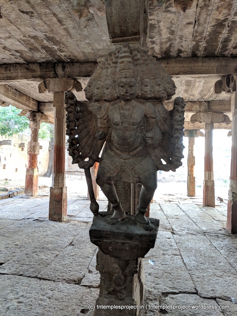 The temple is a treasure trove of architecture and sculptures, including many of Vishnu’s Dasavataram portrayed in the form of standalone carvings, in the Vasanta mandapam at the entrance of the temple. Inside the temple, the outer walls of the main shrine as well as pillars and other walls throughout the temple are filled with intricate and fascinating architecture. Outside the main gopuram is a separate mandapam, which appears to have been larger in earlier times, going by the four free-standing pillars next to it.