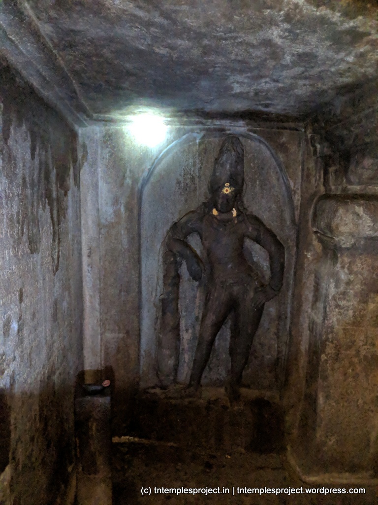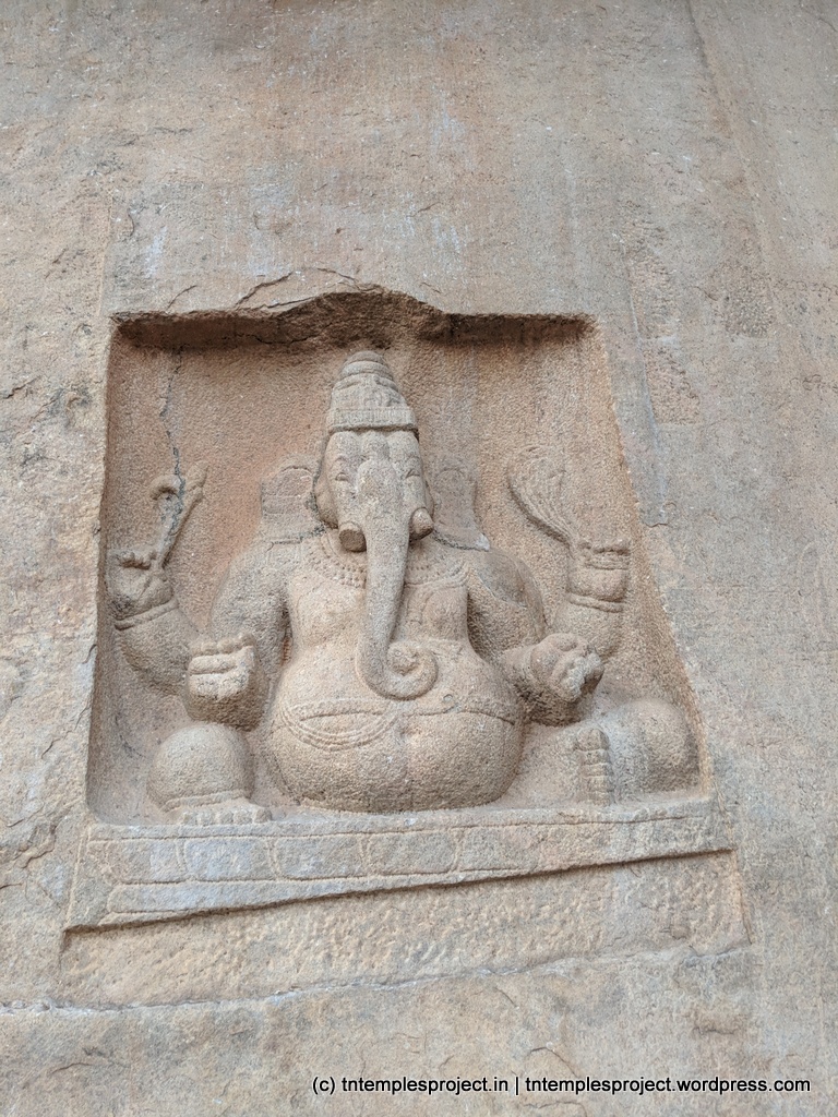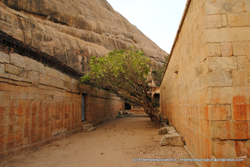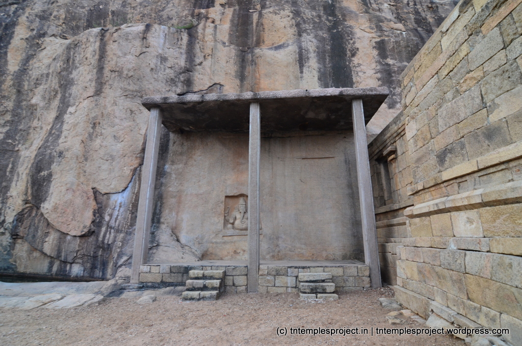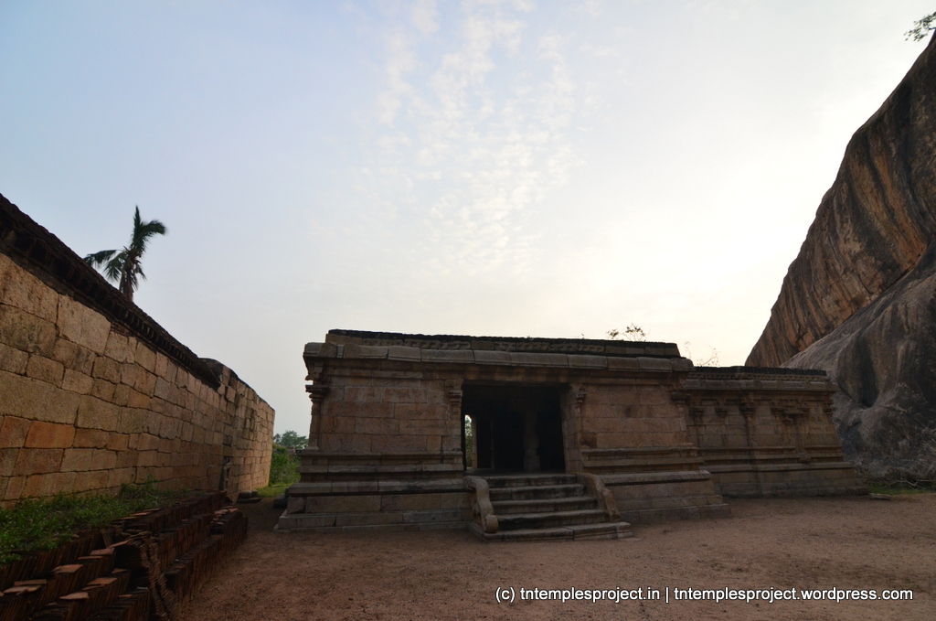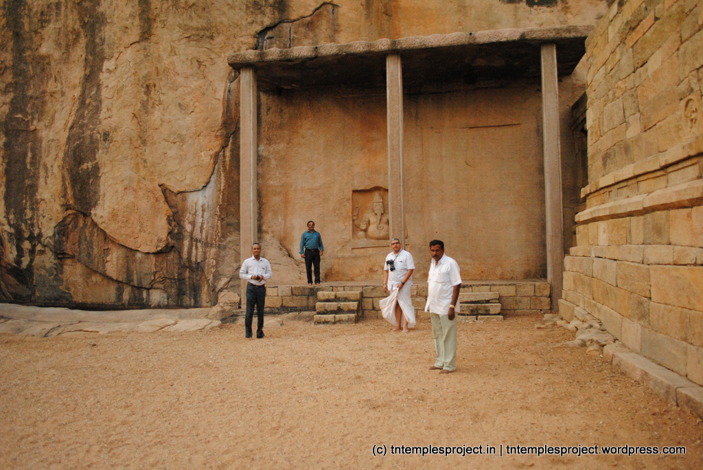 - On the right: a cave temple housing a Siva Lingam (called Melakovil by locals), dug 30 feet into the rock, with its own dwarapalakas sculpted on the walls. The dwarapalakas face north and south (instead of in the same direction as the moolavar), one of them smiling and the other one sporting an angry look. This shrine is called Tirumoolattanam.; and