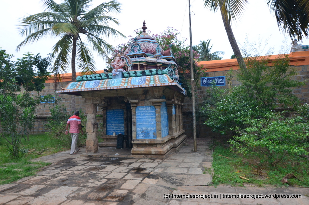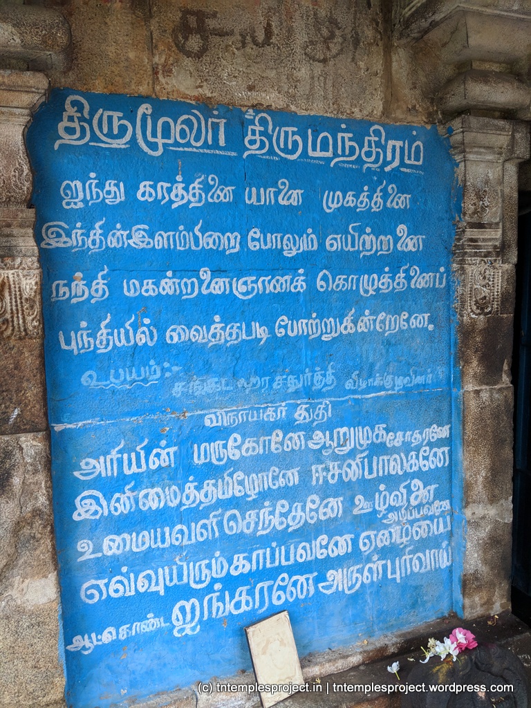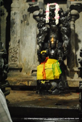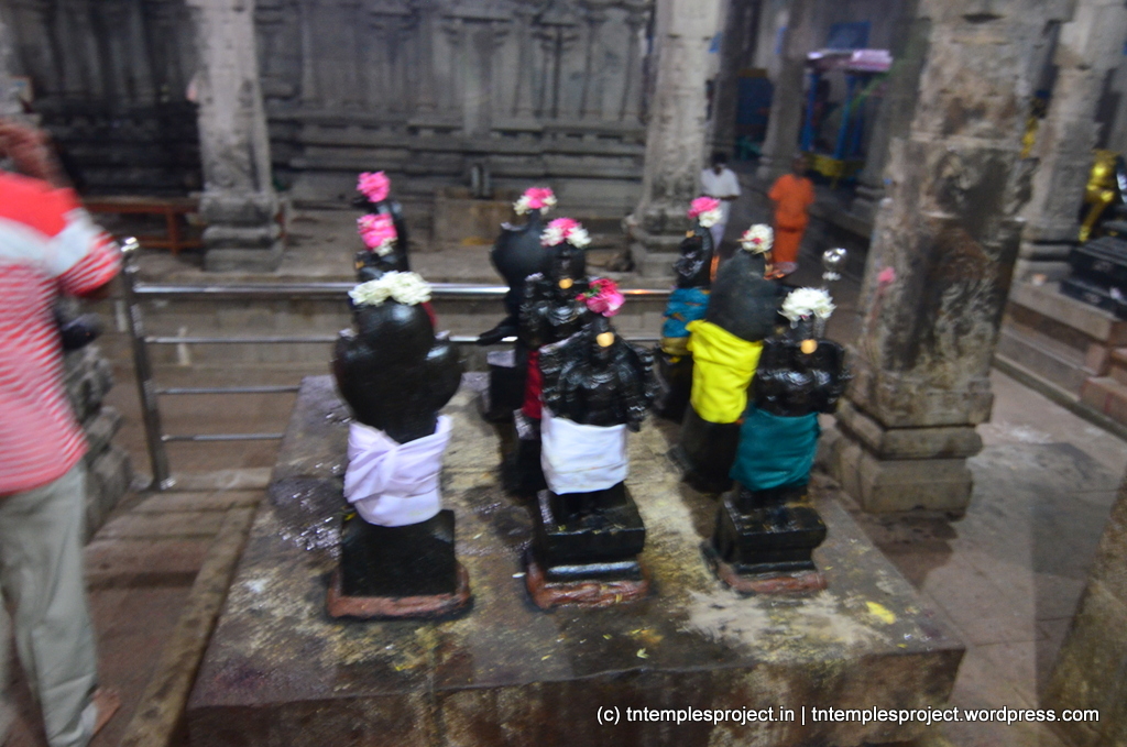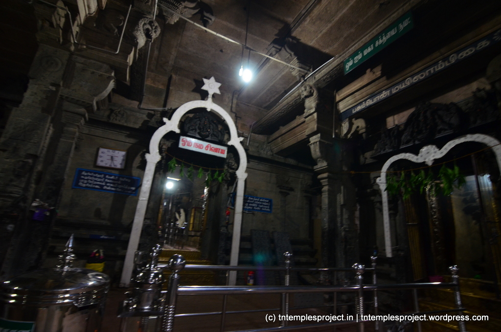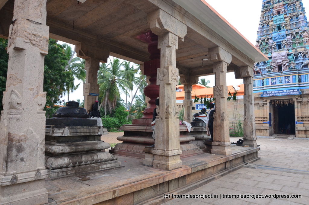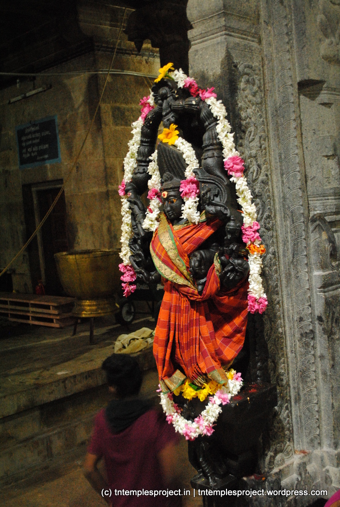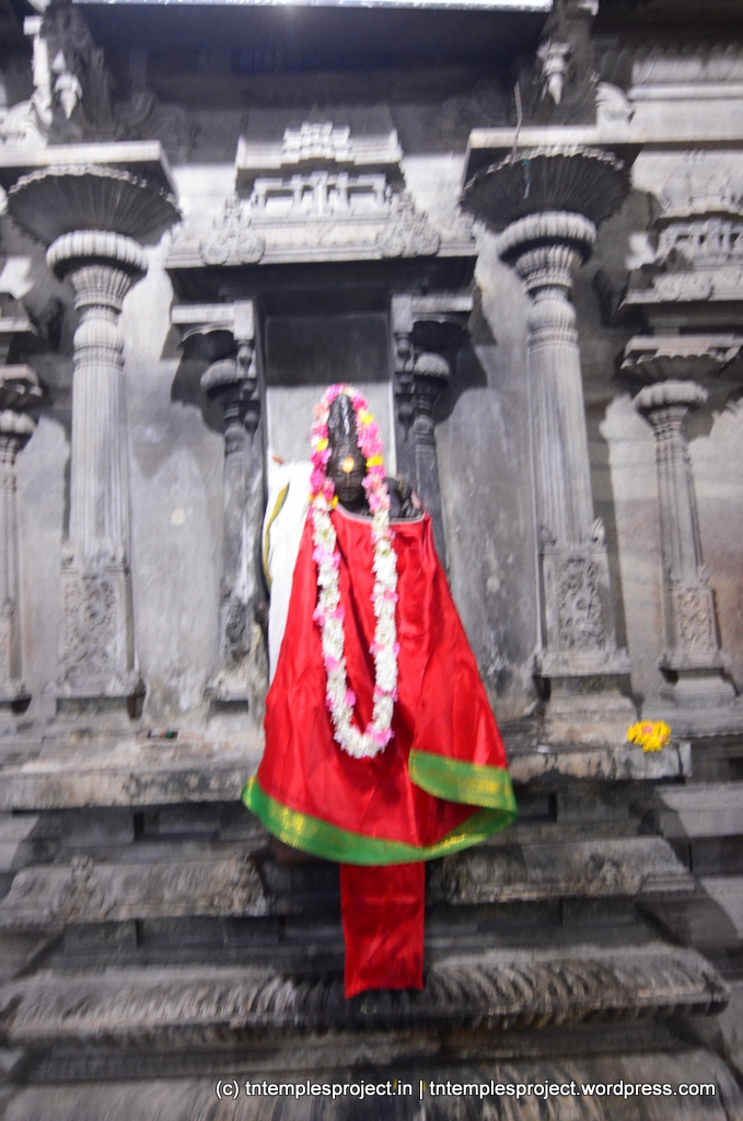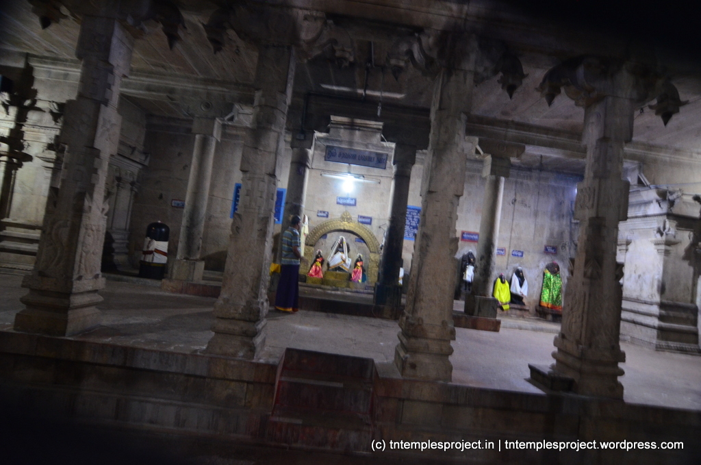 தட்சிணாமூர்த்தி ஒரு சிம்மத்துடன் சித்தரிக்கப்படுகிறார், அதாவது, சிங்கங்களால் செதுக்கப்பட்ட தூண்கள், அவருக்குப் பின்னால் உள்ள ஆலமரத்தின் இலைகள் மிகவும் சிக்கலானதாக சித்தரிக்கப்பட்டுள்ளன. அம்மன் சன்னதிக்கு எதிரே உள்ள ஒரு தூணில் ஊர்த்துவ தாண்டவத்தில் சிவபெருமானின் புடைப்புச் சிற்பம் உள்ளது, இதற்கு எதிரே உள்ள மற்றொரு தூண் காளி நடனமாடுவதைக் காட்டுகிறது. பல்வேறு ராசிகளைக் காட்டும் ராசிச் சக்கரத்தின் சிற்பமும் உள்ளது, மேலும் அந்தந்த ராசியின் கீழ் நின்று மூலவரை வழிபடும் பக்தர்களின் விருப்பங்கள் அனைத்தும் நிறைவேறும் என்பது நம்பிக்கை.