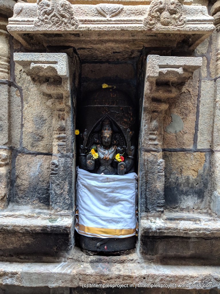 This is a later Chola temple, with limited architecture and sculpture work on the koshtas or other mandapam walls. The two large dwarapalakas to the garbhagriham are considered to be original to the temple, with most other aspects reckoned to be later additions. The original period murtis may have been destroyed or ransacked.