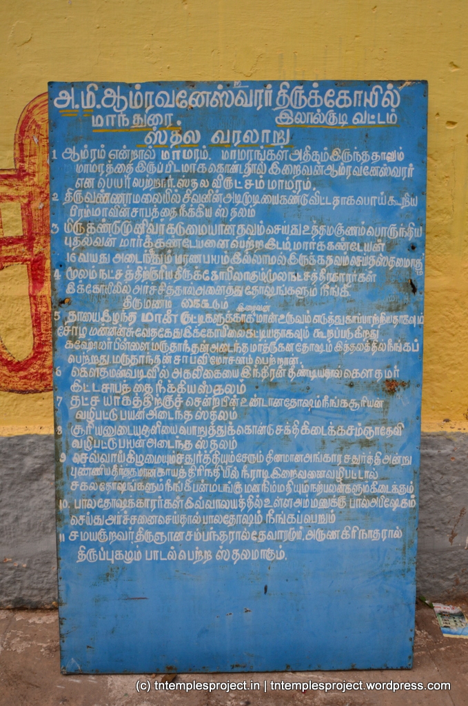 A sage committed a sin and was cursed to be born as a deer (maan, in Tamil), to other deer that where originally demons but also cursed to be born as deer. Left to be hunted down by its herd, the deer (sage) repented for his actions. Taking pity on him, Lord Siva hunted down the other deer (demons) and freed them from their curses, and also saved the young deer which was then fed by Parvati. Lord Siva also bestowed a mango tree to the young deer, which was now released from its curse and was back as a sage. The sage requested Siva and Parvati to remain here, which they did as Aamravenswarar and Balambikai.