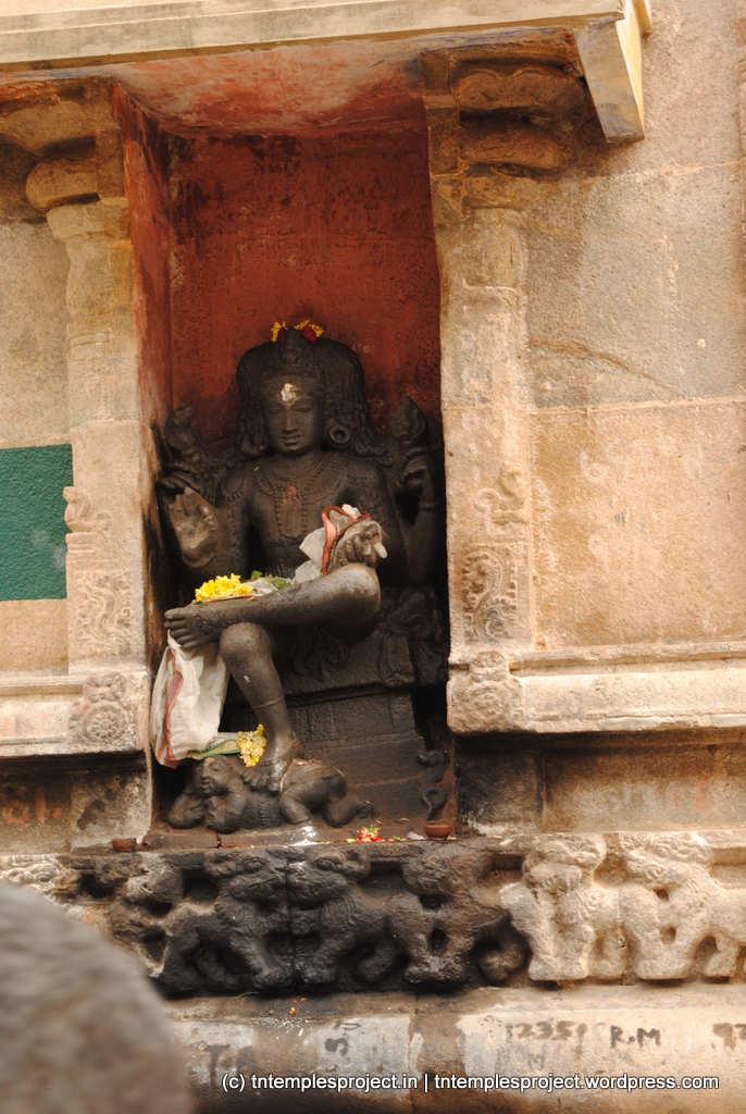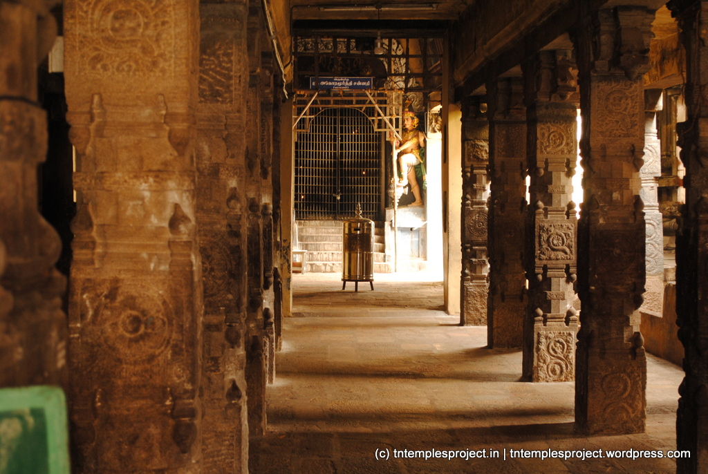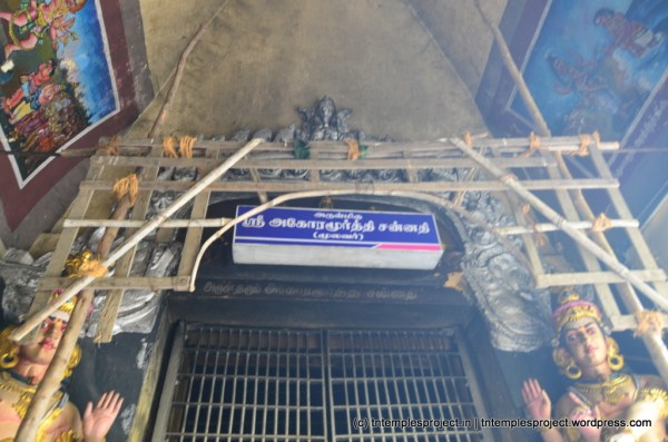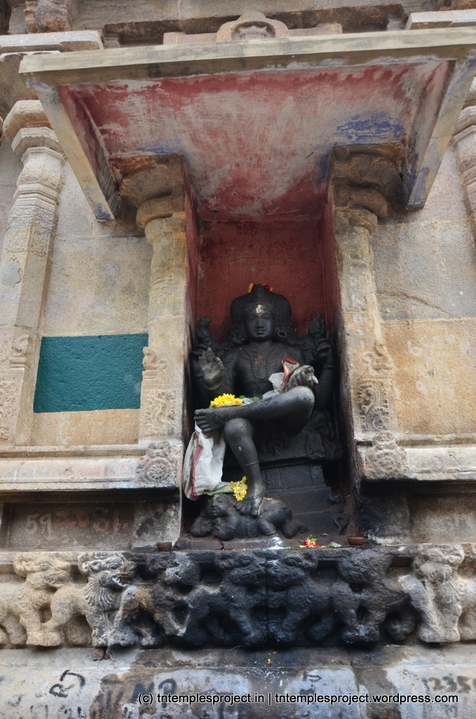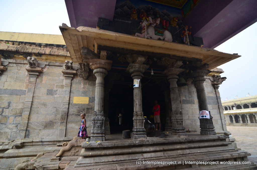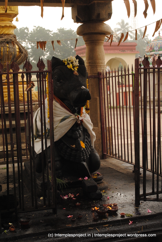 Siva has five faces or aspects – Sadyojatam, Vamadevam, Aghoram, Tatpurusham and Isanam. This temple is famous for the Aghora aspect of Siva. The story of this is as follows. A demon called Maruthvasuran (son of the demon Jalandharan) obtained boons from Brahma after severe penance, but started troubling the Devas. At their request, Siva deputed Nandi who defeated the demon and threw him into the sea. After redoubling his penance here, the demon obtained further boons, this time from Siva Himself. Finally, Siva again had to send Nandi to quell him. Finally, Siva himself took the form of Aghora murti (Veerabhadrar), and vanquished Maruthuvan at Tiruvenkadu. There is a separate shrine for Aghora Veerabhadrar, with a very tall ardha mandapam. Nandi is also depicted with the nine wounds he received when fighting with Maruthuvan. Agora murti is the 43rd out of the 64 forms of Siva. The slaying of Maruthvasuran is said to have taken place on an Sunday on the day of Pooram nakshatram. Worshipping Aghora murti here on Sundays at midnight is a special event for devotees. A special Aghora-Puja is performed at midnight on the third Sunday in the Tamil month of Karthigai (November-December), which is said to be extremely auspicious.