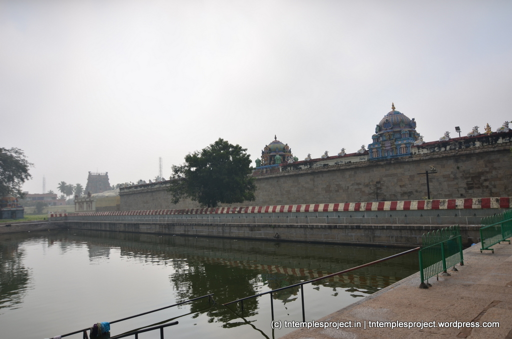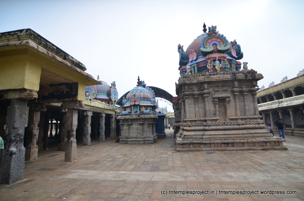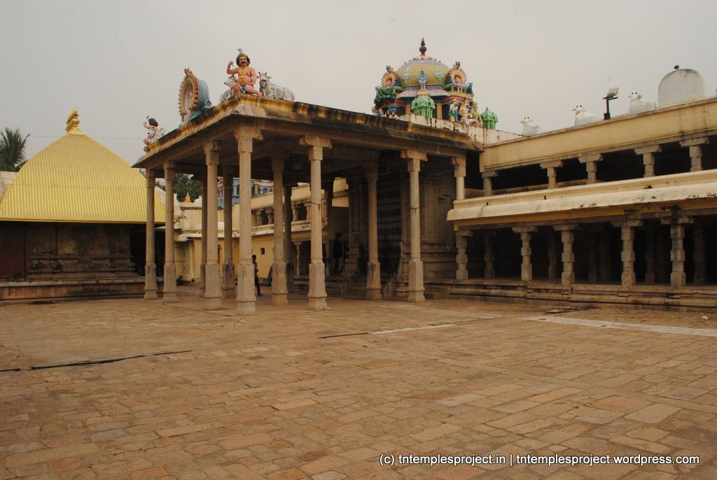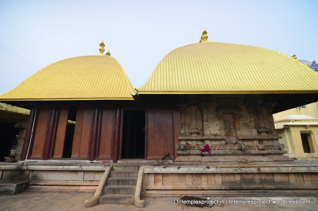 The story of Chidambaram is about Adiseshan wanting a darsanam of Siva’s tandavam, after coming to know that Vishnu felt heavy with fulfillment after watching it. It is believed that Vishnu himself witnessed Natarajar‘s tandavam here at Tiruvenkadu, and so this place is also called Aadi Chidambaram. Just like Chidambaram, this temple also has a gold-plated roof in similar style (like the Ambalams of Kerala). There is also a shrine for Vishnu near the Natarajar shrine. In fact, some legends state that Siva danced nine types of tandavams (Ananda, Tripura, Sandhya, Samhara, Kali, Uma, Siva, Krishna and Gauri) here, before doing so at any other place. Three drops of sweat fell from Siva’s forehead during His cosmic dance, and it is believed that these drops formed the three temple tanks that are within the temple premises (Agni, Surya and Chandra Teerthams).