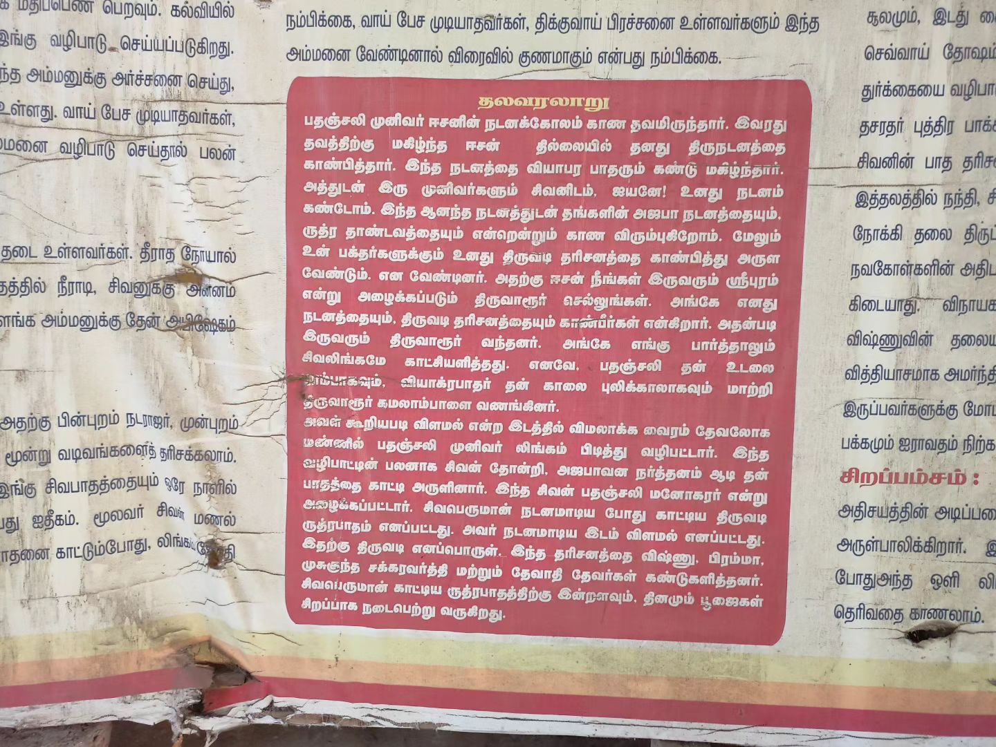 பதஞ்சலி முனிவர் மற்றும் வியாக்ரபாதா ஆகியோர் சிதம்பரத்தில் சிவபெருமானின் பிரபஞ்ச நடனத்தால் கவரப்பட்டனர், ஆனால் அவர்களும் அஜப நடனம் மற்றும் ருத்ர பதம் ஆகியவற்றைக் காண விரும்பினர், இதற்காக சிவனிடம் பிரார்த்தனை செய்தனர். அவர்களை ஸ்ரீபுரம் (திருவாரூர்) செல்லச் சொன்னார். இருவரும் திருவாரூர் வந்தடைந்தபோது, தரையில் எங்கும் சிவலிங்கங்கள் இருந்ததால், பதஞ்சலி பாம்பு வடிவம் எடுத்தார்.