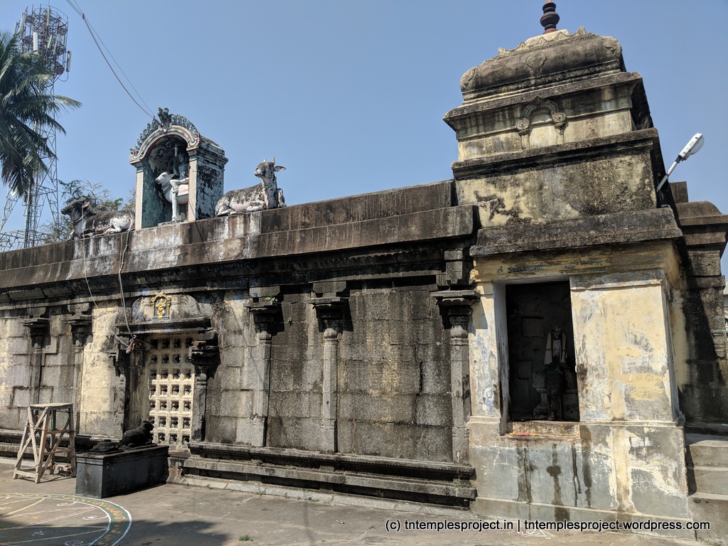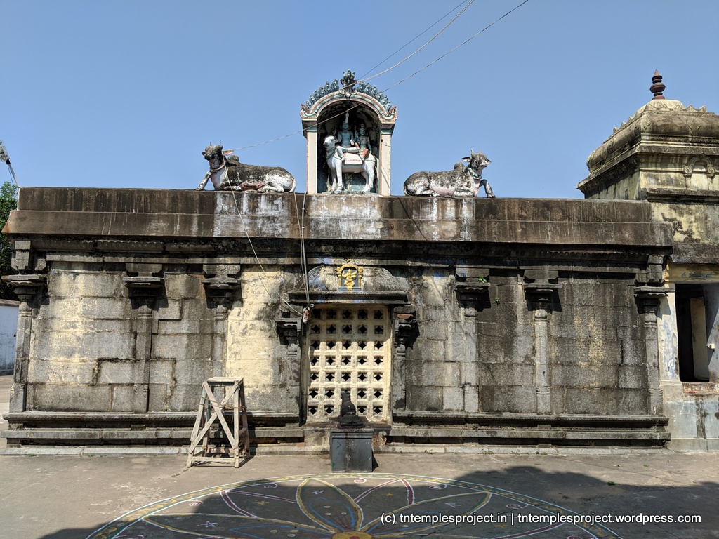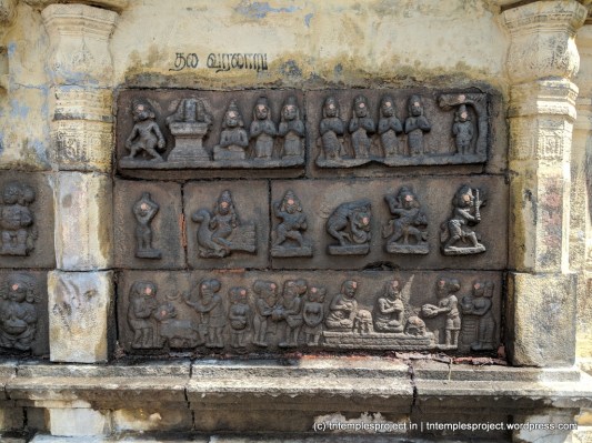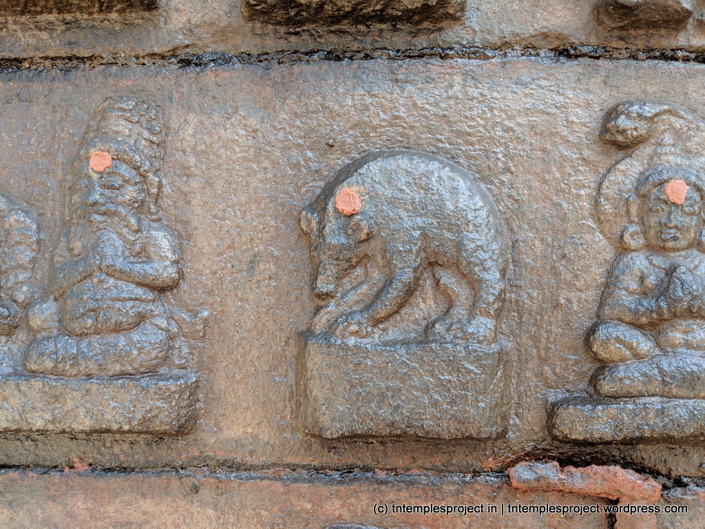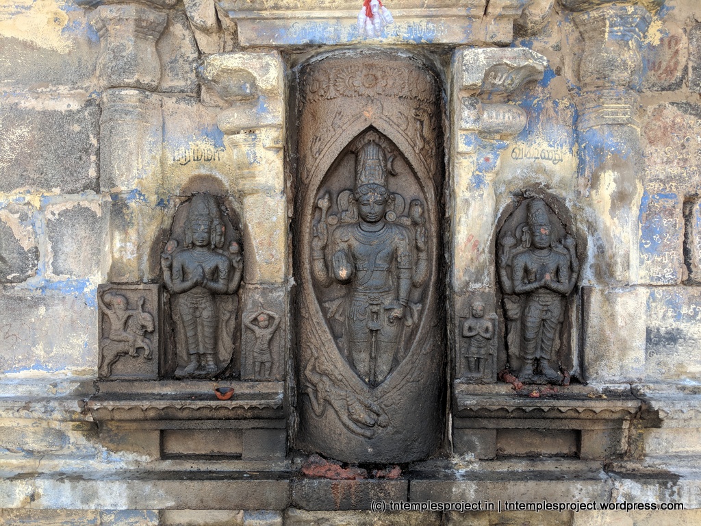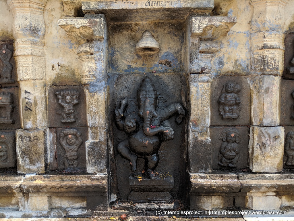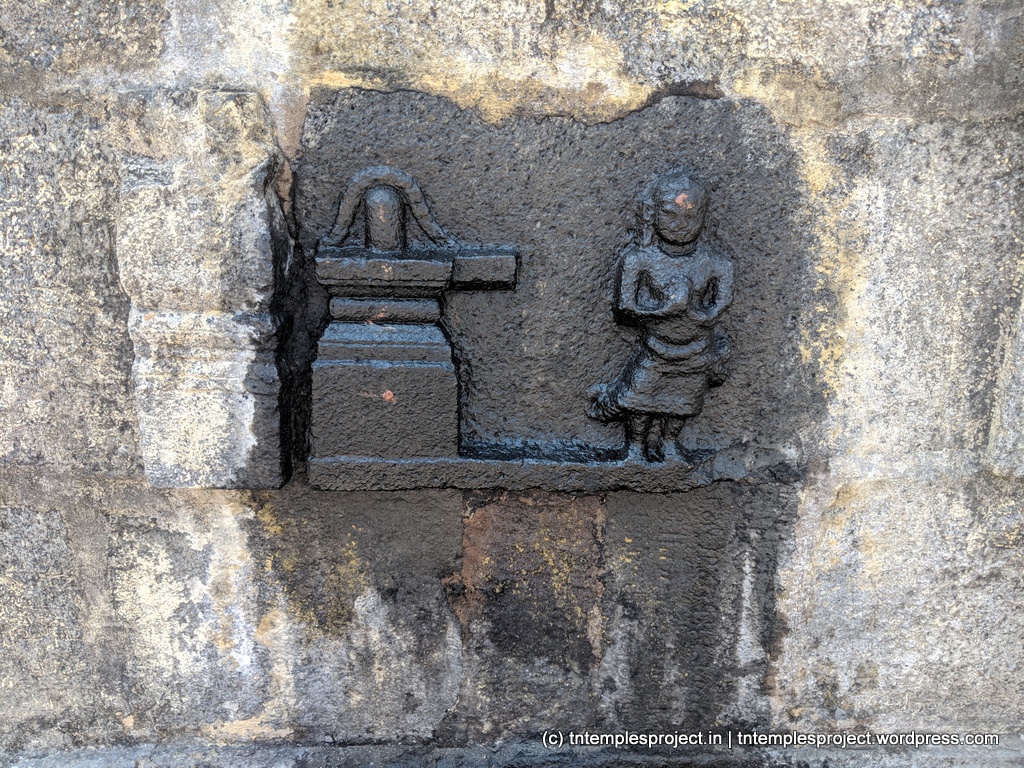நடனமாடுவதையும், பிரம்மா பஞ்சமுக வாத்தியம் (தாள வாத்தியம்) வாசிப்பதையும் காணலாம். தட்சிணாமூர்த்தி அமர்ந்த நிலையில் சித்தரிக்கப்படுகிறார், ஆனால் அவரது காலடியில் அபஸ்மர புருஷர் இல்லாமல் – சிவபெருமான் இங்கே தம்பதிகள் கொடுத்த உணவை சாப்பிட்டுக்கொண்டிருந்தார்! ஸ்தல புராணம் கோஷ்டம் சுவரில் சிறிய ஆனால் நம்பமுடியாத விரிவான அடிப்படை நிவாரணப் படங்களின் வரிசையாக சித்தரிக்கப்பட்டுள்ளது. கோஷ்டத்தில் நர்தன கணபதியை பூத கணங்களுடன் காணலாம்! மேற்கு கோஷ்டத்தில், விஷ்ணுவும் பிரம்மாவும் தனித்தனி உருவங்களாக, லிங்கோத்பவரை வழிபடுவதைக் காணலாம்.