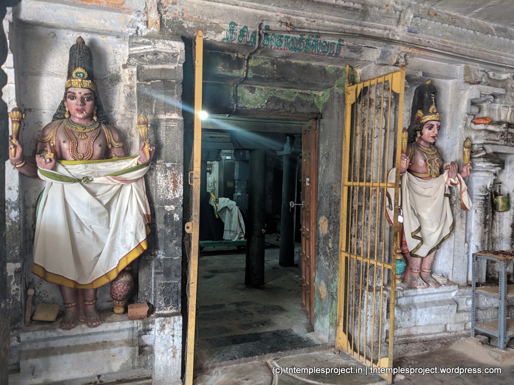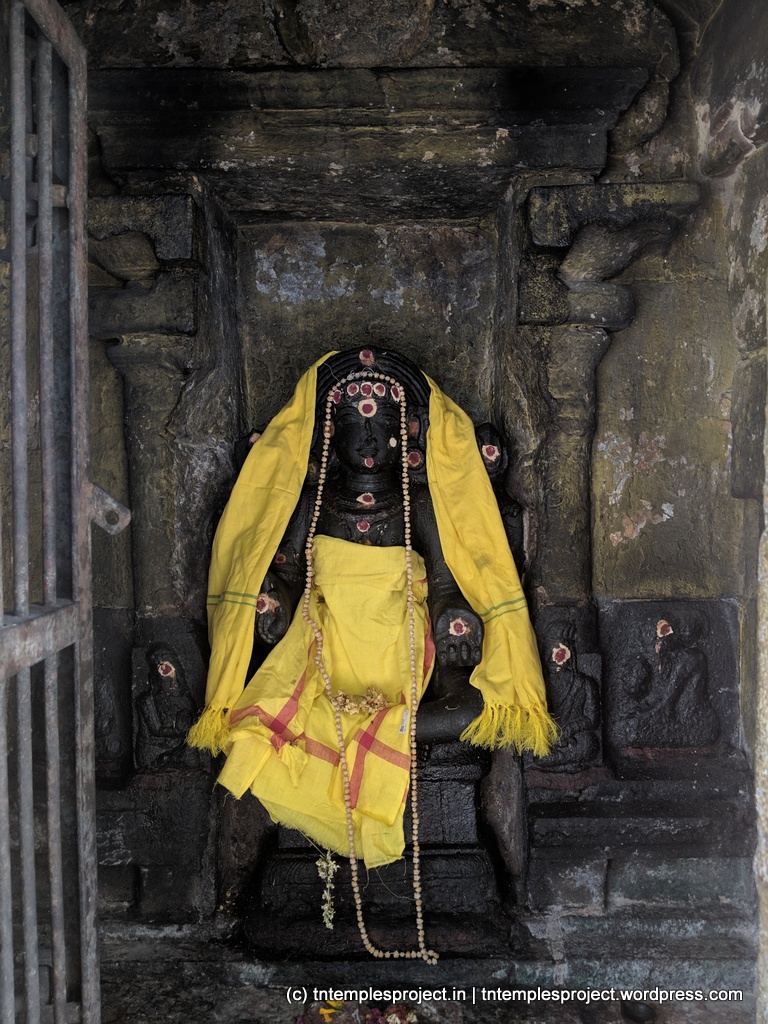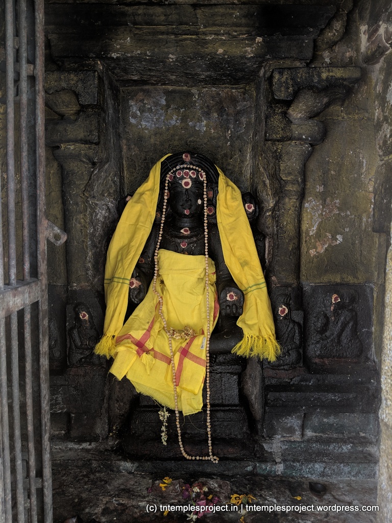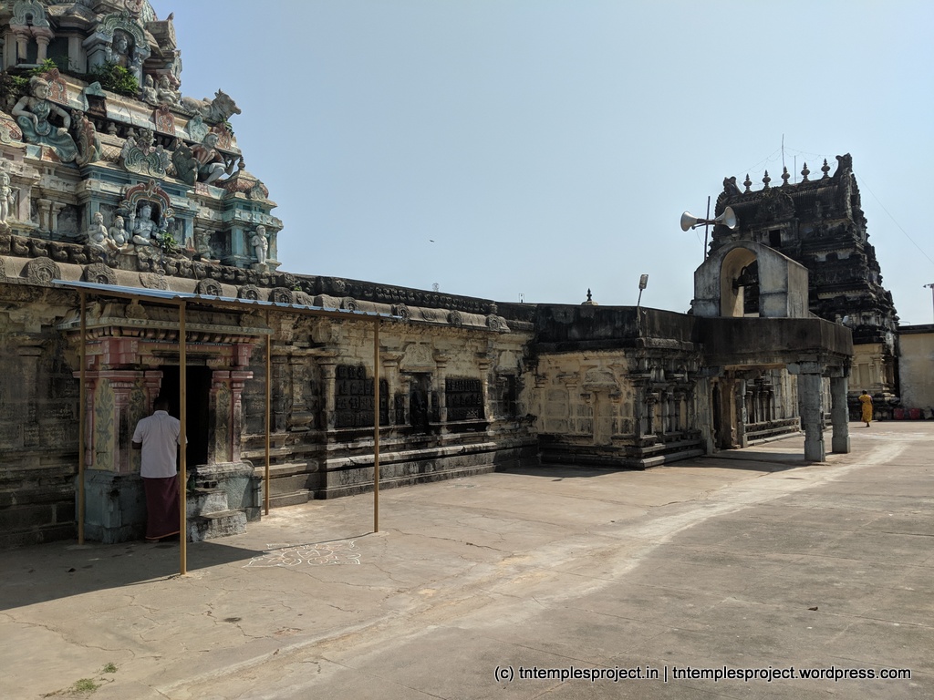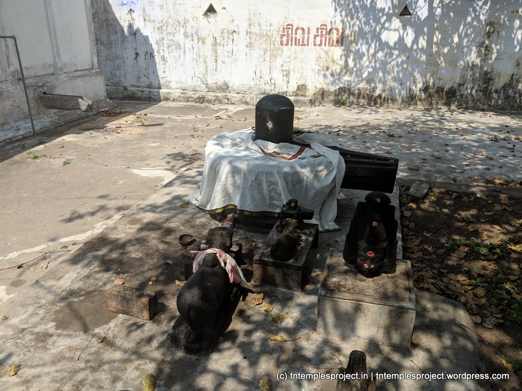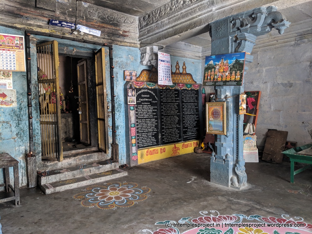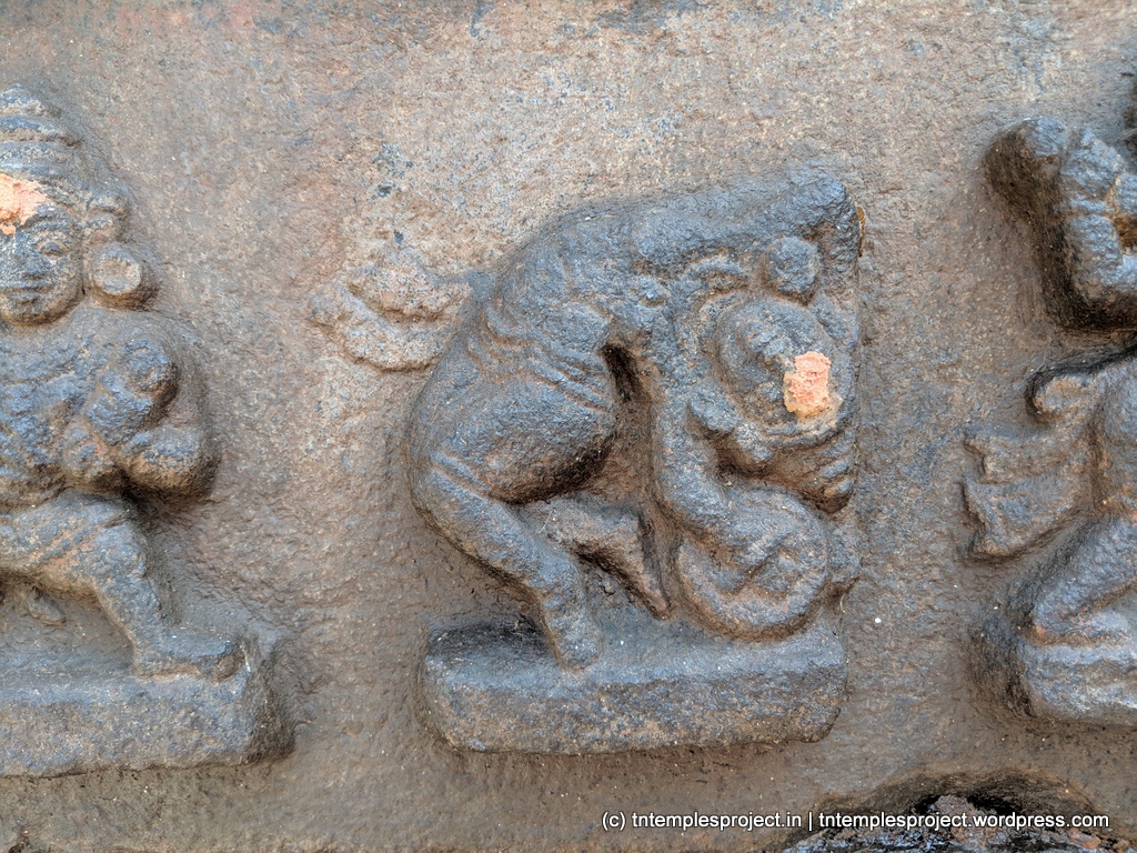 நடனமாடுவதையும், பிரம்மா பஞ்சமுக வாத்தியம் (தாள வாத்தியம்) வாசிப்பதையும் காணலாம். தட்சிணாமூர்த்தி அமர்ந்த நிலையில் சித்தரிக்கப்படுகிறார், ஆனால் அவரது காலடியில் அபஸ்மர புருஷர் இல்லாமல் – சிவபெருமான் இங்கே தம்பதிகள் கொடுத்த உணவை சாப்பிட்டுக்கொண்டிருந்தார்! ஸ்தல புராணம் கோஷ்டம் சுவரில் சிறிய ஆனால் நம்பமுடியாத விரிவான அடிப்படை நிவாரணப் படங்களின் வரிசையாக சித்தரிக்கப்பட்டுள்ளது. கோஷ்டத்தில் நர்தன கணபதியை பூத கணங்களுடன் காணலாம்! மேற்கு கோஷ்டத்தில், விஷ்ணுவும் பிரம்மாவும் தனித்தனி உருவங்களாக, லிங்கோத்பவரை வழிபடுவதைக் காணலாம்.