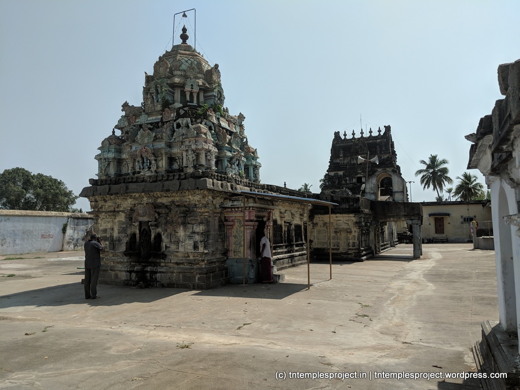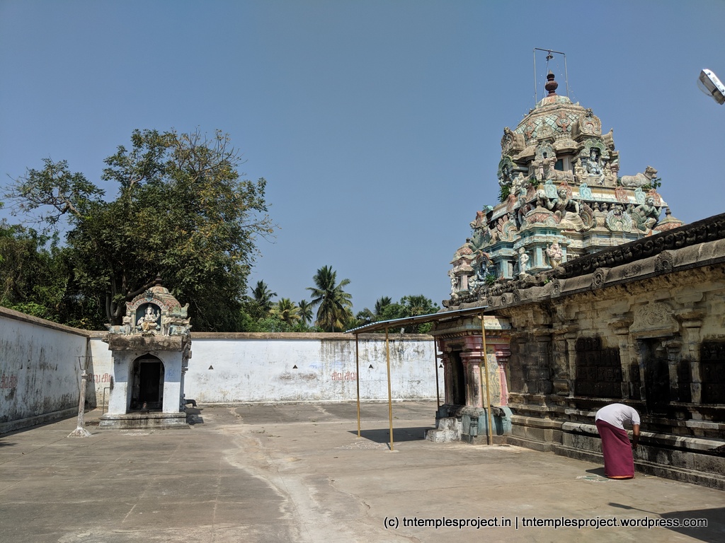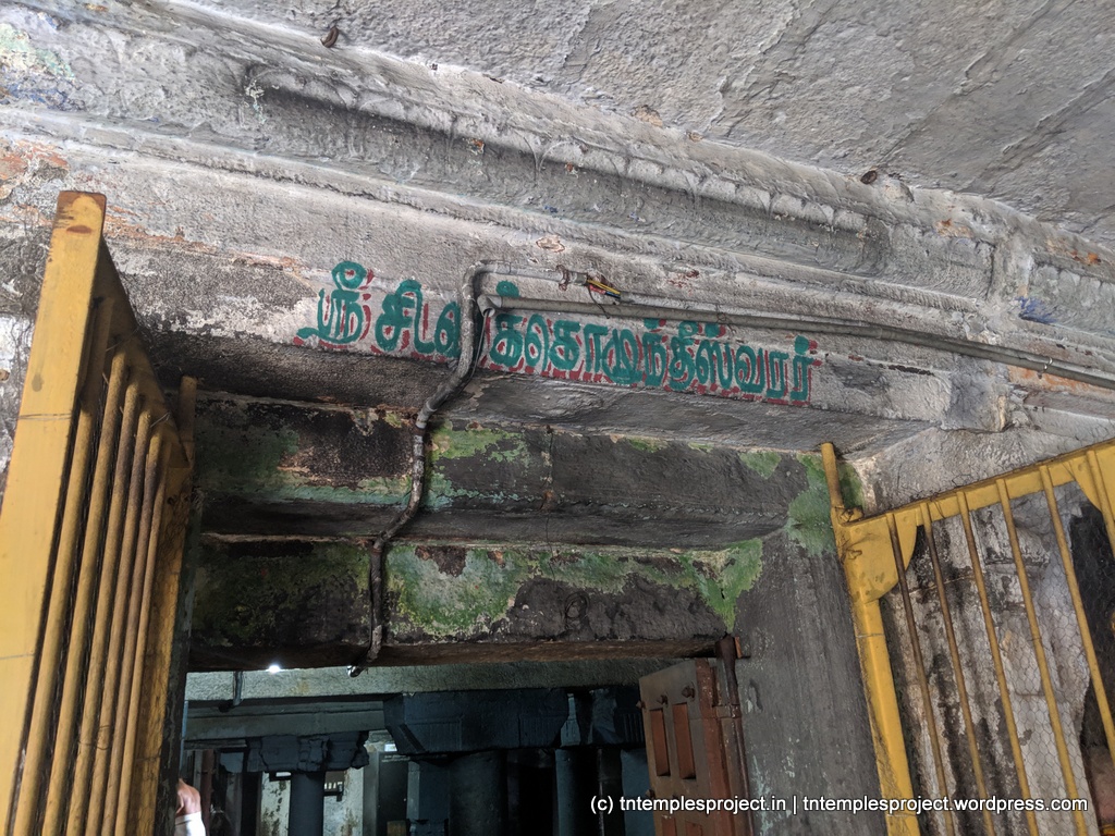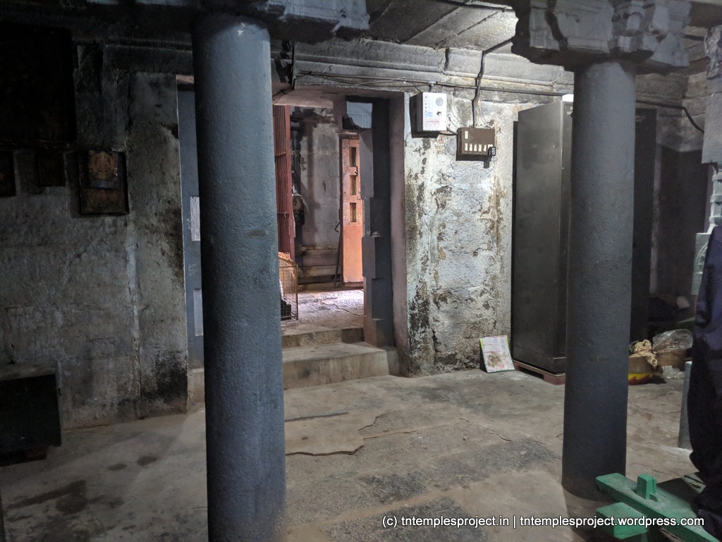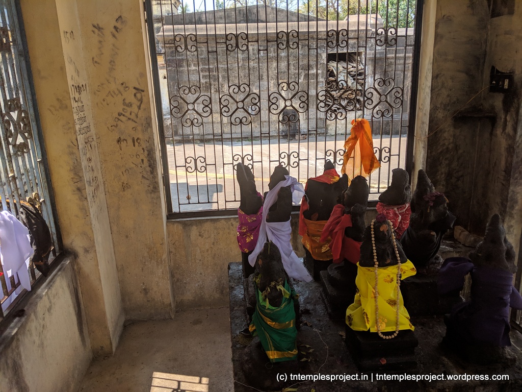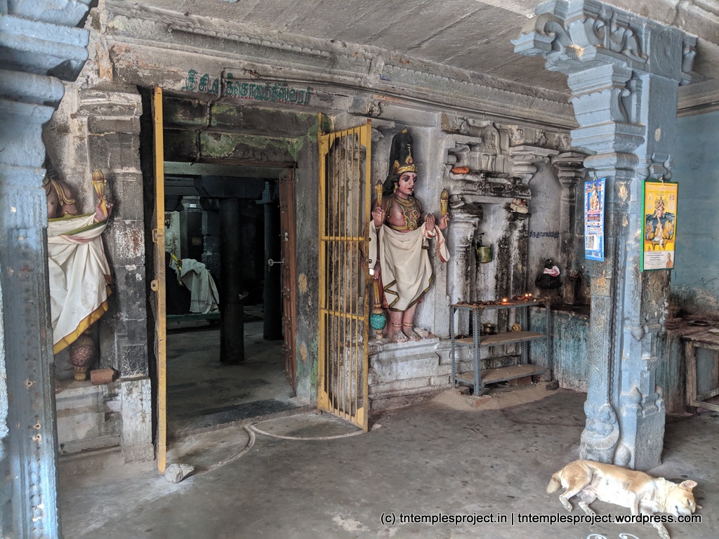 நடனமாடுவதையும், பிரம்மா பஞ்சமுக வாத்தியம் (தாள வாத்தியம்) வாசிப்பதையும் காணலாம். தட்சிணாமூர்த்தி அமர்ந்த நிலையில் சித்தரிக்கப்படுகிறார், ஆனால் அவரது காலடியில் அபஸ்மர புருஷர் இல்லாமல் – சிவபெருமான் இங்கே தம்பதிகள் கொடுத்த உணவை சாப்பிட்டுக்கொண்டிருந்தார்! ஸ்தல புராணம் கோஷ்டம் சுவரில் சிறிய ஆனால் நம்பமுடியாத விரிவான அடிப்படை நிவாரணப் படங்களின் வரிசையாக சித்தரிக்கப்பட்டுள்ளது. கோஷ்டத்தில் நர்தன கணபதியை பூத கணங்களுடன் காணலாம்! மேற்கு கோஷ்டத்தில், விஷ்ணுவும் பிரம்மாவும் தனித்தனி உருவங்களாக, லிங்கோத்பவரை வழிபடுவதைக் காணலாம்.