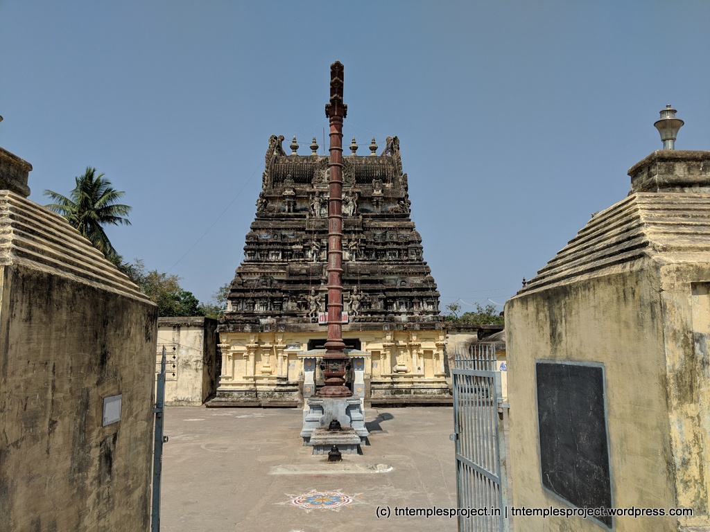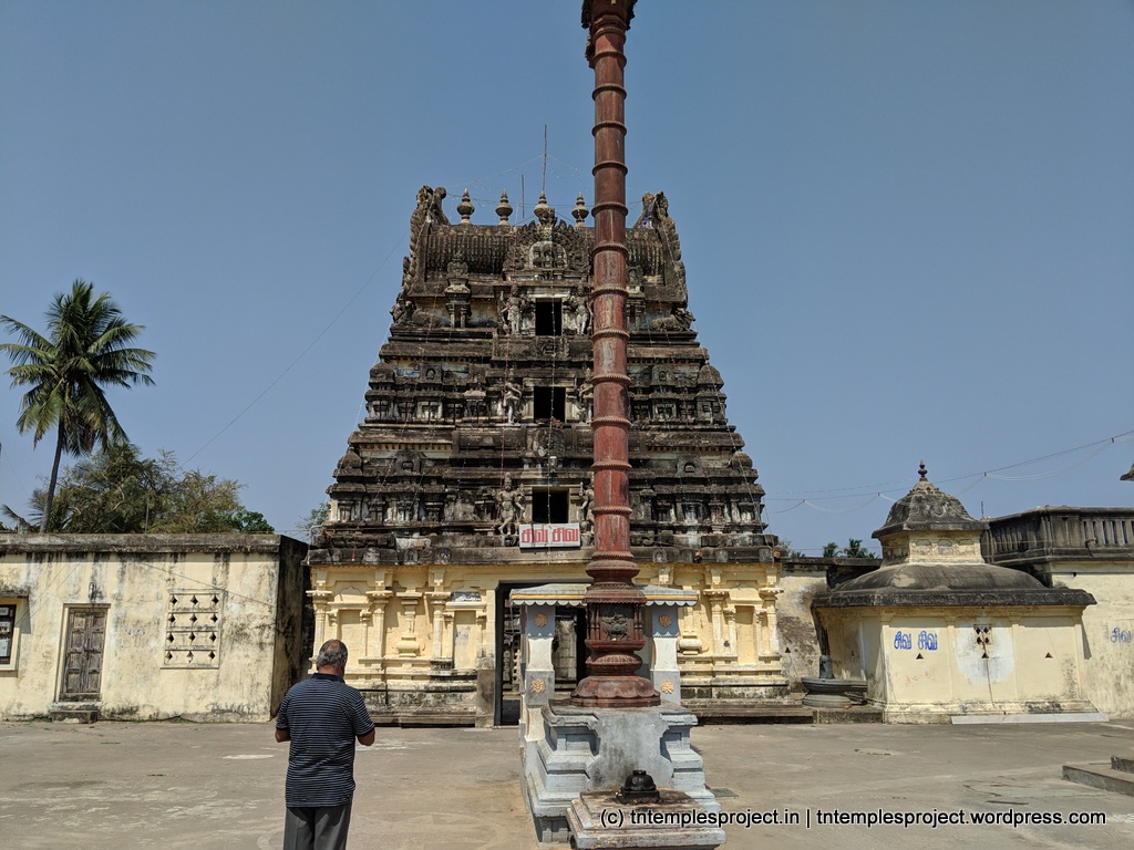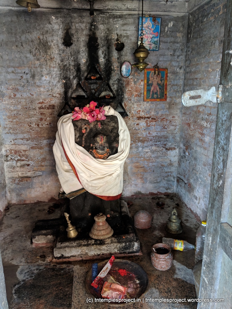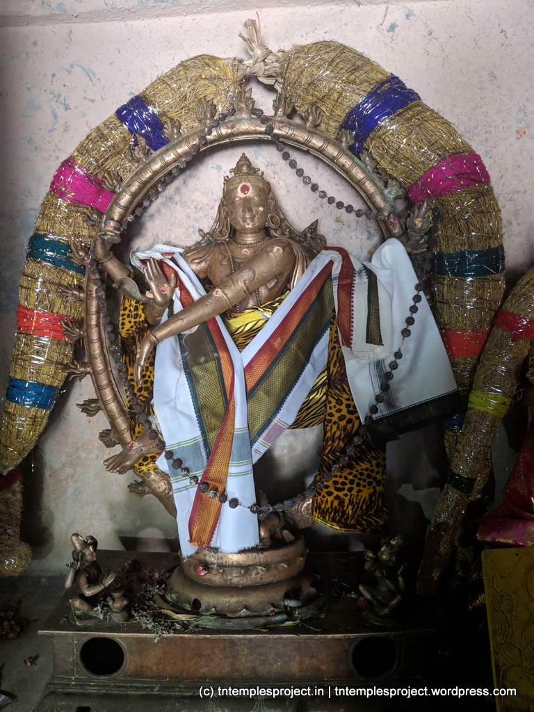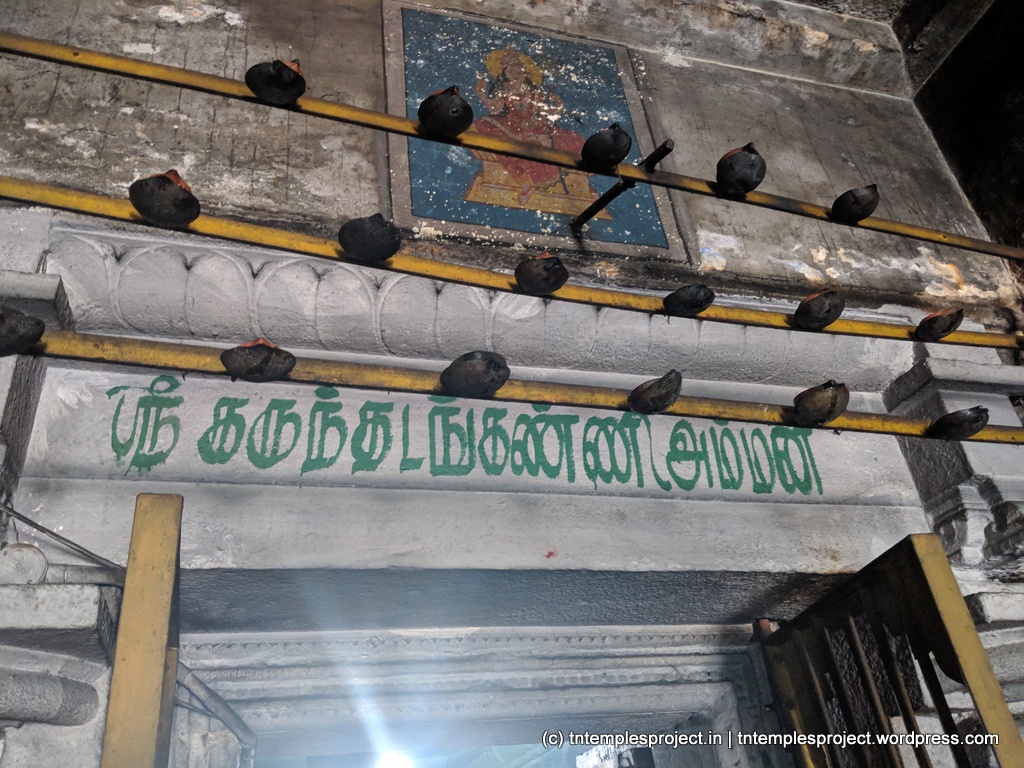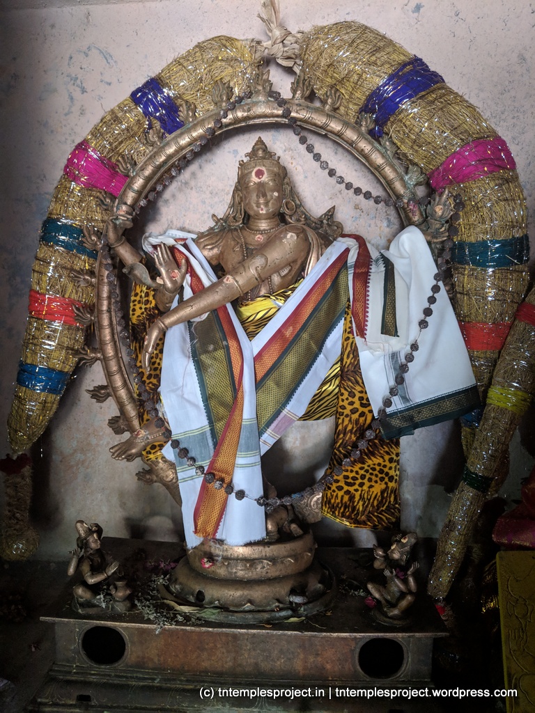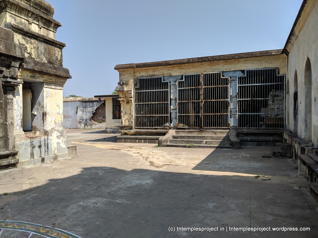 நடனமாடுவதையும், பிரம்மா பஞ்சமுக வாத்தியம் (தாள வாத்தியம்) வாசிப்பதையும் காணலாம். தட்சிணாமூர்த்தி அமர்ந்த நிலையில் சித்தரிக்கப்படுகிறார், ஆனால் அவரது காலடியில் அபஸ்மர புருஷர் இல்லாமல் – சிவபெருமான் இங்கே தம்பதிகள் கொடுத்த உணவை சாப்பிட்டுக்கொண்டிருந்தார்! ஸ்தல புராணம் கோஷ்டம் சுவரில் சிறிய ஆனால் நம்பமுடியாத விரிவான அடிப்படை நிவாரணப் படங்களின் வரிசையாக சித்தரிக்கப்பட்டுள்ளது. கோஷ்டத்தில் நர்தன கணபதியை பூத கணங்களுடன் காணலாம்! மேற்கு கோஷ்டத்தில், விஷ்ணுவும் பிரம்மாவும் தனித்தனி உருவங்களாக, லிங்கோத்பவரை வழிபடுவதைக் காணலாம்.