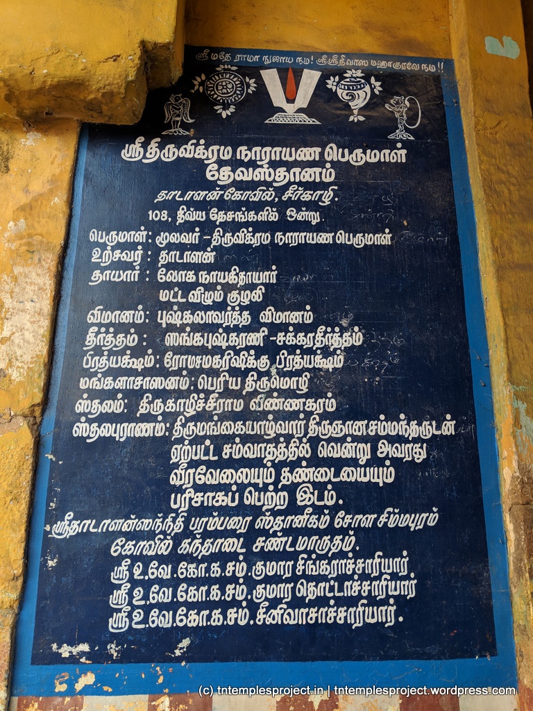 இங்குள்ள இறைவன் தலலன் (அல்லது தடாலன்; தல்=கால், ஆல்=ஆட்சி) என்றும் அழைக்கப்படுகிறார். ஒரு புராணத்தின் படி, கோயில் சரியாகப் பராமரிக்கப்படாத நேரத்தில், ஒரு வயதான பெண்மணி தலலன் சிலையை உமி பானையில் வைத்திருந்தார். திருமங்கையாழ்வார் ஒரு முறை சைவ துறவியான சம்பந்தருடன் ஒரு பாடல் விவாதம் செய்தார் (சீர்காழி என்பது நாயன்மார்களின் அவதார ஸ்தலம்). விவாதத்தின் போது ஒரு தெய்வத்தை தன்னுடன் வைத்திருக்க, திருமங்கையாழ்வார் தசாவதாரத்தில் ஒரு பாடலின் மூலம் பெருமாளை அழைத்தார், அதன் மீது இறைவன் பானையிலிருந்து வெளியே வந்து ஆழ்வாரின் அருகில் அமர்ந்தார். விவாதத்தில் ஆழ்வார் வென்று இங்குள்ள இறைவனைப் போற்றி பாசுரம் பாடினார்.