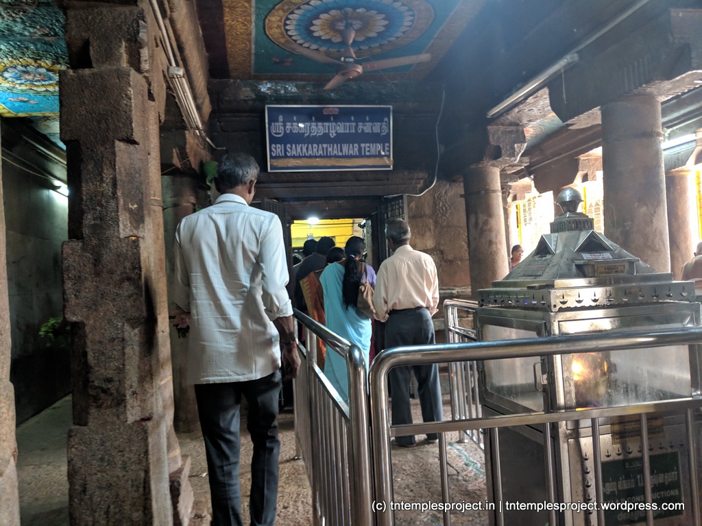 விஷ்ணுவின் சுதர்சன சக்கரம் இக்கோயிலில் சிறப்பு வழிபாடுகளைப் பெறுவதால், இக்கோயில் பொதுவாக சக்கரத்தாழ்வார் கோயில் என்று அழைக்கப்படுகிறது. நரசிம்மாவதாரத்திற்குப் பிறகு ஹிரண்யகசிபு சக்கரத்தாழ்வார் மடியில் காட்சியளிக்கிறார். சக்கரத்தாழ்வார் மூர்த்தி கிழக்கு நோக்கி, 16 கைகள் மற்றும் 16 விதமான ஆயுதங்களுடன், 154 எழுத்துகளுடன் பீஜ மந்திரத்தில் உள்ளதாகக் கூறப்படுகிறது. சக்கரத்தாழ்வார் மூர்த்தியின் பின்புறம் மேற்கு நோக்கி நரசிம்மர் இருக்கிறார். நரசிம்மரின் நான்கு கைகளிலும் சக்கரம் உள்ளது.