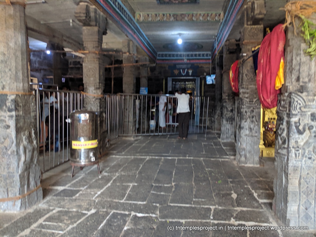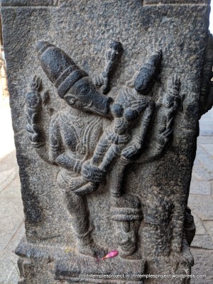 Jaya and Vijaya, the gatekeepers at Vaikuntam, were cursed by the Sanatkumaras to be born as asuras, rakshasas and then humans, before being able to return to Vaikuntam. They therefore became Hiranyakshan (from the Varaha avataram) and Hiranyakashipu (Narasimha avataram). Hiranyakshan obtained a boon of invincibility from Brahma, and emboldened by this, hid Bhudevi under the ocean. To save her, Vishnu took the form of a boar (varaham) and after defeating Hiranyakshan in a duel lasting 1000 years, was able to rescue Bhudevi. She wanted to marry him, and so the Lord seated her on His lap at this place. Typically, the wife is shown seated on the left (idam, in Tamil) side of the lap, and so the place got the name Tiru-Ida-Endhai (Endhai meaning “my Lord”). Vishnu is depicted as Vahara Perumal with Bhudevi on his lap.