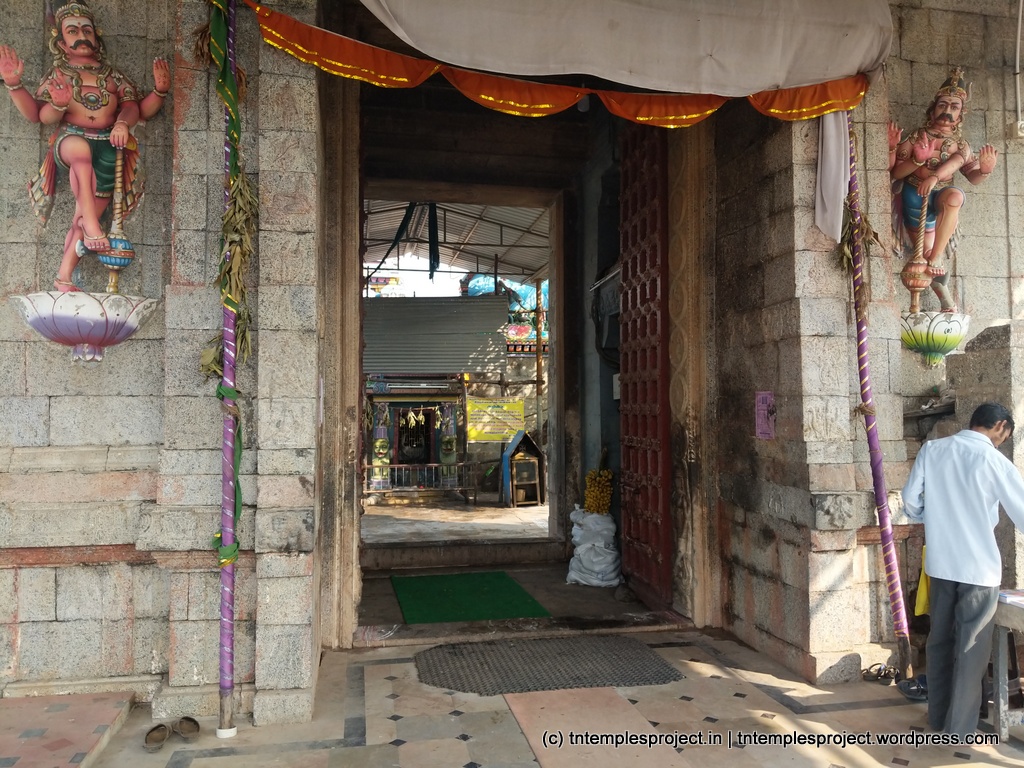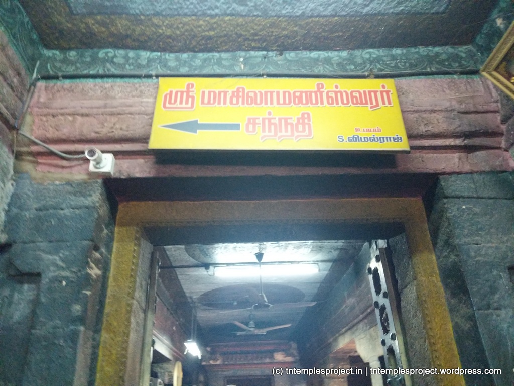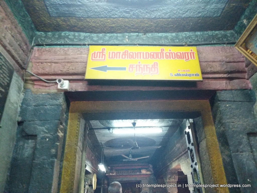 In olden times, Onan and Vaanan of the Kurumbar tribe occupied this region, and harassed the people. King Tondaiman wanted to end this, and after many attempts, waged war against them. As the army marched towards this place, they encountered a dense mullai forest. The king’s elephant got trapped in the vines, and the army started hacking away at the growth in order to clear the path. As they did so, they noticed blood gushing out on the ground, and found a Lingam that was cut and bleeding. The king was distraught for being responsible for such a sin, and was able to inflict harm on himself, when Siva and Parvati arrived and stopped him. Siva then asked the king to build a temple at the spot, and promised that He Himself would stay there, cleansed of the wound, as Masilamani – a precious gem (mani) cleaned of (ila) stains (mas). He also promised that Nandi would be ordered to destroy the Kurumbars, and protect the temple.