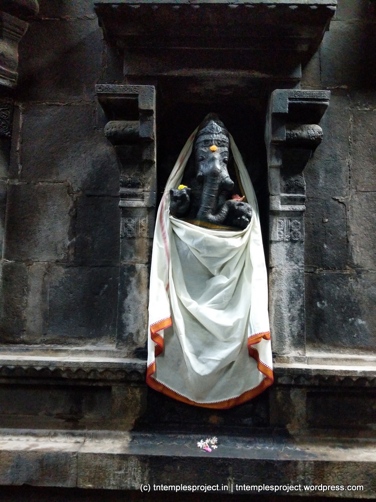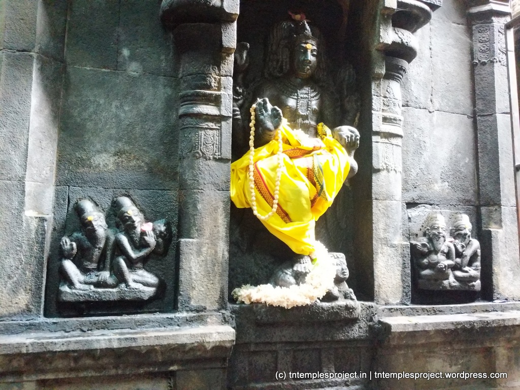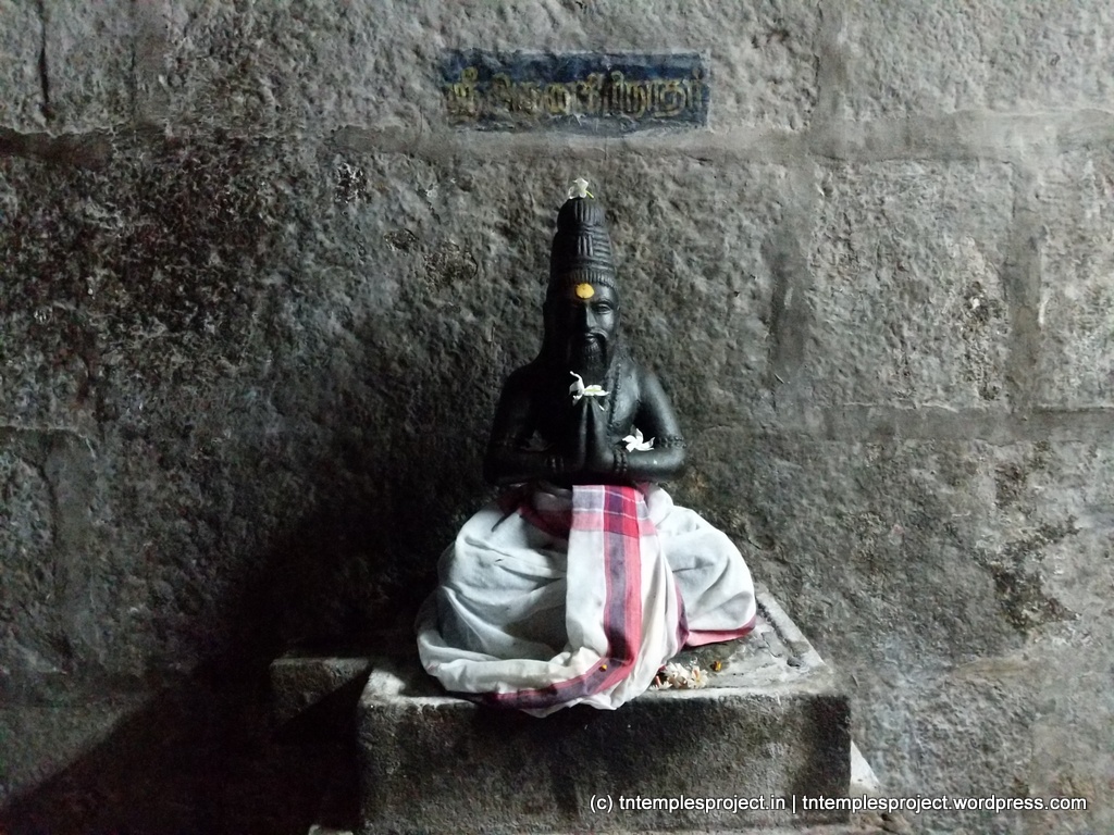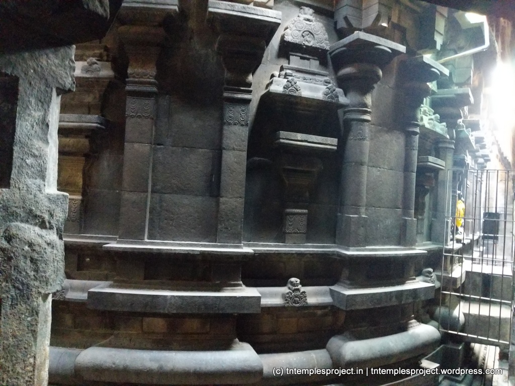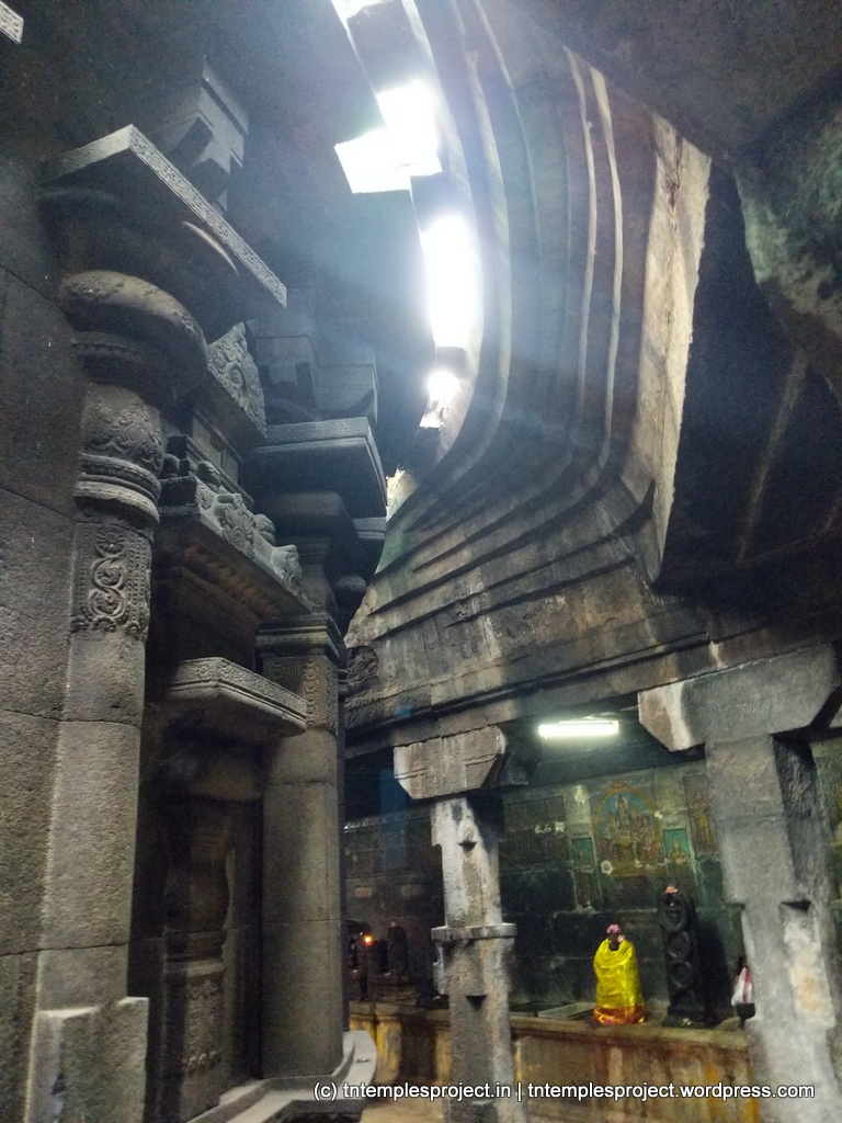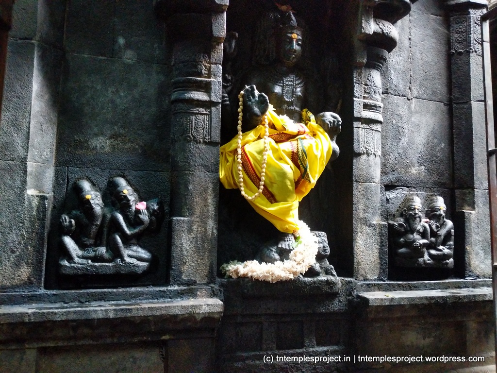 The architecture here is very reminiscent of Chola temples in the Thanjavur district. However, something prevalent more in Tondai Nadu temples than elsewhere in Tamil Nadu (maybe because it is typical of the Pallava style), is the gaja-prishtha (apsidial) vimanam, where the garbhagriham itself and the vimanam over it, are shaped in a semi-circular fashion, much like the back (prishtha) of an elephant (gaja). The pillars on either side of the entrance to the garbhagriham are each made of a single piece of wood from the vellerukku tree. These are said to be spoils of the king’s victory over the Kurumbars.
