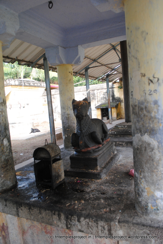 A Chola king and his entourage arrived at this place to take a bath in the sea, located close by. Unfortunately, the place was surrounded by a forest of mullai plants (a type of jasmine), making moving around difficult – so much that the king’s horse got its legs tangled in the plants. To release it, the king started cutting the offending plants with his sword, when he hit something hard, and blood started oozing out. The shocked king ordered his team to dig the place, and found a swayambhu Siva Lingam that was freshly bleeding. Saddened by the events, the king attempted to take his own life, when Siva and Parvati appeared on Rishabha Vahanam, and stopped the king. They then blessed him, after which the king ordered a temple to be built here, installing the Lingam that was struck by him (even today, the 3.5 foot tall Siva Lingam sports a scar, regarded as being from the king’s sword). A version of this puranam suggests that the Chola king in question was Killi Valavan (as above).