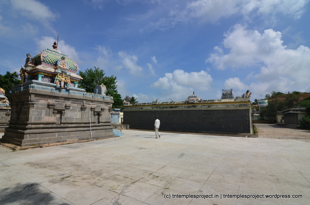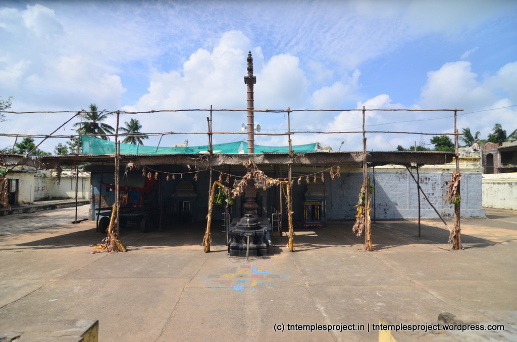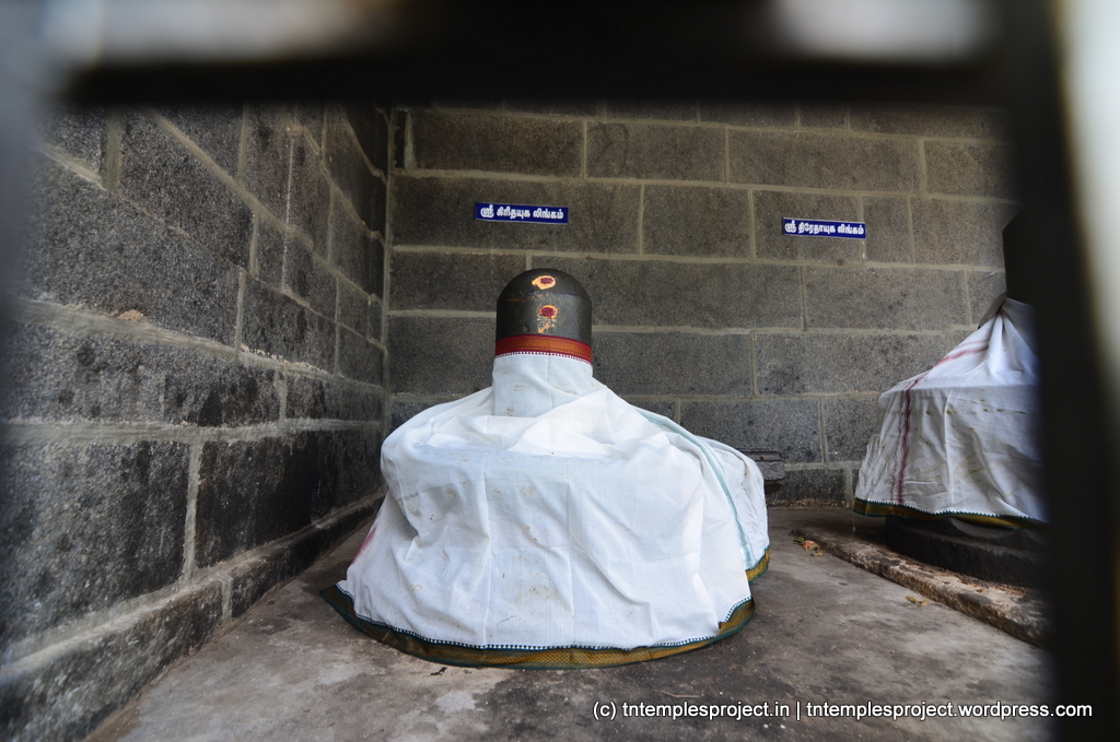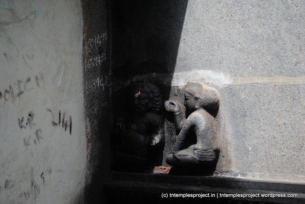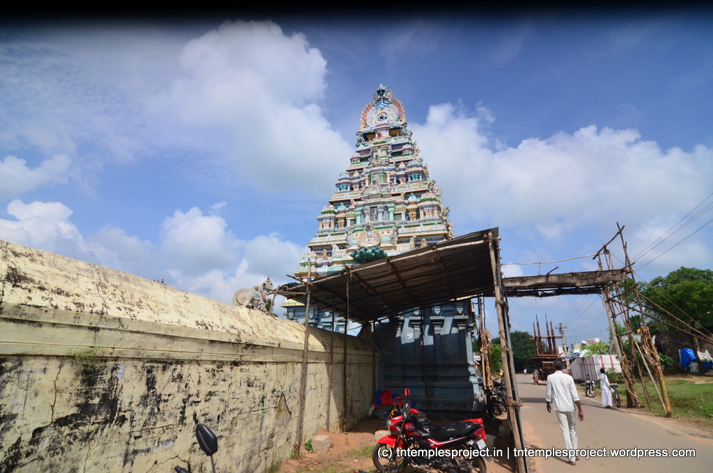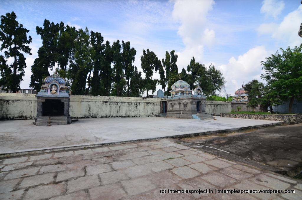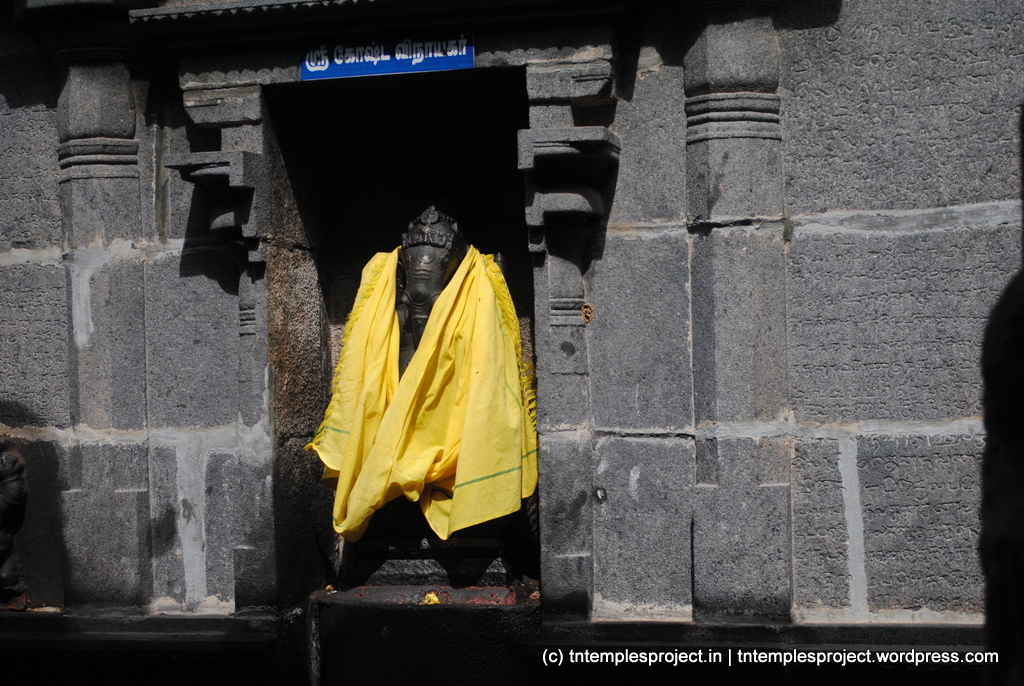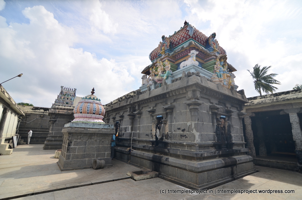 The core temple is ancient and regarded as having been built in the time of Trishanku and Harischandra. Since Sambandar sang a pathigam at this temple, the temple is certainly over 1400 years old. The architecture of the structural temple is medieval Chola, evidenced by the granite and stone building as well as the sculptures and iconography in the temple. Interesting iconography here includes Dinka, the rodent vehicle of Vinayakar, present to his master’s side, as well as the absence of mahisha the bull, under Durga. There are also several inscriptions on the outer wall of the garbhagriham, and elsewhere inside the temple.