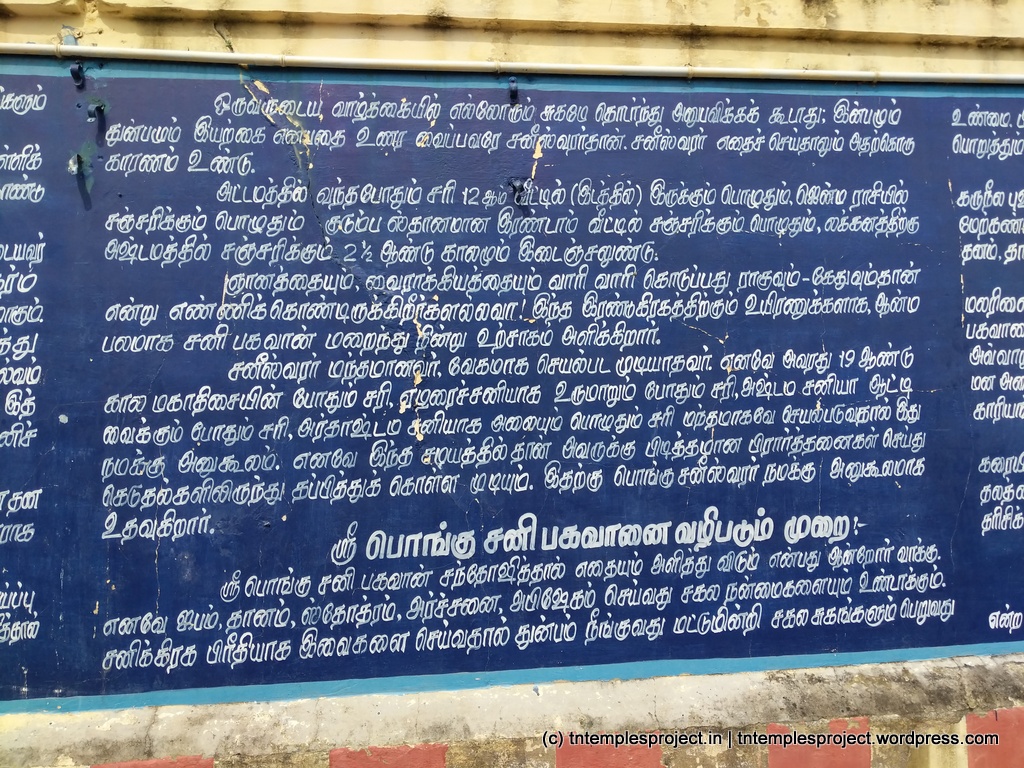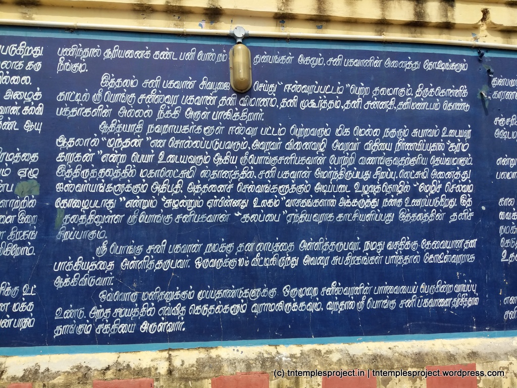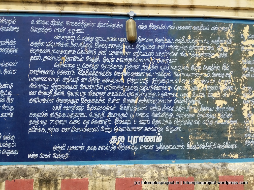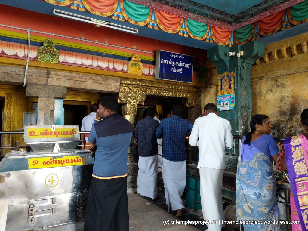 In the Hindu faith, there is the concept of 7½ years of Sani, four times in one’s life. It is regarded that during this time, Sani has a malefic effect on people (it is said that even Vinayakar’s original human head was lost due to Sani’s effects). Sani was terribly unhappy about this, as he felt that what happened to people was the result of their karma, and not because of him as such. After receiving advise from Sage Vasishta, Sani undertook penance by worshipping Siva at Keeralathur (the ancient name of this place). Siva appeared in the form of fire or agni, and blessed Sani to be prosperous and to have a positive influence on people. Sani here is named Pongu Sani (prosperous Sani).