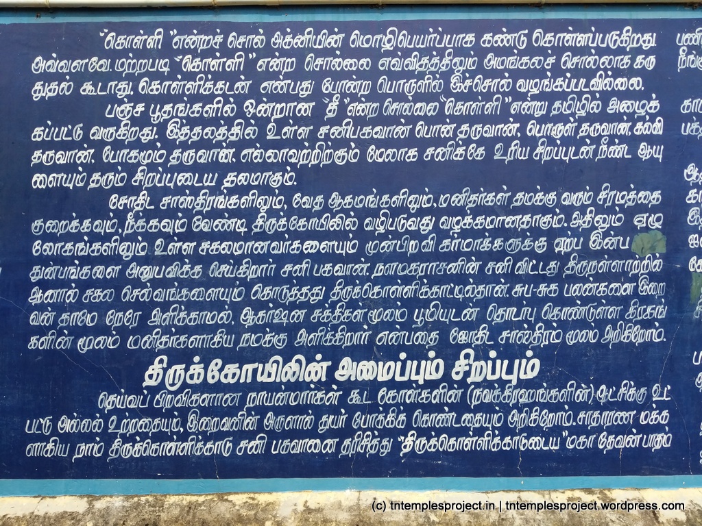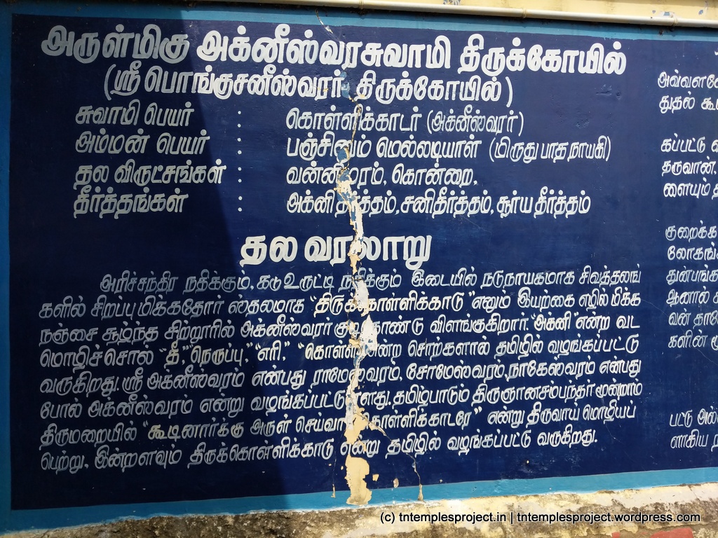 We visited this temple on a Saturday, around 12.30 pm, in late-December. While the nearby towns were relatively pleasant in terms of weather, Tirukollikadu alone felt excessively hot – a reminder of Siva as Agneeswarar. We also feared the crowds, it being a Saturday. However, there was virtually nobody at the main garbhagriham, since the crowds were milling around the Sani shrine. Even that was only for a few minutes. This being a rather small temple, our entire visit took no more than 30 minutes, and was leisurely and comprehensive.
