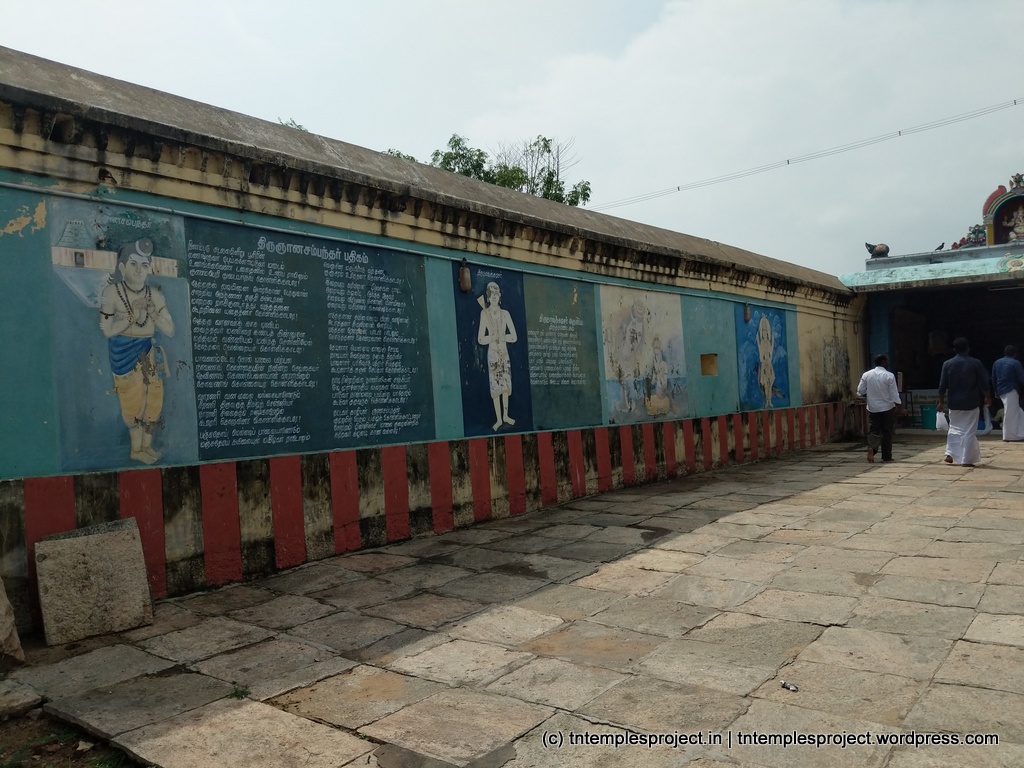 Sani is depicted as an anugraha murti, and has a separate shrine. Similar to Tirunallaru, devotees visit this temple more for Sani than for Siva! In fact, this temple is considered more powerful than Tirunallaru with respect to Sani, as this is a west-facing temple. What makes the Sani shrine – which faces east – even more special, is that it is situated adjacent to the Mahalakshmi shrine, which itself is quite unusual, but also because Sani is benevolent and giving, here. Because Sani is important at this temple, that shrine has a separate vimanam as well. The entire sthala puranam (or at least one of them) is painted on the inside of the northern wall, abutting the Sani shrine. Another unique aspect about this temple is that the Navagrahams – which normally do not face one another – are set in a three-sided open-square arrangement, facing inwards – and therefore, each other.