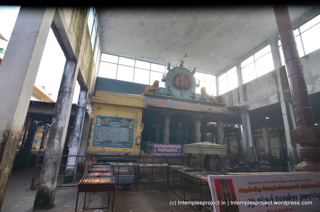 Suryan is in the garbhagriham as the chief amongst the Navagrahams. However, unlike the Navagraham shrines in other temples, each of the other 8 Navagraham deities are also present here, in separate shrines – this is possibly the only temple in Tamil Nadu with such a layout. Their layout is also quite different here, as is the procedure to worship them. Suryan is present with his consorts Usha and Prayusha (Chaya), and all the Navagraham are present as anugraha murtis, without any weapons or their vehicles.