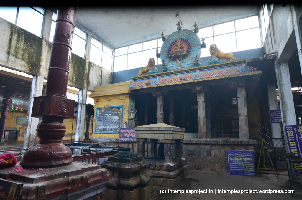 Of the Navagrahams, Suryan is regarded as the most important, and therefore also gets precedence in order of worship. Therefore, this is regarded as the first of the Kumbakonam Navagraham temples. Though this is most famous as a temple for Suryan, it should be noted that all the temples associated with the Navagraham are typically either Siva or Perumal temples, and this one is no exception – this is also a Siva temple, and in fact, a Tevaram Vaippu Sthalam. Siva here is worshipped as Viswanathar, with His consort Visalakshi Amman. However, the pride of place here goes to Suryan (or Suryanar, also sometimes referred to as Siva Surya Peruman), who is the presiding deity. This is further reinforced by Suryan’s horse being present after the balipeetham (where one would normally find Nandi, in a Siva temple).