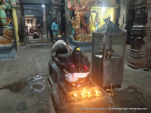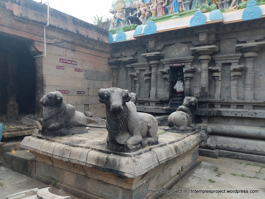 Legend has it that the four Vedas appeared as four Nandis in the shrine of Lord Brahma in the koshtam. There is no separate Navagraham shrine at this temple. Instead, there are three pits in the garbhagriham which are considered the Navagraham.