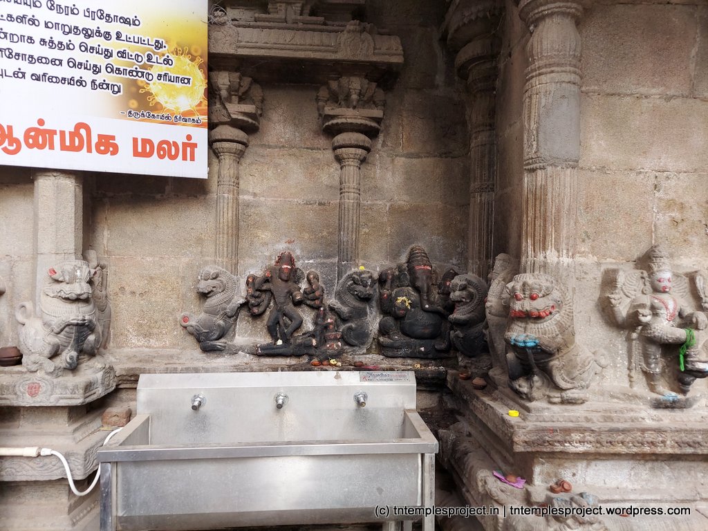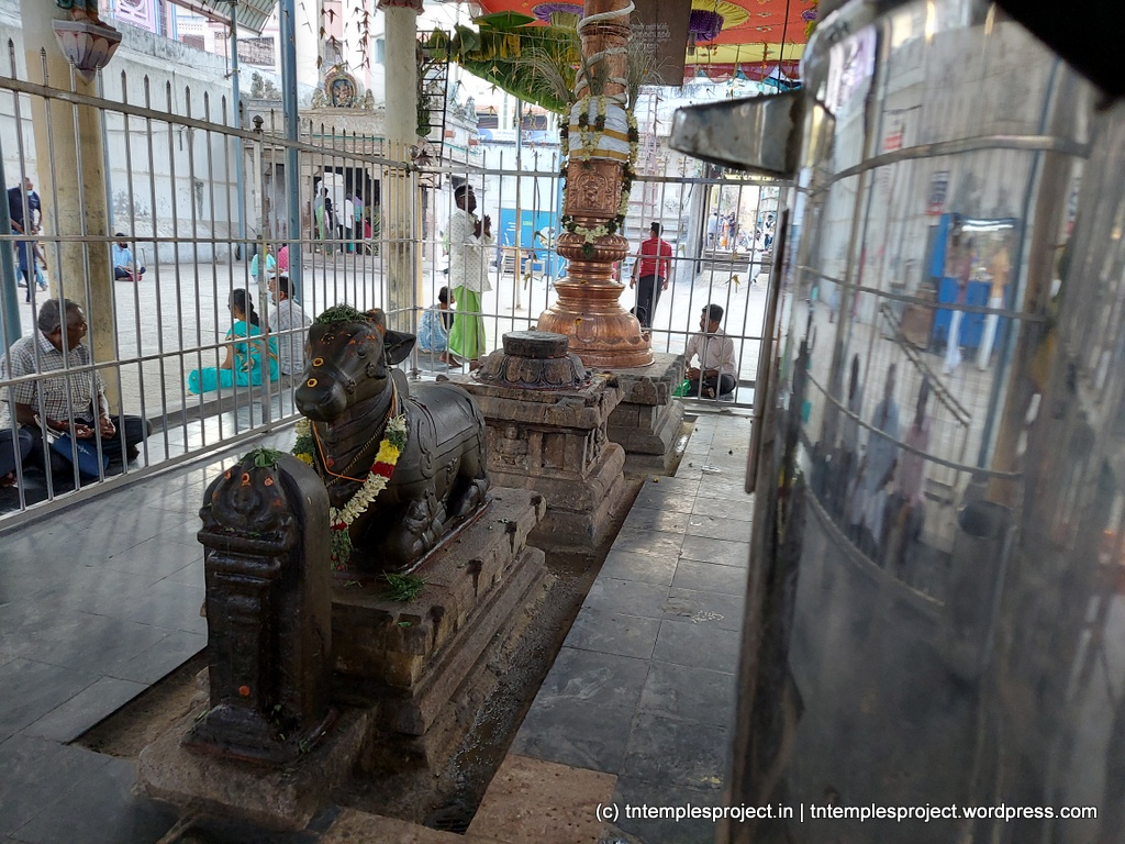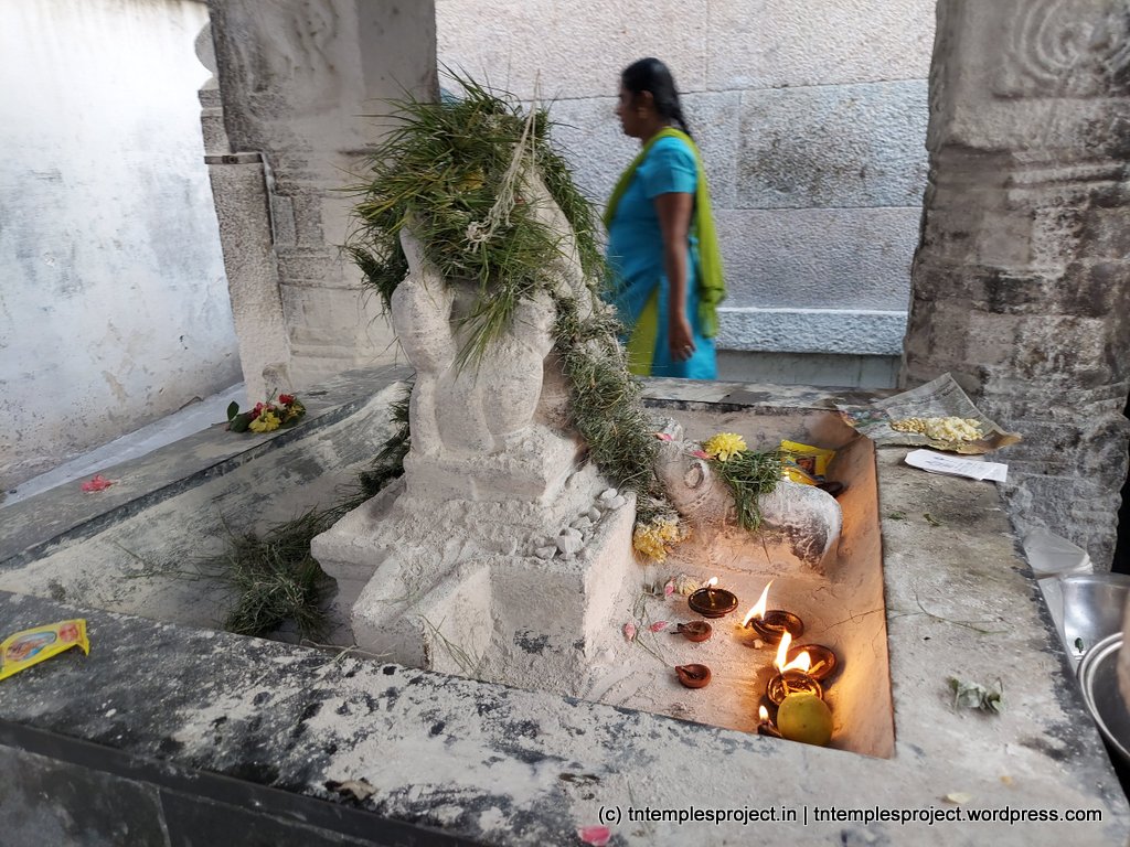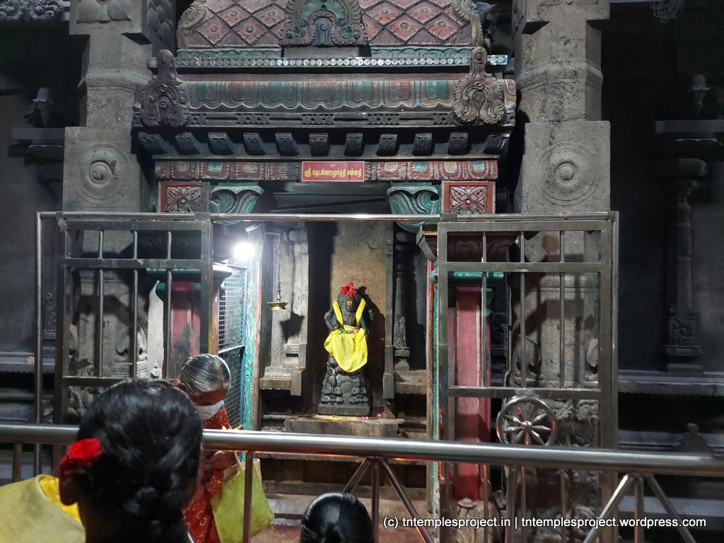 Typically, in Siva temples, Chandikeswarar does not receive special worship. However, at this temple, Chandikeswarar is said to recommend to Siva, the desires of devotees (and so is named Parinthuraikkum Nathar – the one who speaks favourably for devotees). So, he is worshipped specifically, by adorning him with the same garland that is placed around the Siva Lingam.