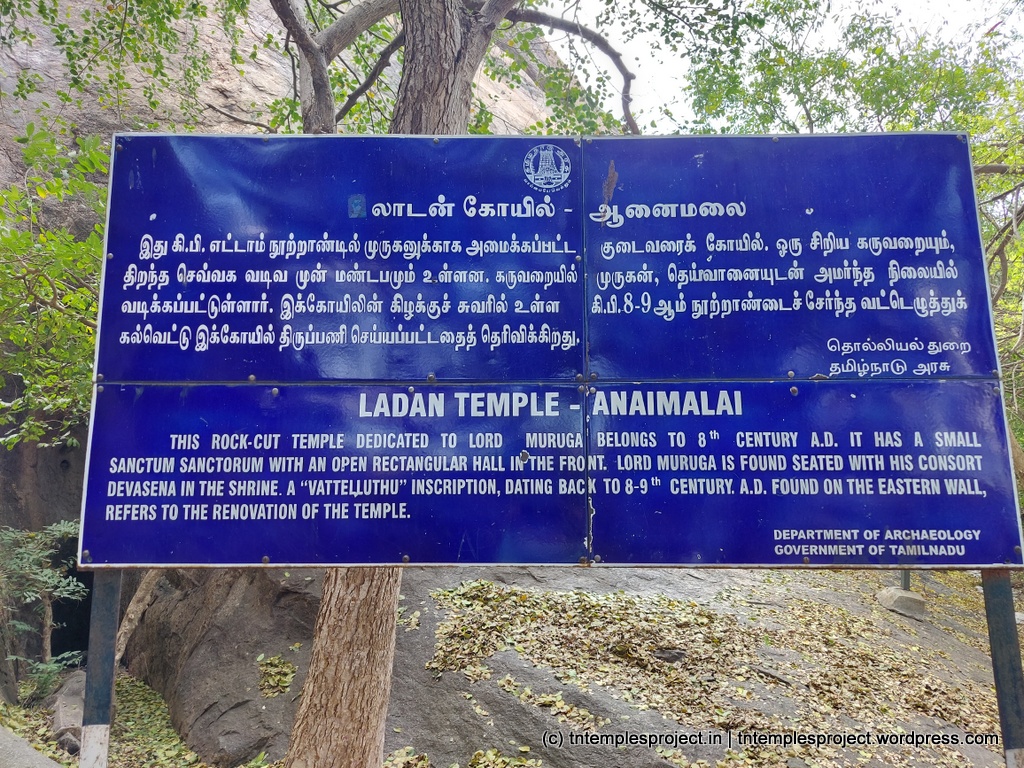 Locally known as the Ladan Koil, this is a cave-temple shrine for Murugan and Devasena, carved into the western face of the Anaimalai hills at Narasingam, near Othakadai, Madurai. The temple / shrine is located very close to the Yoga Narasimhar temple in Narasingam, and can be accessed via a path to the south, from the small mandapam outside the Narasimhar temple.