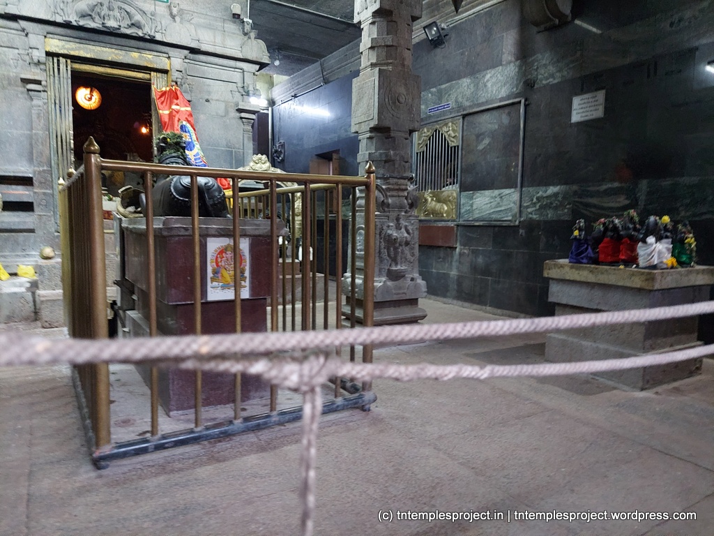 Idaikkar Siddhar, a close friend of sage Kapilar, visited Madurai which was then ruled by the Pandya king Kuchela Pandyan, himself a scholar. Idaikkar visited the king and paid tribute to him through verse. But instead of satisfaction, the king felt slighted and jealous, at the fact that Idaikkar came across as more erudite and scholarly. The upset king left immediately and went to Sundareswarar (the main temple at Madurai) and complained to the Lord. The king said, he didn’t know if Idaikkar’s immodesty was an affront to the king or the Lord Himself. After the king left, Siva, together with Parvati, quietly left the temple, and settled at this place, which is located to the north of the main temple. Then, through a celestial voice, the Lord informed Idaikkar that He would teach the king a lesson. When the priests assembled the following morning, they found the moolavar Lingam of Sundareswarar, missing. The bewildered king heard a celestial voice that his (the king’s) insult of Idaikkar was the reason for the deitites’ departure from the temple, and had settled in the Lingam at Vada Aalavaai. The king begged for mercy but was told that this Sokkanathar was even more special since Kubera had worshipped here.
