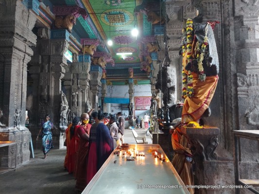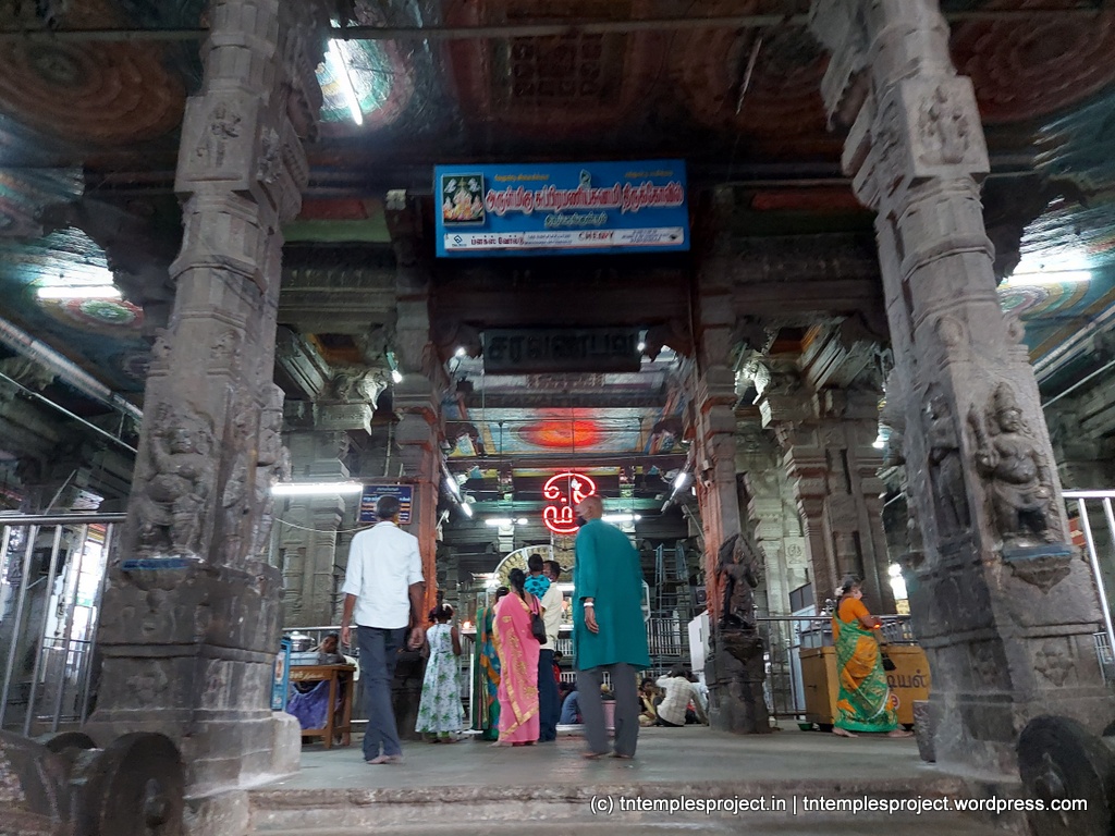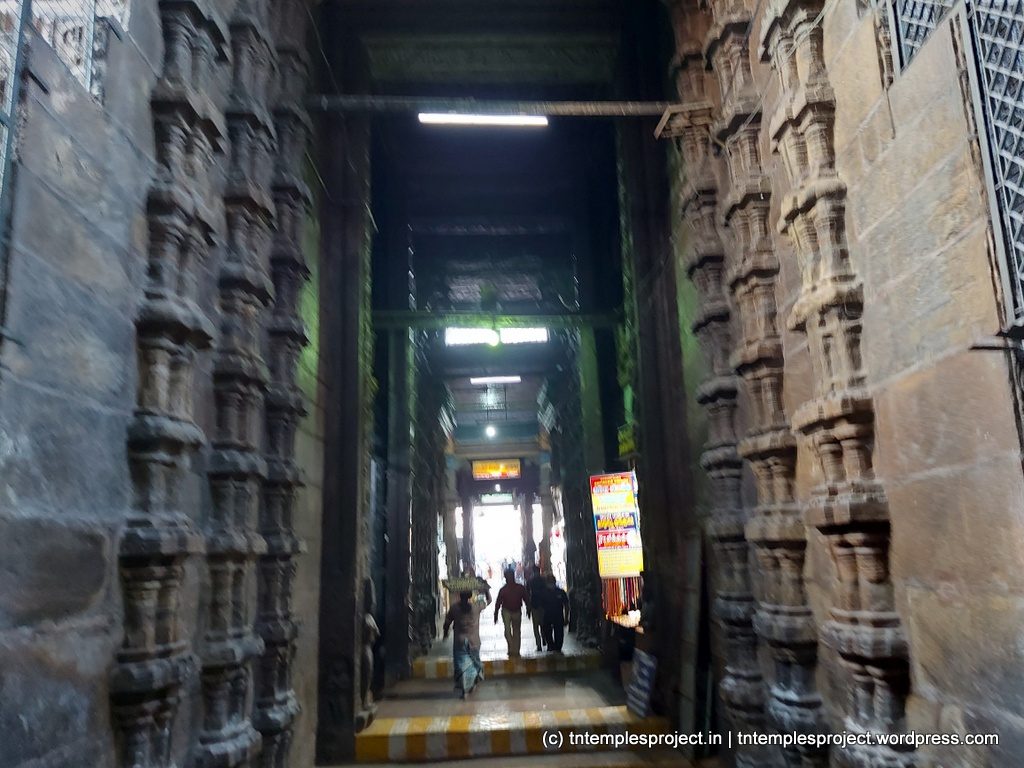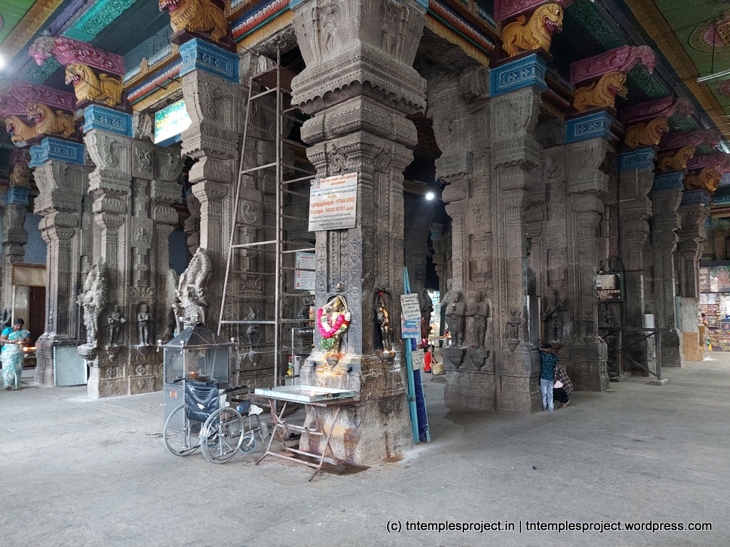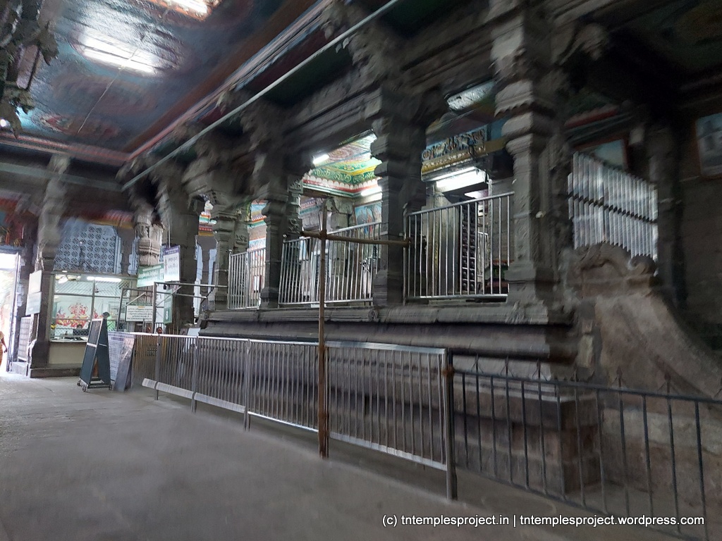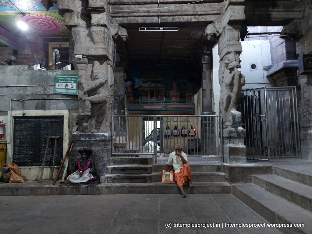 On the street opposite the main entrance to the temple, and just before the 16-pillared mandapam (which one can see coming from Madurai, is the Sokkanathar temple. Many people miss this temple as it is not very well known. However, it is connected to the main Satya Gireeswarar temple’s history, and has some excellent architecture and idols carved in stone.