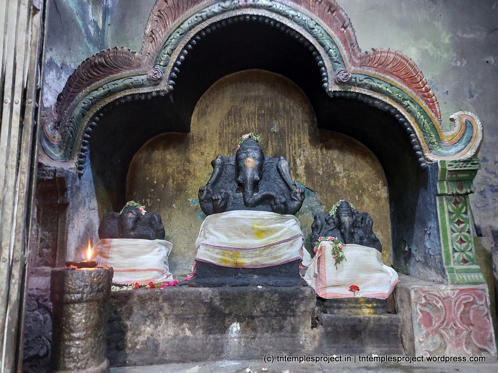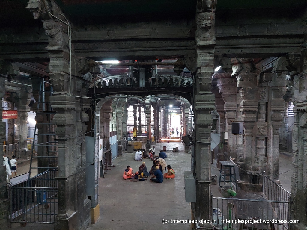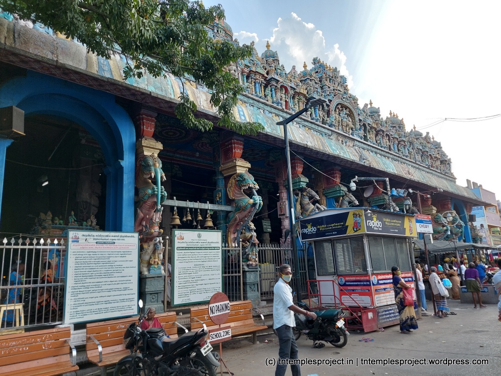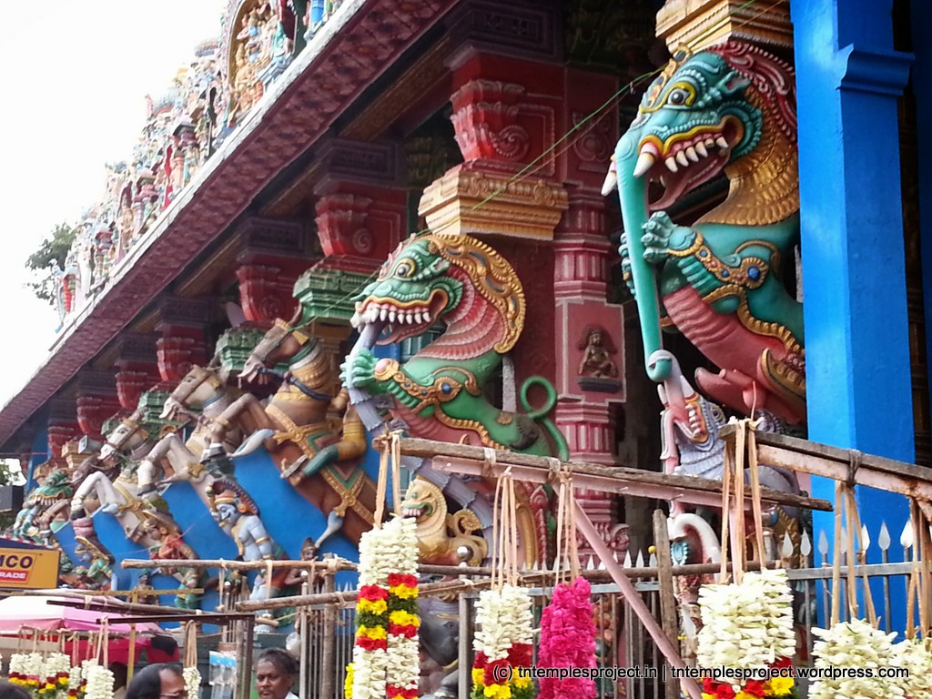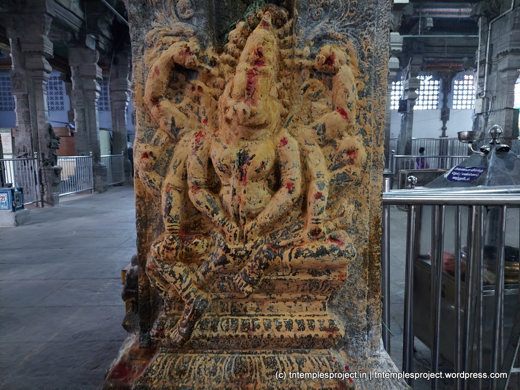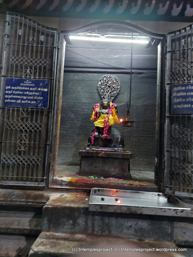 On the street opposite the main entrance to the temple, and just before the 16-pillared mandapam (which one can see coming from Madurai, is the Sokkanathar temple. Many people miss this temple as it is not very well known. However, it is connected to the main Satya Gireeswarar temple’s history, and has some excellent architecture and idols carved in stone.