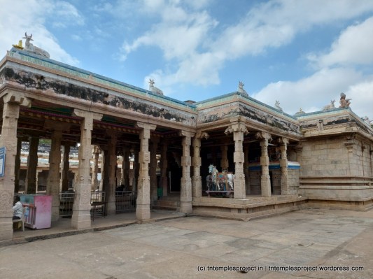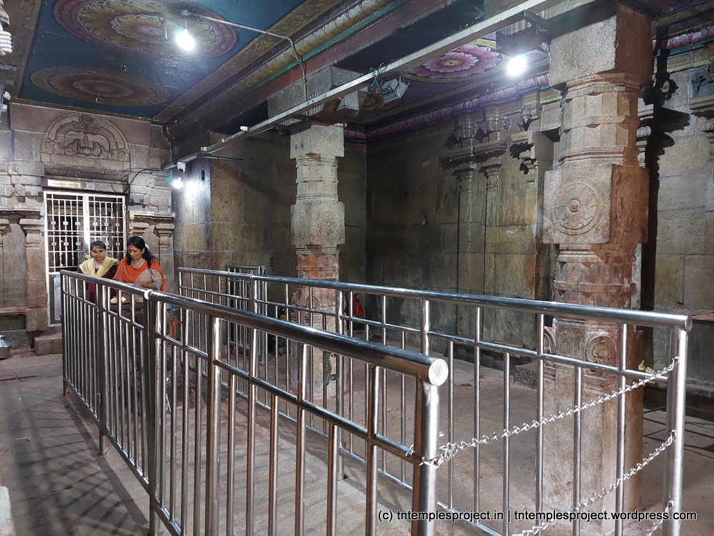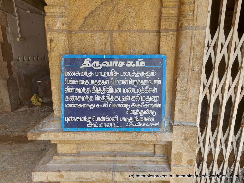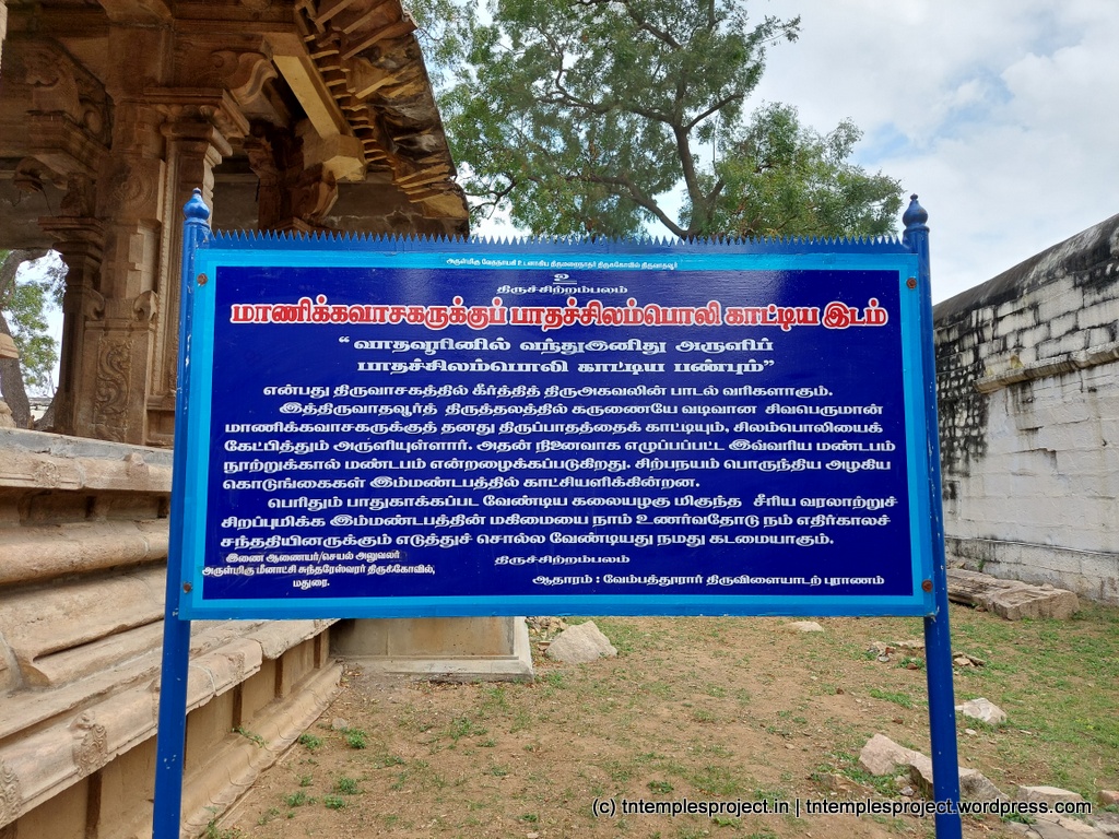 கோயிலுக்குள் நுழைந்தவுடன் வலதுபுறத்தில், சிவன் மாணிக்கவாசகருக்கு தனது புனித பாதங்களைக் காட்சிப்படுத்தினார், மேலும் விஷ்ணு செய்தது போல் தனது கணுக்கால்களிலிருந்து வெளிப்படும் அதே ஒலிகளைக் கேட்கும்படி செய்தார். இந்த மண்டபம் – 100 தூண் மண்டபம் என்று அழைக்கப்படுகிறது – மாணிக்கவாசகர் காலத்தில் கட்டப்பட்டது (சில கணக்குகளின்படி, துறவியால் இருக்கலாம்).