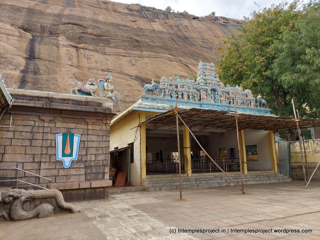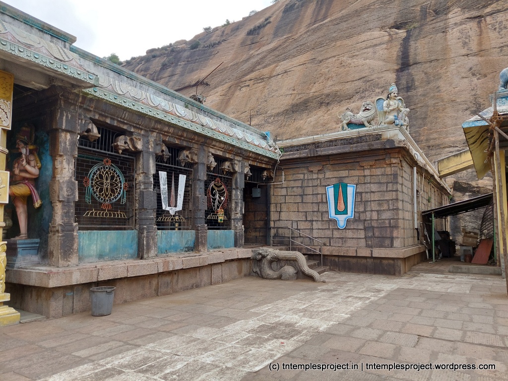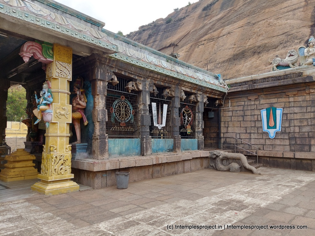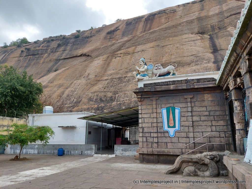 பாறைக் கோயிலாக இருப்பதால், கர்ப்பகிரஹத்தின் பின்புறச் சுவர் மலையே என்பதால், கோயிலையோ, இறைவனையோ பிரதக்ஷிணம் செய்ய முடியாது. கோயிலில் த்வஜஸ்தம்பம் (கொடிமரம்) இல்லை. பொதுவாக த்வஜஸ்தம்பத்தின் உயரம் கர்ப்பகிரஹத்தின் விமானத்தின் உயரம் மற்றும் அகலத்தின் அடிப்படையில் அமைந்திருக்கும். இக்கோயிலில், யானைமலையே விமானம் என்பதால், துவஜஸ்தம்பம் நிறுவுவது சாத்தியமில்லை என்று கருதப்படுகிறது.